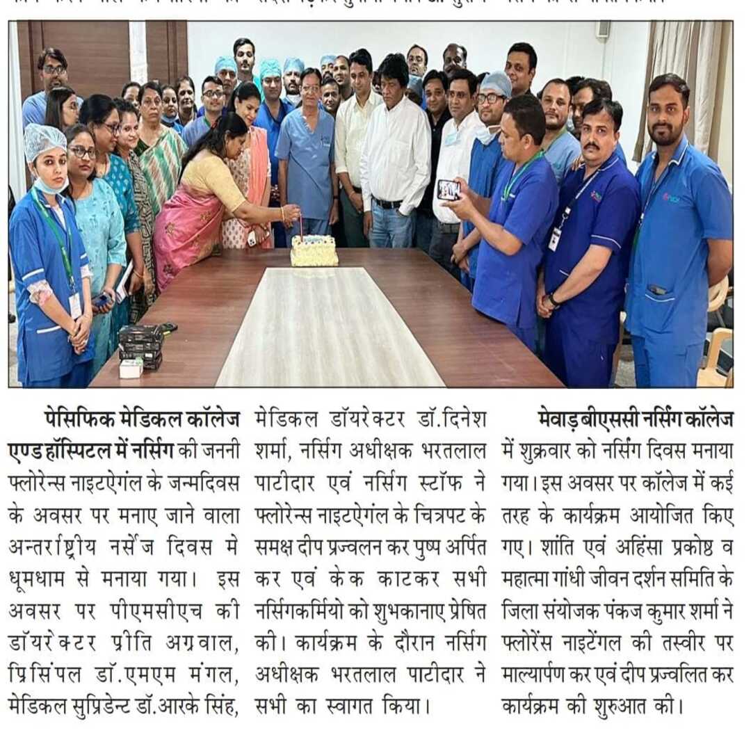 पेसिफिक मेडिकल काॅलेज एण्ड हाॅस्पिटल में नर्सिग की जननी फ्लोरेन्स नाइटऐगंल के जन्मदिवस के अवसर पर मनाए जाने वाला अन्तर्राष्ट्रीय नर्सेज दिवस मे धूमधाम से मनाया गया। इस अवसर पर पीएमसीएच की डाॅयरेक्टर प्रीति अग्रवाल, प्रिसिंपल डाॅ. एम.एम. मंगल, मेडिकल सुप्रिडेन्ट डाॅ. आर. के. सिंह, मेडिकल डाॅयरेक्टर डाॅ.दिनेश शर्मा, नर्सिग अधीक्षक भरतलाल पाटीदार एवं नर्सिग स्टाॅफ ने फ्लोरेन्स नाइटऐगंल के चित्रपट के समक्ष दीप प्रज्वलन कर पुष्प अर्पित कर एवं केक काटकर सभी नर्सिगकर्मियो को शुभकानाए प्रेषित की।