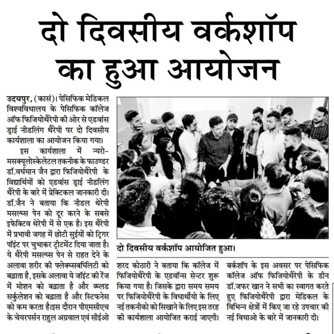 पेसिफिक मेडिकल विश्वविधालय के पेसिफिक कॉलेज ऑफ फिजियोथैरेपी की ओर से एडवांस ड्राई नीडलिंग थैरेपी पर दो दिवसीय कार्यशाला का आयोजन किया गया। इस कार्यशाला में न्यरो-मसक्यूलोस्केलेटल तकनीक के फाउण्डर डॉ.वर्धमान जैन द्वारा फिजियोथैरेपी के विद्यार्थियों को एडवांस ड्राई नीडलिंग थैरेपी के बारे में प्रेक्टिकल जानकारी दी। डॉ.जैन ने बताया कि नीडल थेरेपी मसल्स पेन को दूर करने के सबसे इफेक्टिव थेरेपी में से एक है। इस थैरेपी में प्रभावी जगह में छोटी सुईयों को ट्रिगर पॉइंट पर चुभाकर ट्रीटमेंट दिया जाता है। ये थैरेपी मसल्स पेन से राहत देने के अलावा शरीर की फ्लेक्सबििलटी को बढ़ाता है, इसके अलावा ये जॉइंट की रेंज में मोशन को बढ़ाता है और ब्लड सर्कुलेशन को बढ़ाता है और स्टिफनेस को कम करता है।