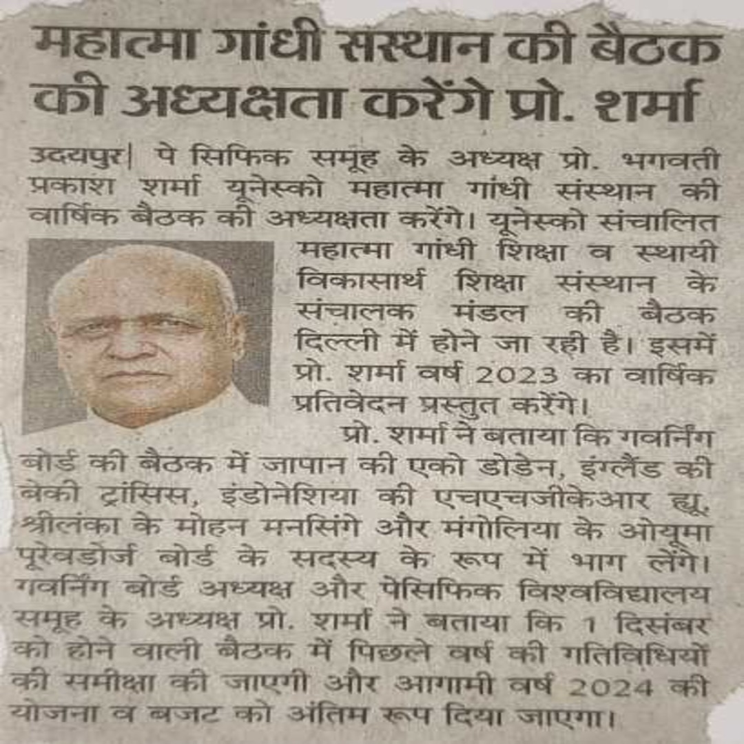 यूनेस्को संचालित महात्मा गांधी शिक्षा व स्थायी विकासार्थ शिक्षा संस्थान’’ के संचालक मण्डल की दिल्ली के इम्पीरियल होटल में आयोजित की जा रही ११वीं वार्षिक बैठक की अध्यक्षता, संस्थान के अध्यक्ष प्रोफेसर भगवती प्रकाश शर्मा करेंगे और वर्ष २०२३ का वार्षिकप्रतिवेदन पुस्तुत करेंगे प्रोफेसर शर्मा ने बतलाया कि गवर्निंग बोर्ड की इस बैठक में जापान की सश्री एको डोडेन इंग्लैण्ड की सुश्री बेकी ट्रांसिस इण्डोनेशिया की सुश्री एच.एच. जी.के.आर. ह्यू, श्रीलंका के मोहन मनसिंगे एवं मंगोलिया के ओयूमा पूरेवडोर्ज बोर्ड के सदस्य के रूप में भाग लेने आ रहे हैं। गवर्निंग बोर्ड अध्यक्ष एवं पेसिफिक विश्वविद्यालय समूह के अध्यक्ष प्रोफेसर भगवती प्रकाश शर्मा ने बताया कि यूनेस्को - महात्मा गांधी इंस्टीट्यूट ऑफ एजूकेषन फॉर पीस एण्ड सस्टेनेबल डेवलपमेण्ट के गवर्निंग बोर्ड में पदेन सदस्य के रूप में भारत सरकार के शिक्षा सचिव संजय के मूर्ति एवं नीपा की कुलपति शशिकला वंजारी भाग लेंगे।