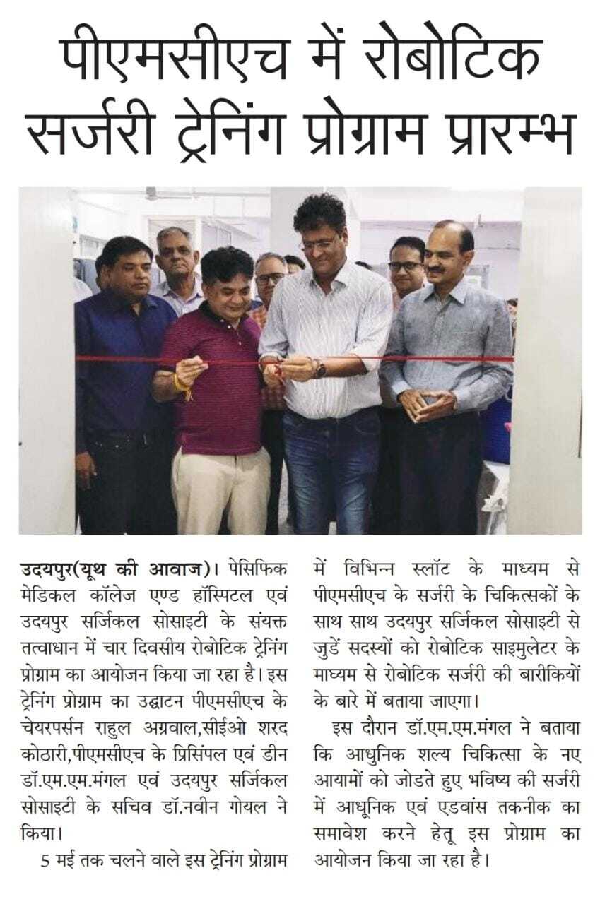 पेसिफिक मेडिकल काॅलेज एण्ड हाॅस्पिटल एवं उदयपुर सर्जिकल सोसाइटी के संयुक्त तत्वाधान में चार दिवसीय रोबोटिक ट्रेनिंग प्रोग्राम का आयोजन किया जा रहा है। इस ट्रेनिंग प्रोग्राम का उद्घाटन पीएमसीएच के चेयरपर्सन राहुल अग्रवाल,सीईओ शरद कोठारी,पीएमसीएच के प्रिसिंपल एवं डीन डाॅ.एम.एम.मंगल एवं उदयपुर सर्जिकल सोसाइटी के सचिव डाॅ.नवीन गोयल ने किया। पांच मई तक चलने वाले इस ट्रेनिंग प्रोग्राम में विभिन्न स्लाॅट के माध्यम से पीएमसीएच के सर्जरी के चिकित्सकों के साथ साथ उदयपुर सर्जिकल सोसाइटी से जुडें सदस्यों को रोबोटिक साइमुलेटर के माघ्यम से रोबोटिक सर्जरी की बारीकियों के बारे में बताया जाएगा। इस दौरान डाॅ.एम.एम.मंगल ने बताया कि आधुनिक शल्य चिकित्सा के नए आयामों को जोड़ते हुए भविष्य की सर्जरी में आधुनिक एवं एडवांस तकनीक का समावेश करने हेतु इस प्रोग्राम का आयोजन किया जा रहा है।