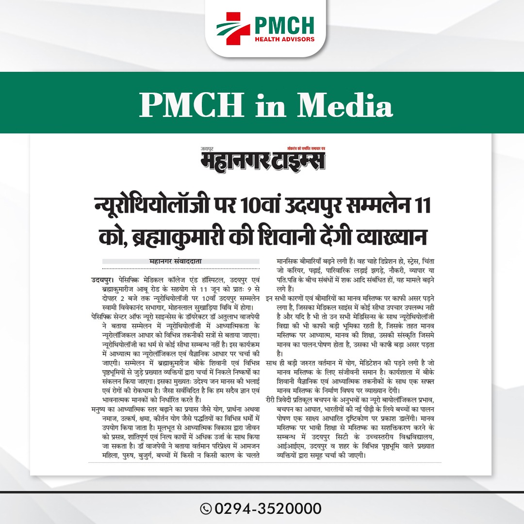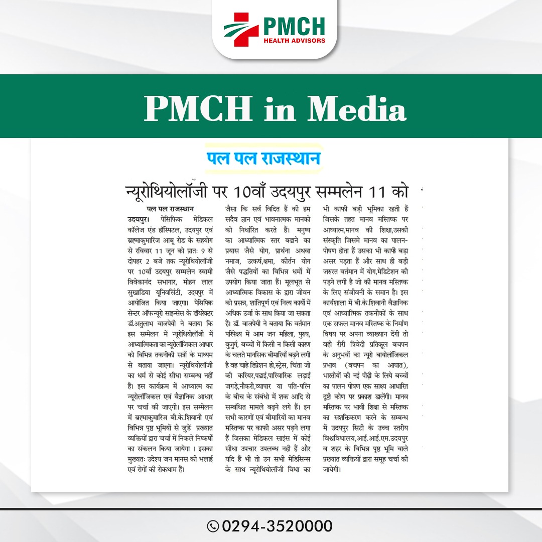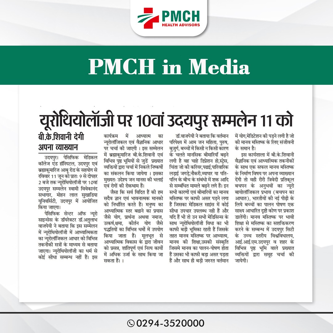 पैसिफिक मेडिकल अस्पताल में न्यूरोथियोलॉजी पर 10वां उदयपुर सम्मेलन पेसिफिक सेन्टर आफ न्यूरो साइन्सेस के डायरेक्टर डॉ. अतुलाभ वाजपेयी ने बताया कि इस सम्मेलन में न्यूरोथियोलॉजी में आध्यात्मिकता का न्यूरोलॉजिकल आधार को विभिन्न तकनीकी सत्रों के माध्यम से बताया जाएगा। न्यूरोथियोलॉजी का धर्म से कोई सीधा सम्बन्ध नहीं हैं। इस कार्यक्रम में आध्यात्म का न्यूरोलॉजिकल एवं वैज्ञानिक आधार पर चर्चा की जाएगी । इस सम्मेलन में ब्रह्माकुमारिज बी.के.शिवानी एवं विभिन्न पृष्ठ भूमियों से जुडें प्रख्यात व्यक्तियों द्वारा चर्चा में निकले निष्कर्षो का संकलन किया जायेगा ।