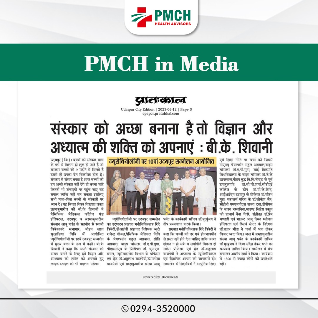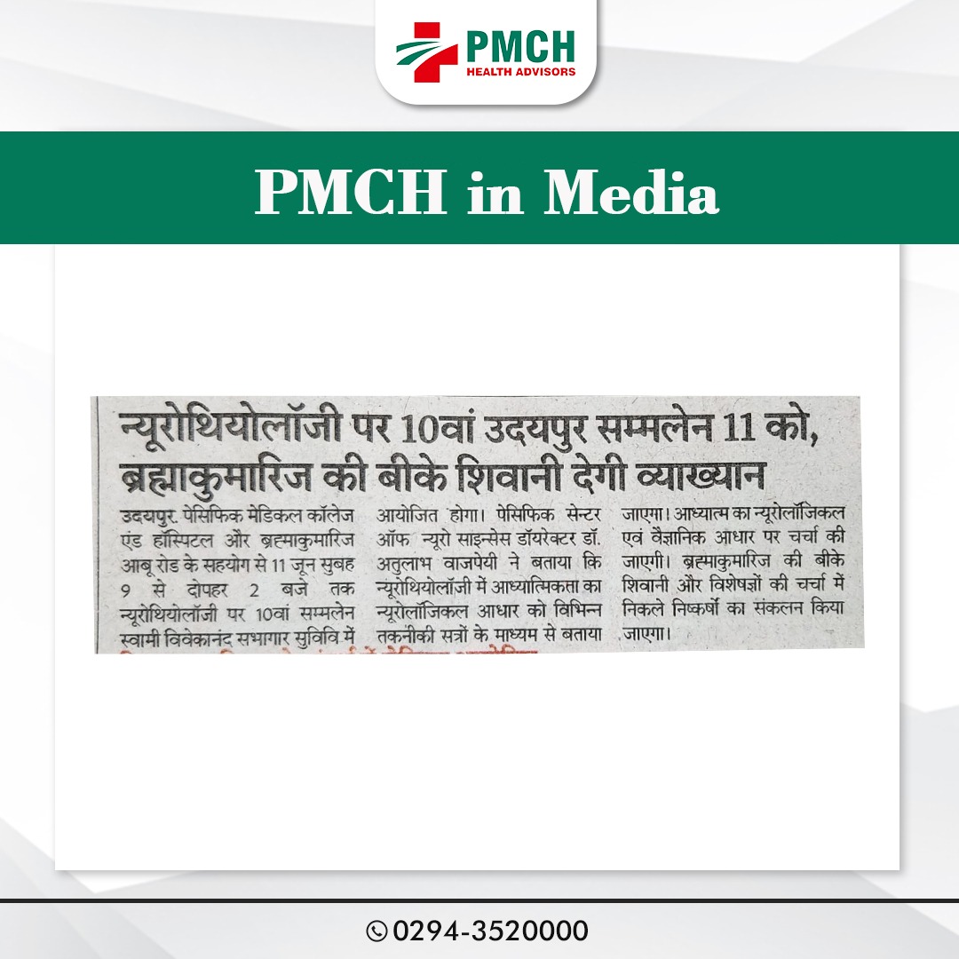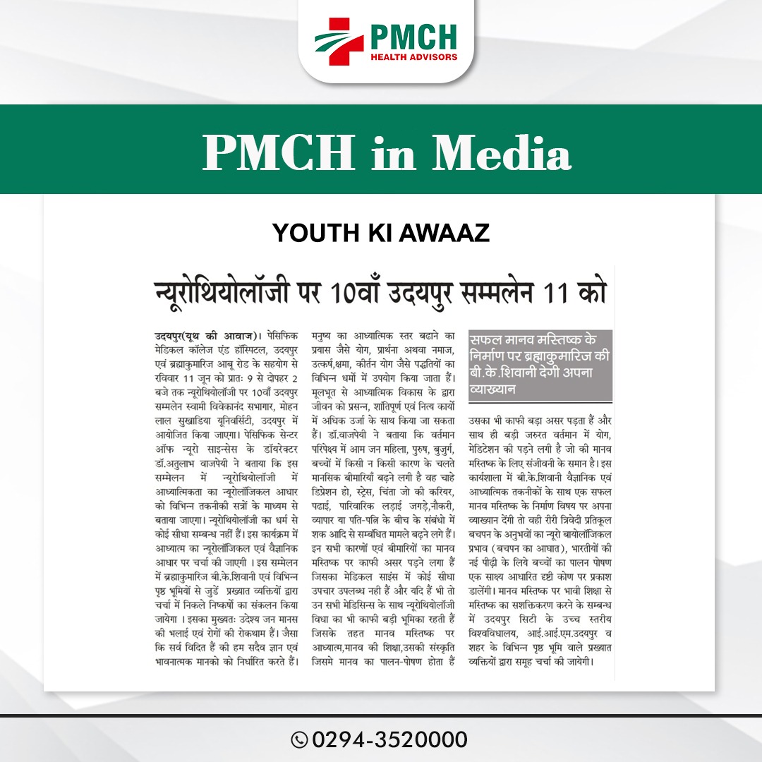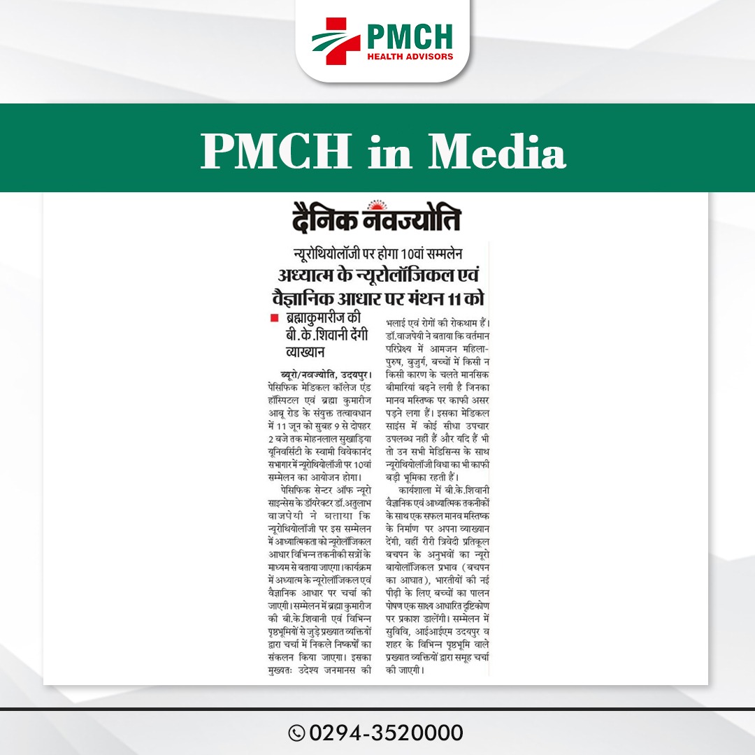 पैसिफिक मेडिकल अस्पताल में न्यूरोथियोलॉजी पर 10वां उदयपुर सम्मेलन पेसिफिक सेन्टर आफ न्यूरो साइन्सेस के डायरेक्टर डॉ. अतुलाभ वाजपेयी ने बताया कि इस सम्मेलन में न्यूरोथियोलॉजी में आध्यात्मिकता का न्यूरोलॉजिकल आधार को विभिन्न तकनीकी सत्रों के माध्यम से बताया जाएगा। न्यूरोथियोलॉजी का धर्म से कोई सीधा सम्बन्ध नहीं हैं। इस कार्यक्रम में आध्यात्म का न्यूरोलॉजिकल एवं वैज्ञानिक आधार पर चर्चा की जाएगी । इस सम्मेलन में ब्रह्माकुमारिज बी.के.शिवानी एवं विभिन्न पृष्ठ भूमियों से जुडें प्रख्यात व्यक्तियों द्वारा चर्चा में निकले निष्कर्षो का संकलन किया जायेगा ।