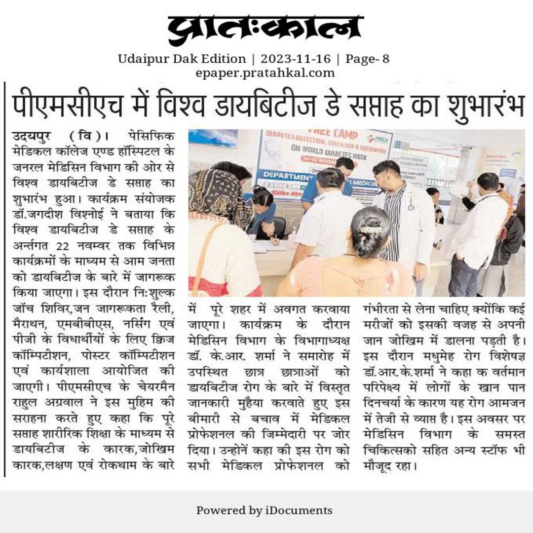 उदयपुर । मेडिकल कॉलेज एण्ड हॉस्पिटल के जनरल मेडिसिन विभाग की ओर से विश्व डायबिटीज डे सप्ताह का शुभारंभ हुआ। कार्यक्रम संयोजक डॉ. जगदीश विश्नोई ने बताया कि विश्व डायबिटीज डे सप्ताह के अर्न्तगत 22 नवम्बर तक विभिन्न कार्यक्रमों के माध्यम से आम जनता को डायबिटीज के बारे में जागरूक किया जाएगा। इस दौरान निःशुल्क जॉच शिविर, जन जागरूकता रैली मैराथन, एमबीबीएस, नर्सिंग एवं पीजी के विधार्थीयों के लिए क्विज कॉम्पिटीशन, पोस्टर कॉम्पिटीशन एवं कार्यशाला आयोजित की जाएगी। पीएमसीएच के चेयरमैन राहुल अग्रवाल ने इस मुहिम की सराहना करते हुए कहा कि पूरे सप्ताह शारीरिक शिक्षा के माध्यम से डायबिटीज के कारक, जोखिम कारक,लक्षण एवं रोकथाम के बारे में पूरे शहर में अवगत करवाया जाएगा। कार्यक्रम के दौरान मेडिसिन विभाग के विभागाध्यक्ष डॉ. के. आर. शर्मा ने समारोह में उपस्थित छात्र छात्राओं को डायबिटीज रोग के बारे में विस्तृत जानकारी मुहैया करवाते हुए इस बीमारी से बचाव में मेडिकल प्रोफेशनल की जिम्मेदारी पर जोर दिया।