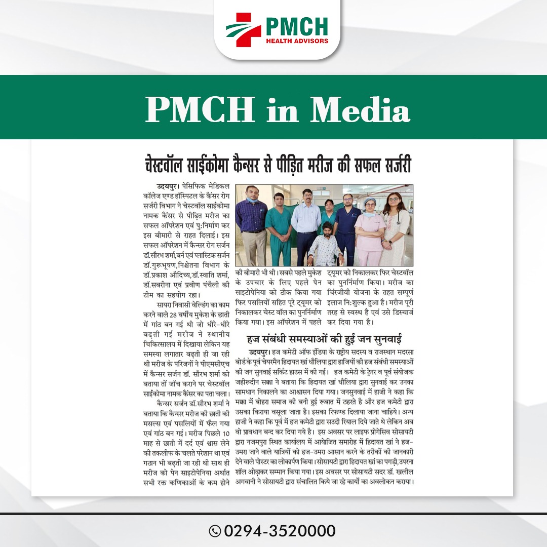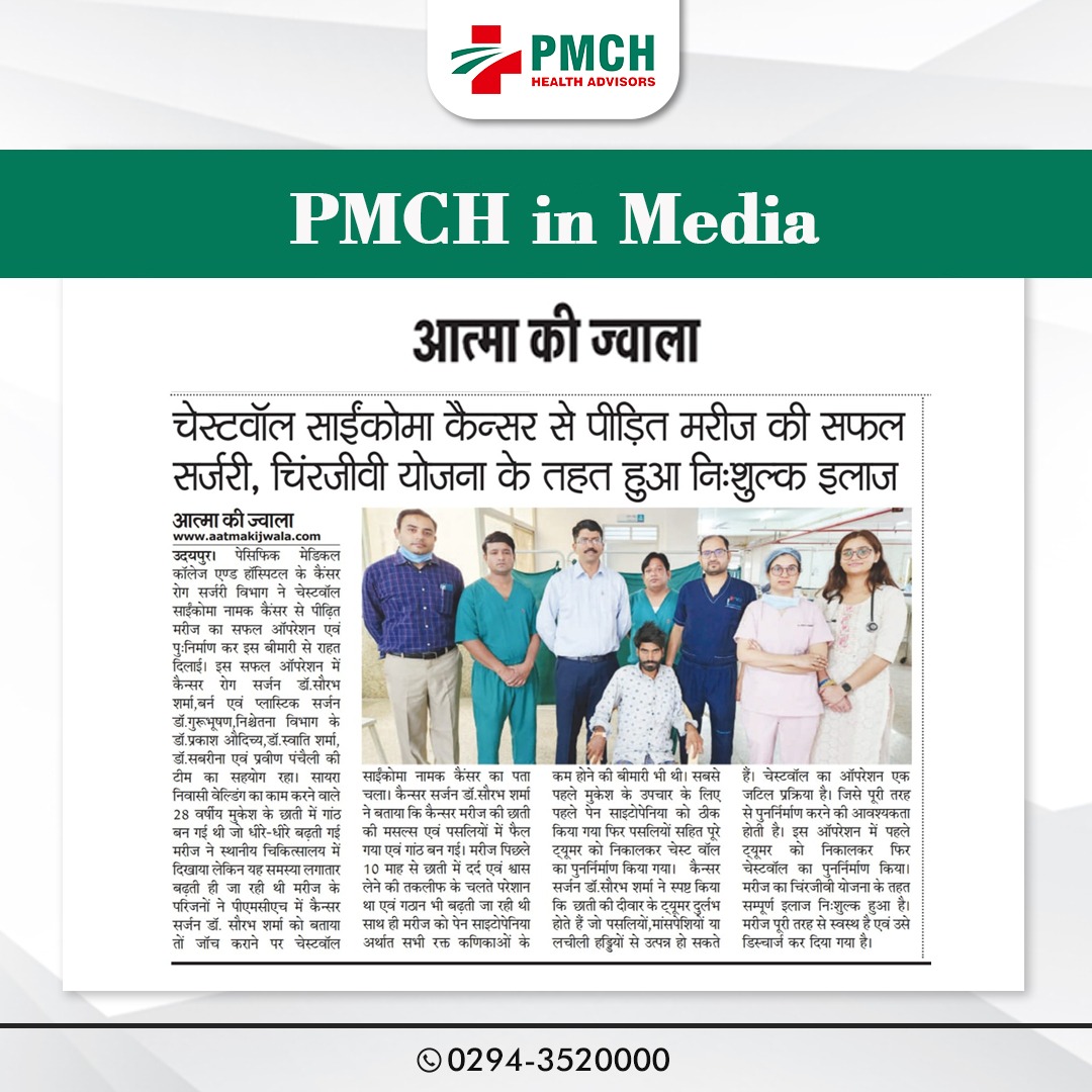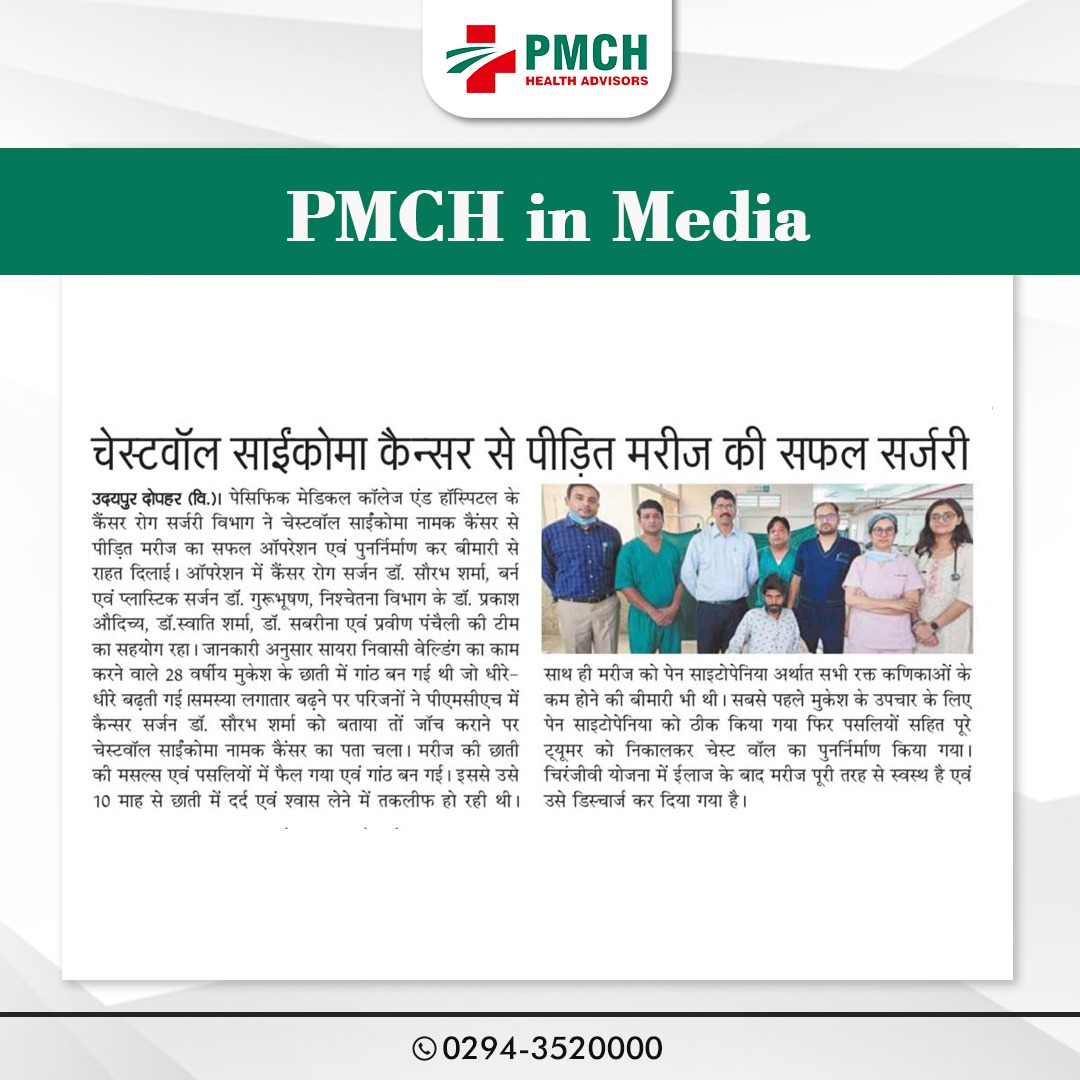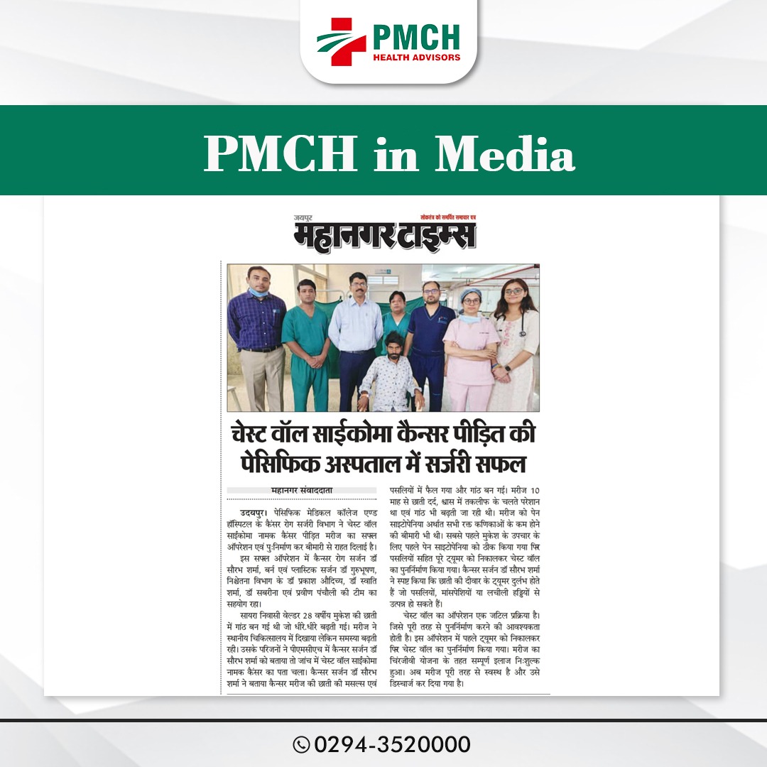 उदयपुर। पेसिफिक मेडिकल कॉलेज एण्ड हॉस्पिटल के कैंसर रोग सर्जरी विभाग ने चेस्टवॉल साईंकोमा नामक कैंसर से पीढ़ित मरीज का सफल आपरेशन एवं पुःनिर्माण कर इस बीमारी से राहत दिलाई। इस सफल आपरेशन में कैन्सर रोग सर्जन डॉ.सौरभ शर्मा,बर्न एवं प्लास्टिक सर्जन डा. गुरूभूषण, निश्चेतना विभाग के डा. प्रकाश औदिच्य, डा. स्वाति शर्मा, डॉ. सबरीना एवं प्रवीण पंचैली की टीम का सहयोग रहा। सायरा निवासी वेल्डिंग का काम करने वाले 28 वर्षीय मुकेश के छाती में गांठ बन गई थी जो धीरे-धीरे बढ़ती गई मरीज ने स्थानीय चिकित्सालय में दिखाया लेकिन यह समस्या लगातार बढ़ती ही जा रही थी मरीज के परिजनों ने पीएमसीएच में कैन्सर सर्जन डाॅ. सौरभ शर्मा को बताया तों जाॅच कराने पर चेस्टवॉल साईंकोमा नामक कैंसर का पता चला।