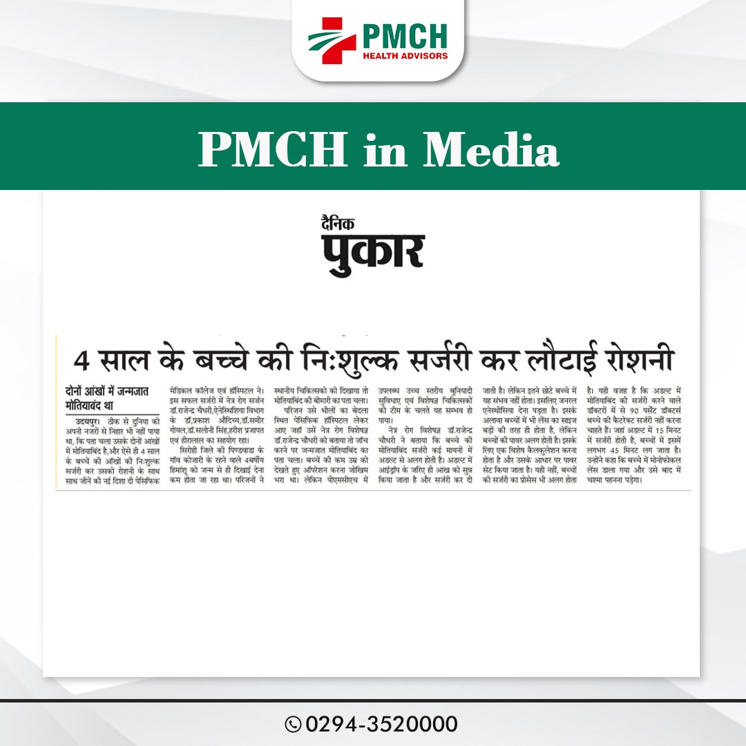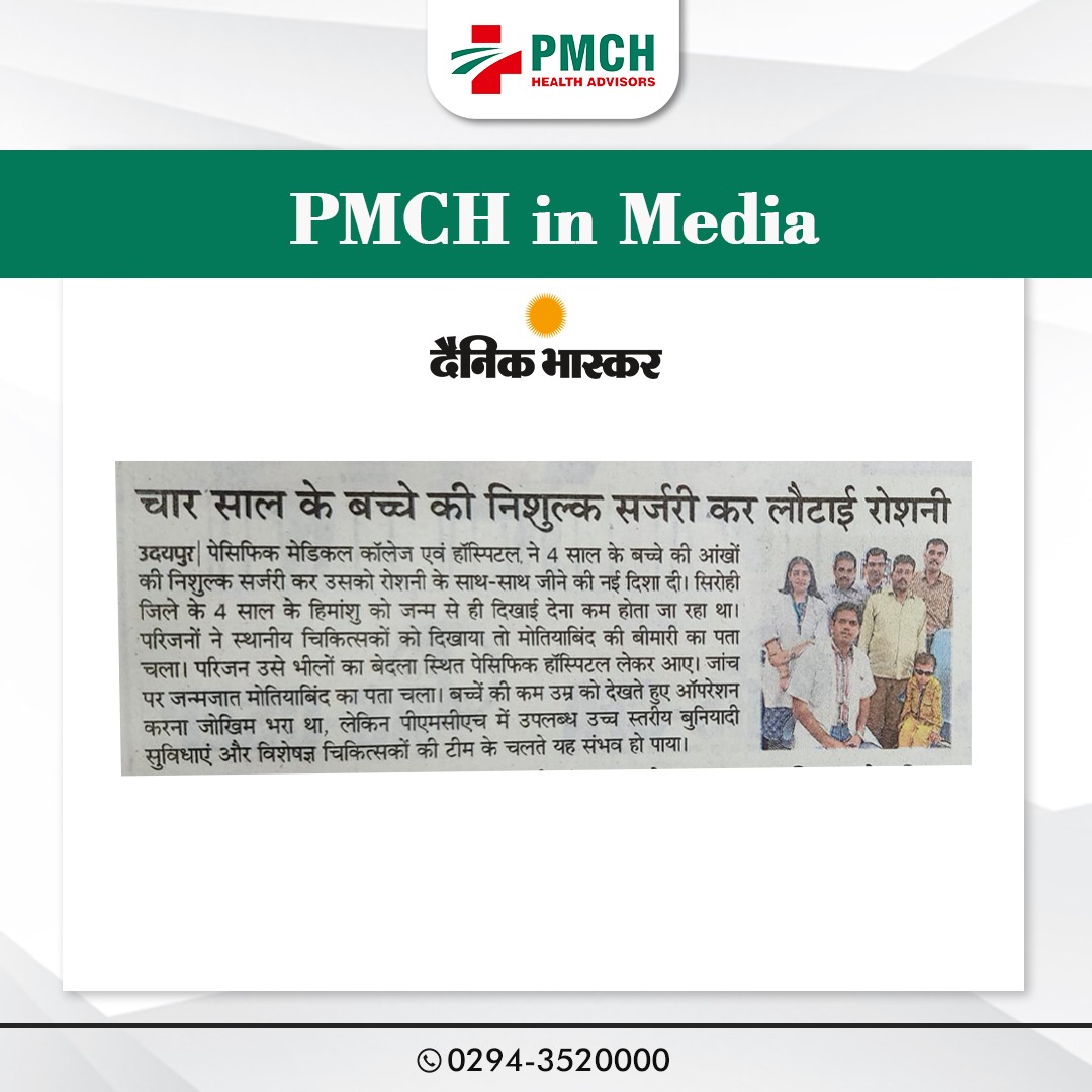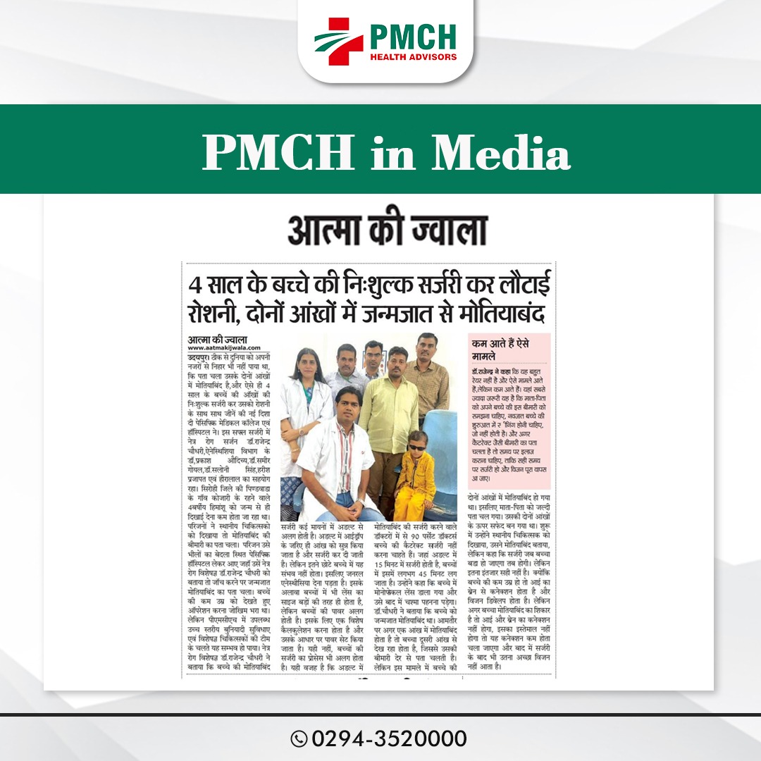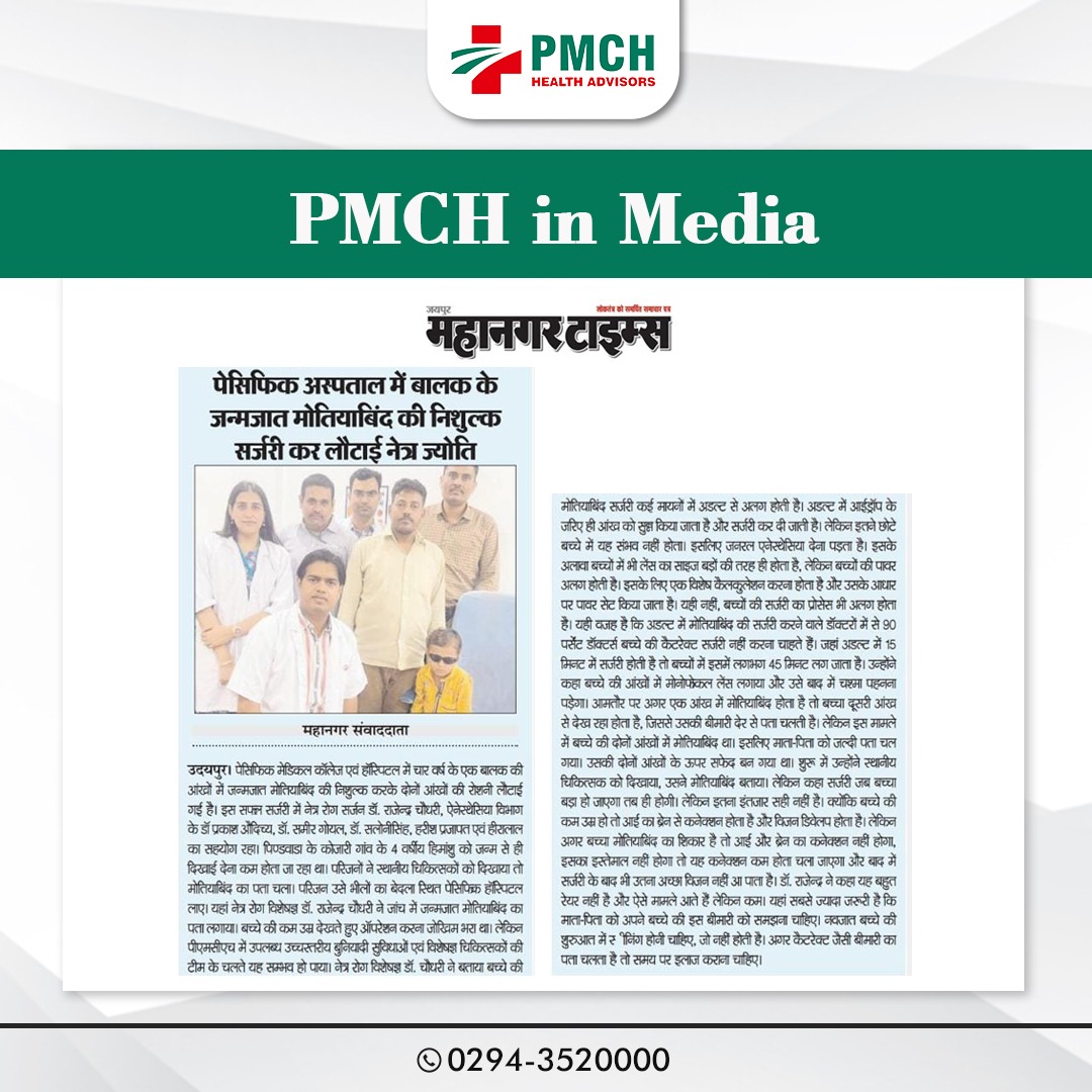 दोनों आंखों में जन्मजात था मोतियाबंद उदयपुर। ठीक से दुनिया को अपनी नजरों से निहार भी नहीं पाया था कि पता चला उसके दोनों आंखों में मोतियाबिंद है, और ऐसे ही 4 साल के बच्चें की ऑखों की निःशुल्क सर्जरी कर उसको रोशनी के साथ साथ जीनें की नई दिशा दी पेसिफिक मेडिकल कॉलेज एवं हॉस्पिटल ने। इस सफल सर्जरी में नेत्र रोग सर्जन डॉ.राजेन्द्र चौधरी, एनेस्थिशिया विभाग के डॉ, प्रकाश औदिच्य, डॉ. समीर गोयल, डॉ. सलोनी सिंह, हरीश प्रजापत एवं हीरालाल का सहयोग रहा। सिरोही जिले की पिण्डवाडा के गांव कोजारी के रहने वाले 4 वर्षीय हिमांशू को जन्म से ही दिखाई देना कम होता जा रहा था परिजनों ने स्थानीय चिकित्सको को दिखाया तो मोतियाबिंद की बीमारी का पता चला। परिजन उसे भीलों का बेदला स्थित पेसिफिक हॉस्पिटल लेकर आए जहॉ उसे नेत्र रोग विशेषज्ञ डॉ. राजेन्द्र चौधरी को बताया तो जांच करने पर जन्मजात मोतियाबिंद का पता चला।