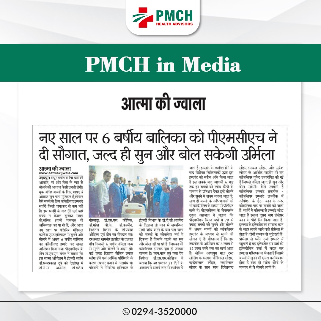 पीएमसीएच के डीन डॉ. एमएम मंगल ने बताया कि इस सफल ऑपरेशन में ईएनटी सर्जन डॉ.सत्यप्रकाश दूबे की देखरेख में डॉ. पीसी अजमेरा, डॉ. राजेन्द्र गोरवाड़ा, डॉ. एसएस कौशिक, डॉ. महेश वी. के., डॉ. कश्मीरा, निश्चेतना विभाग के डॉ. प्रकाश औदिच्य एवं टीम का योगदान रहा। दरअसल खमनोर तहसील के दडवल गॉव निवासी 6 बर्षीय उर्मिला जन्म से सुनने और बोलने में अक्षम थ़्ाी। कई जगह दिखाया लेकिन इलाज महॅगा होने एवं आर्थिक परिस्थिति के कारण उपचार कराने में असर्मथ थे। परिजनो ने पेसिफिक हॉस्पिटल के ईएनटी विभाग के डॉ.पी,सी.अजमेरा के दिखाया तो कान से सम्बन्धित सभी जॉच करने के बाद पता चला की बच्ची के कोक्लेयर नर्व में दिक्कत है जिसके चलते वह सुन और बोल नहीं पा रही है। जिसका की कॉकलियर इम्प्लांट द्वारा ही उपचार सम्भव है।