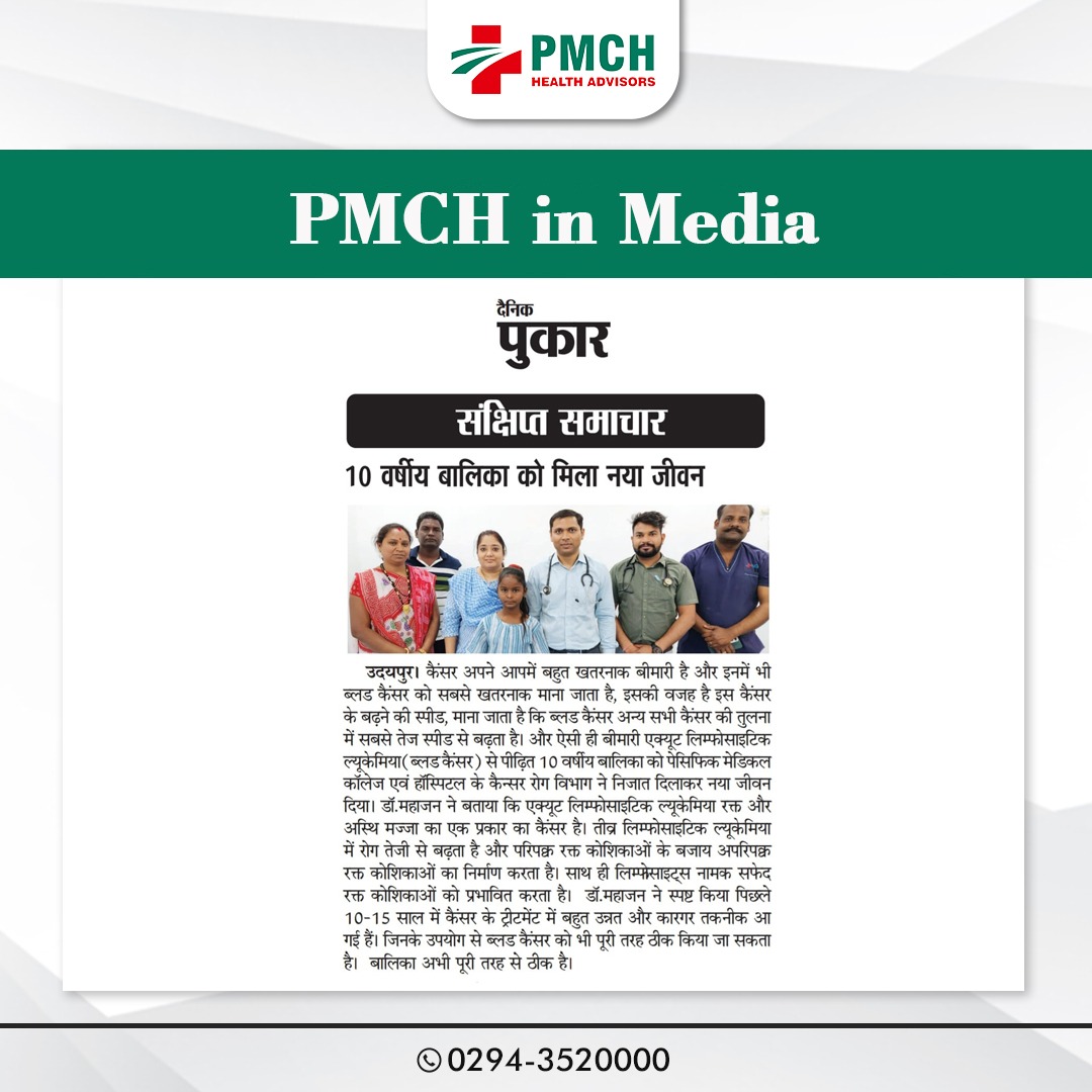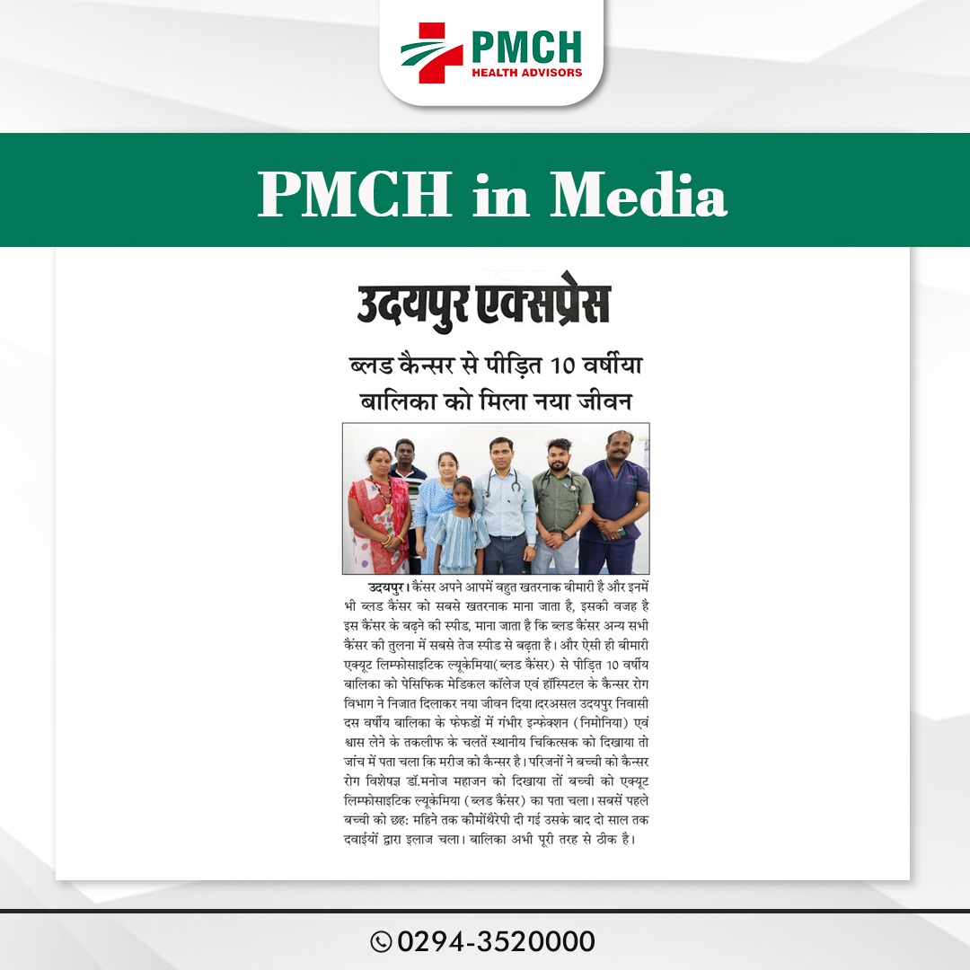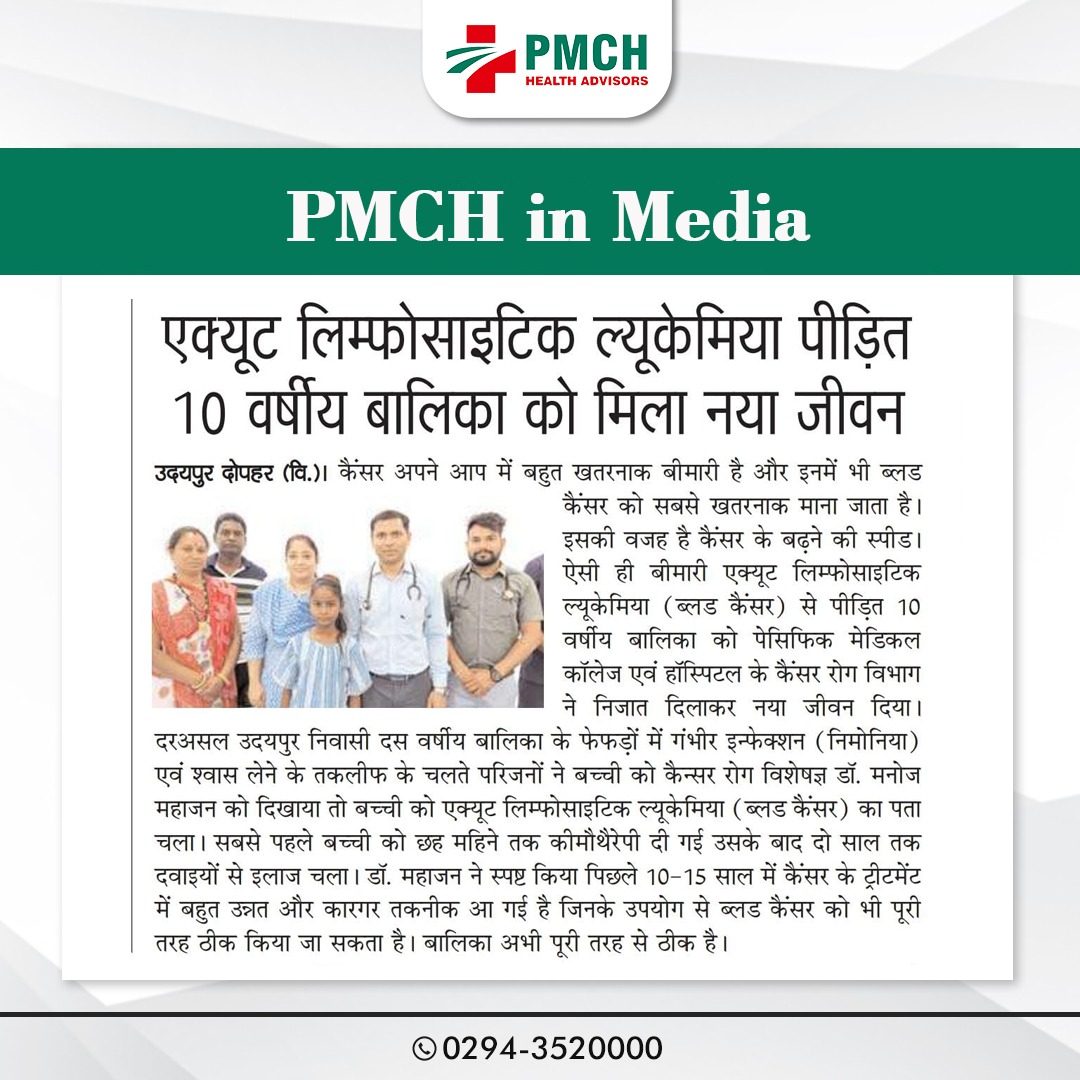 पेसिफिक मेडिकल कॉलेज एवं हॉस्पिटल के कैंसर रोग विभाग ने दस साल की बालिका को नया जीवन दिया। परिजनों ने विशेषज्ञ डॉ. मनोज महाजन को दिखाने पर ब्लड कैंसर का पता चला। इस पर बच्ची को 6 माह कीमोथैरेपी दी और दो साल तक दवाइयों से इलाज किया। डॉ: महाजन ने स्पष्ट किया कि पिछले 10-15 साल में कैंसर के ट्रीटमेंट में बहुत उन्नत और कारगर तकनीक आ गई हैं। इनके उपयोग से ब्लड कैंसर को भी पूरी तरह ठीक किया जा सकता है।