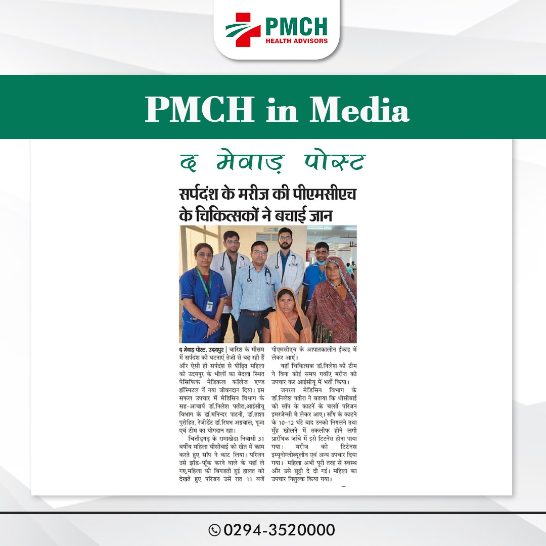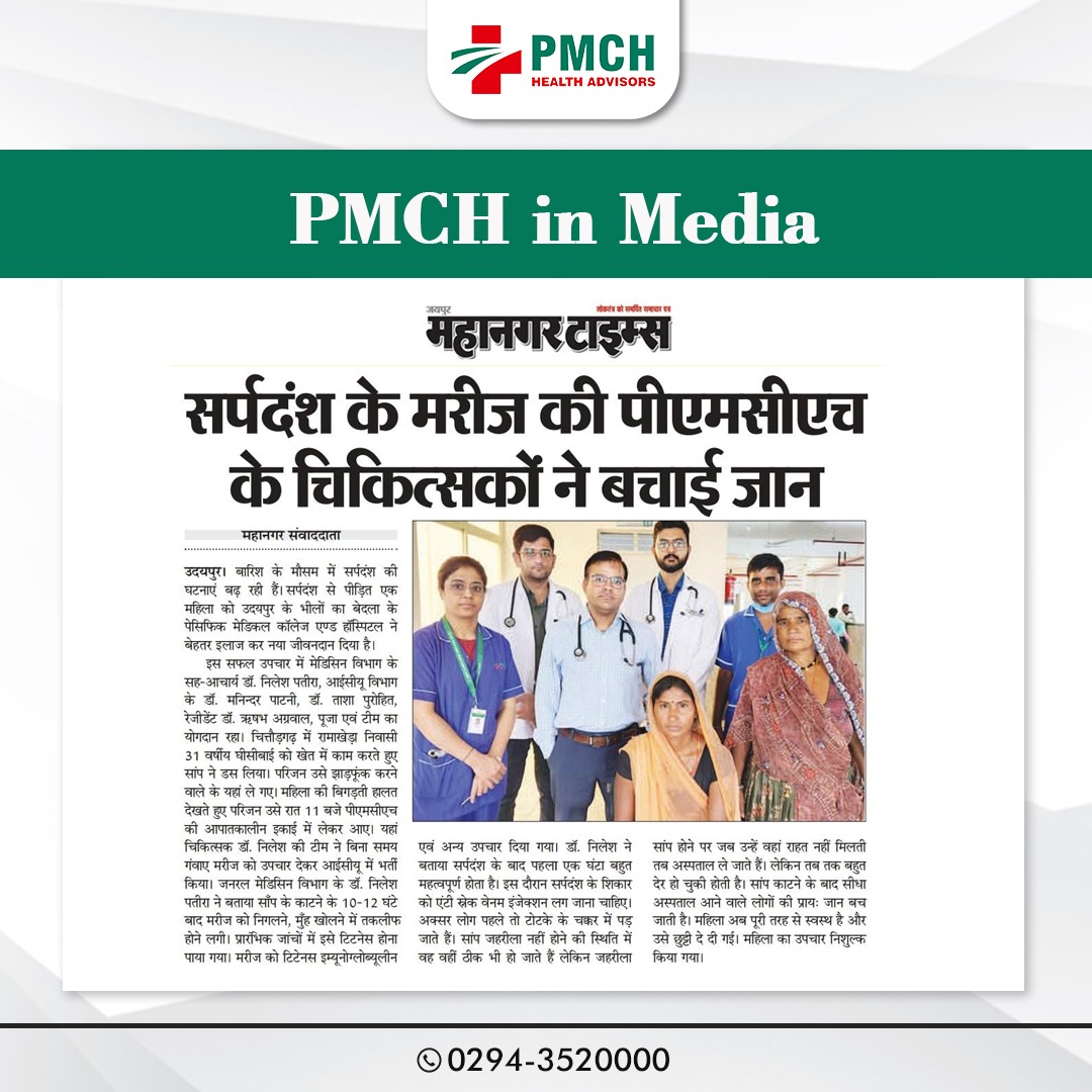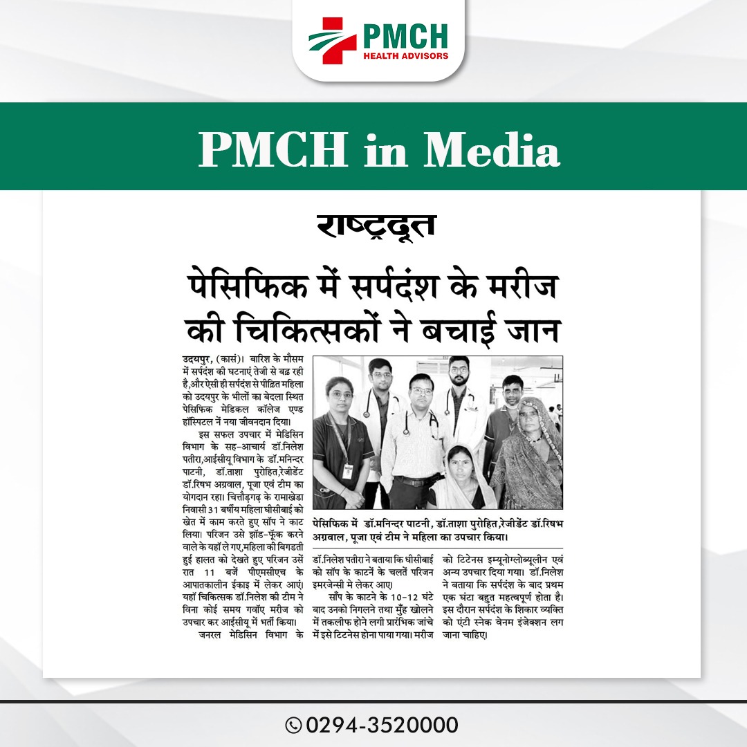 बारिश के मौसम में सर्पदंश की घटनाएं तेजी से बढ़ रही है,और ऐसी ही सर्पदंश से पीढ़ित महिला को उदयपुर के भीलों का बेदला स्थित पेसिफिक मेडिकल कॉलेज एण्ड हॉस्पिटल नें नया जीवनदान दिया। इस सफल उपचार में मेडिसिन विभाग के सह-आचार्य डॉ. निलेश पतीरा, आईसीयू विभाग के डॉ. मनिन्दर पाटनी, डॉ. ताशा पुरोहित, रेजीडेंट डॉ. रिषभ अग्रवाल, पूजा एवं टीम का योगदान रहा। दरअसल चित्तौड़गढ़ के रामाखेडा निवासी 31 बर्षीय महिला घीसीबाई को खेत में काम करते हुए सांप ने काट लिया। परिजन उसे झाड़-फूंक करने वाले के यहां ले गए,महिला की बिगडती हुई हालत को देखते हुए परिजन उसें रात 11 बजे पीएमसीएच के आपातकालीन ईकाइ में लेकर आए। यहां चिकित्सक डॉ. निलेश की टीम ने विना कोई समय गवॉए मरीज को उपचार कर आईसीयू में भर्ती किया।