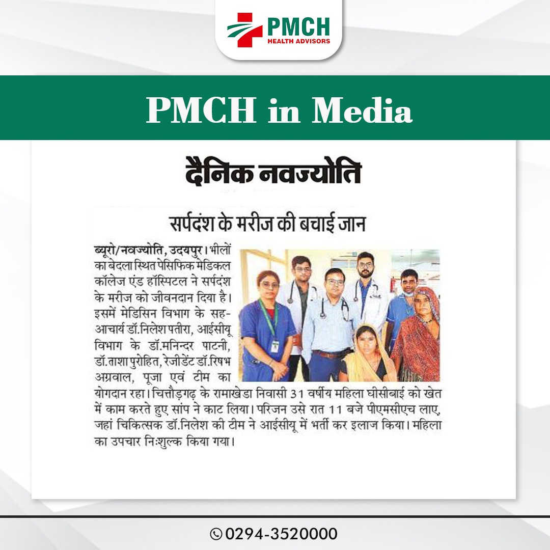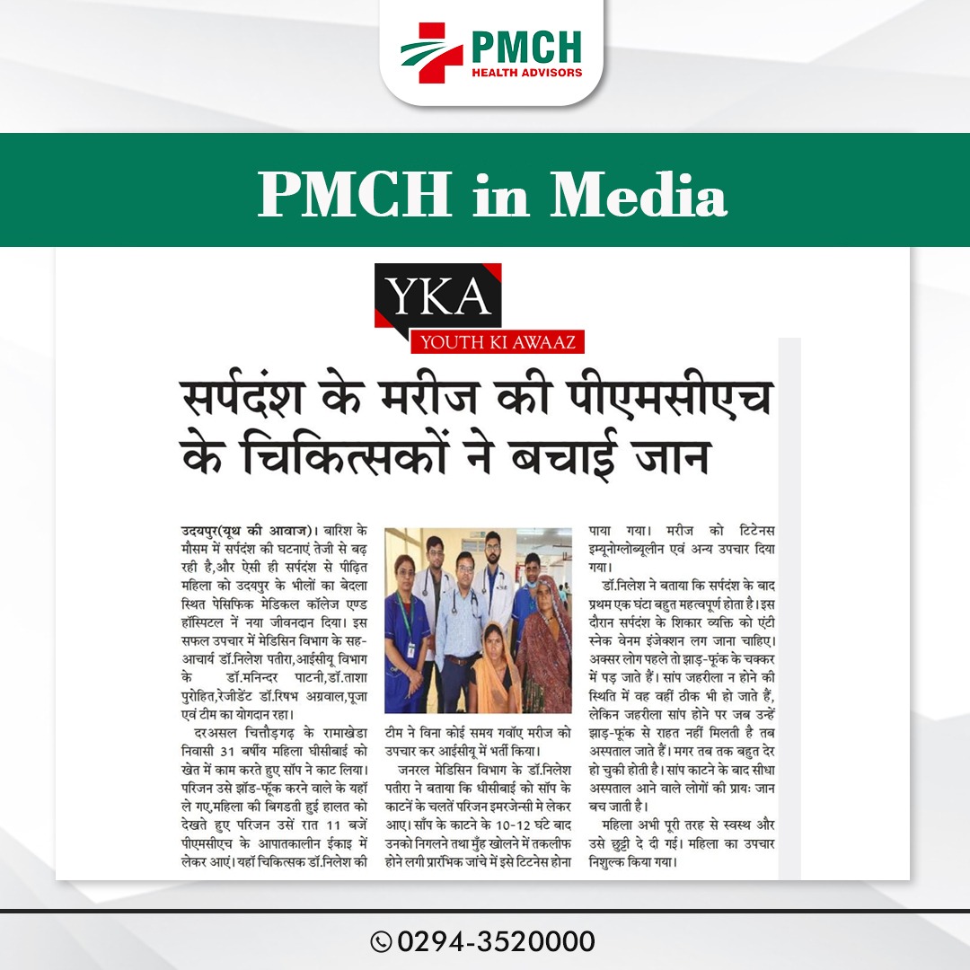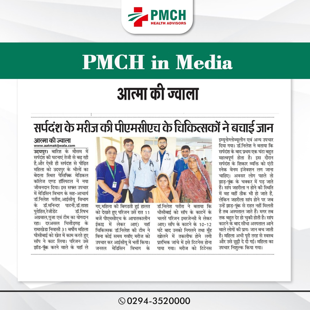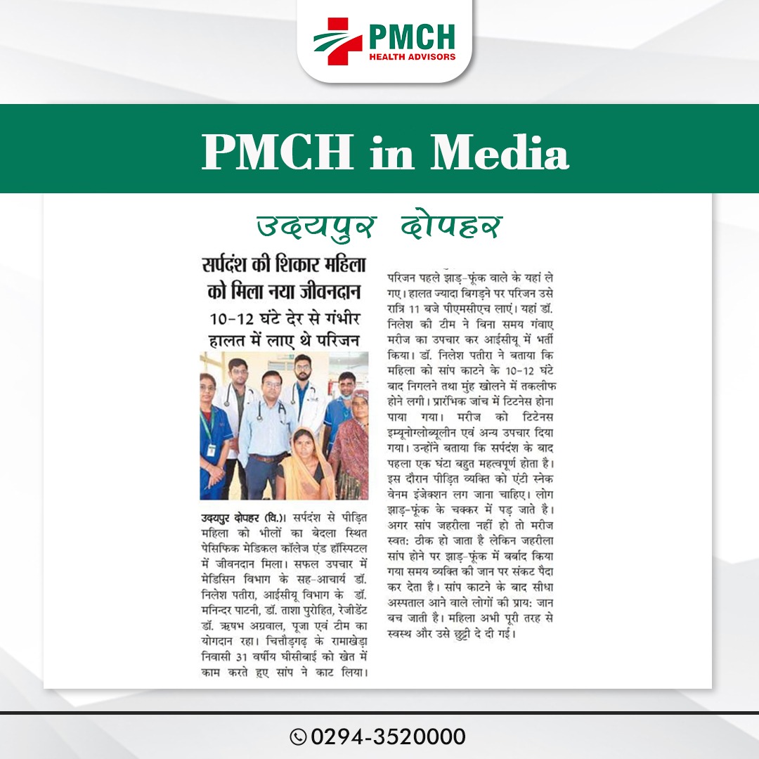 बारिश के मौसम में सर्पदंश की घटनाएं तेजी से बढ़ रही है,और ऐसी ही सर्पदंश से पीढ़ित महिला को उदयपुर के भीलों का बेदला स्थित पेसिफिक मेडिकल कॉलेज एण्ड हॉस्पिटल नें नया जीवनदान दिया। इस सफल उपचार में मेडिसिन विभाग के सह-आचार्य डॉ. निलेश पतीरा, आईसीयू विभाग के डॉ. मनिन्दर पाटनी, डॉ. ताशा पुरोहित, रेजीडेंट डॉ. रिषभ अग्रवाल, पूजा एवं टीम का योगदान रहा। दरअसल चित्तौड़गढ़ के रामाखेडा निवासी 31 बर्षीय महिला घीसीबाई को खेत में काम करते हुए सांप ने काट लिया। परिजन उसे झाड़-फूंक करने वाले के यहां ले गए,महिला की बिगडती हुई हालत को देखते हुए परिजन उसें रात 11 बजे पीएमसीएच के आपातकालीन ईकाइ में लेकर आए। यहां चिकित्सक डॉ. निलेश की टीम ने विना कोई समय गवॉए मरीज को उपचार कर आईसीयू में भर्ती किया।