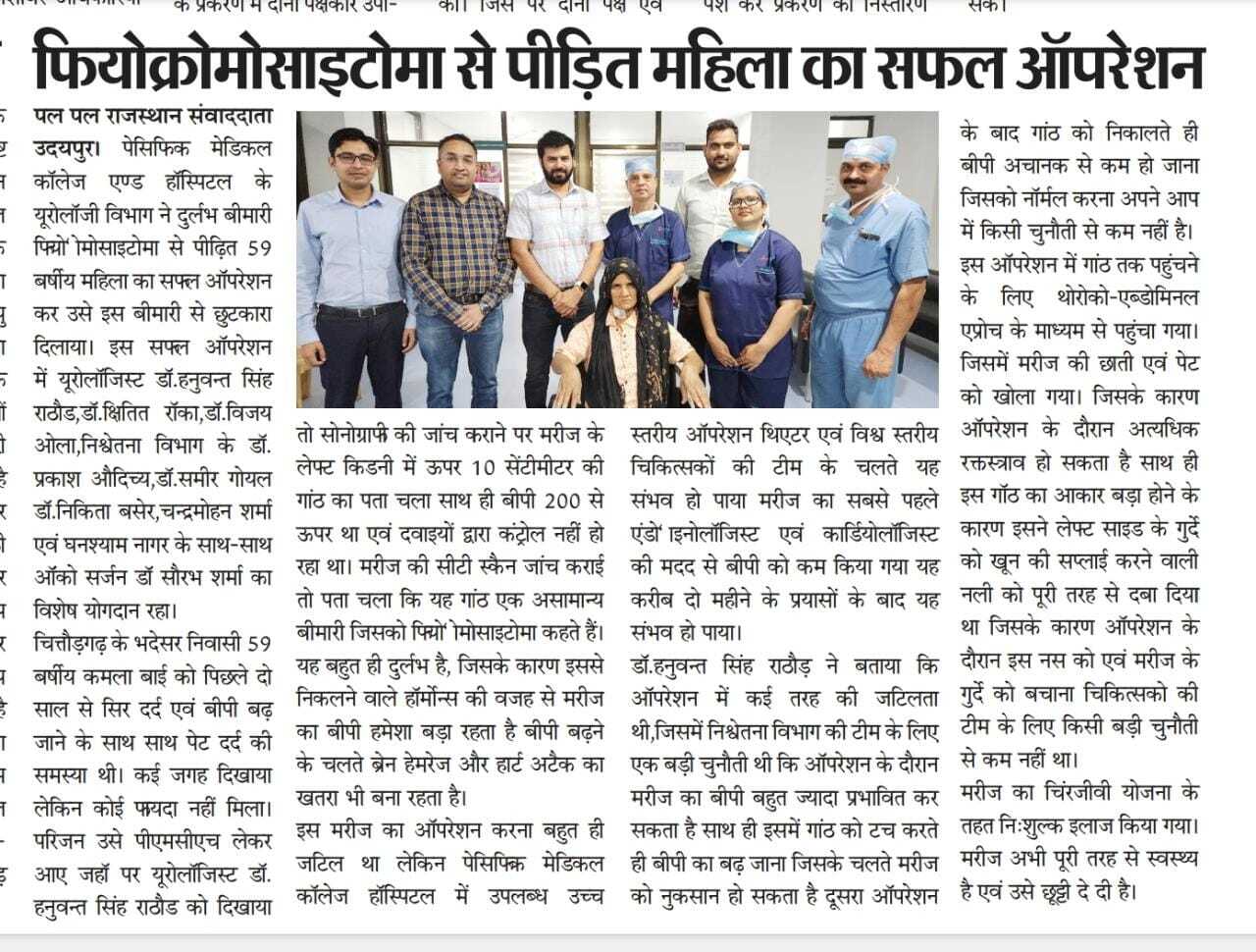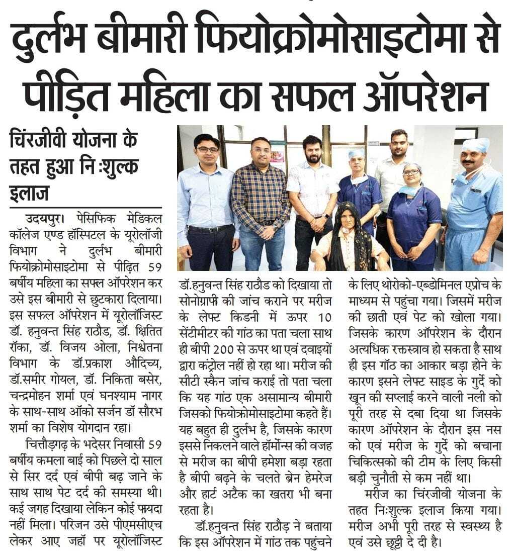 उदयपुर। पेसिफिक मेडिकल कॉलेज एण्ड हॉस्पिटल के यूरोलॉजी विभाग ने दुर्लभ बीमारी फियोक्रोमोसाइटोमा से पीढत ५९ बर्षीय महिला का सफल ऑपरेशन कर उसे इस बीमारी से छुटकारा दिलाया। इस सफल ऑपरेशन में यूरोलॉजिस्ट डॉ.हनुवन्त सिंह राठौड,डॉ.क्षितित रॉका,डॉ.विजय ओला,निश्वेतना विभाग के डॉ.प्रकाश औदिच्य,डॉ.समीर गोयल डॉ.निकिता बसेर,चन्द्रमोहन शर्मा एवं घनश्याम नागर के साथ-साथ ऑंको सर्जन डॉ सौरभ शर्मा का विशेष योगदान रहा।