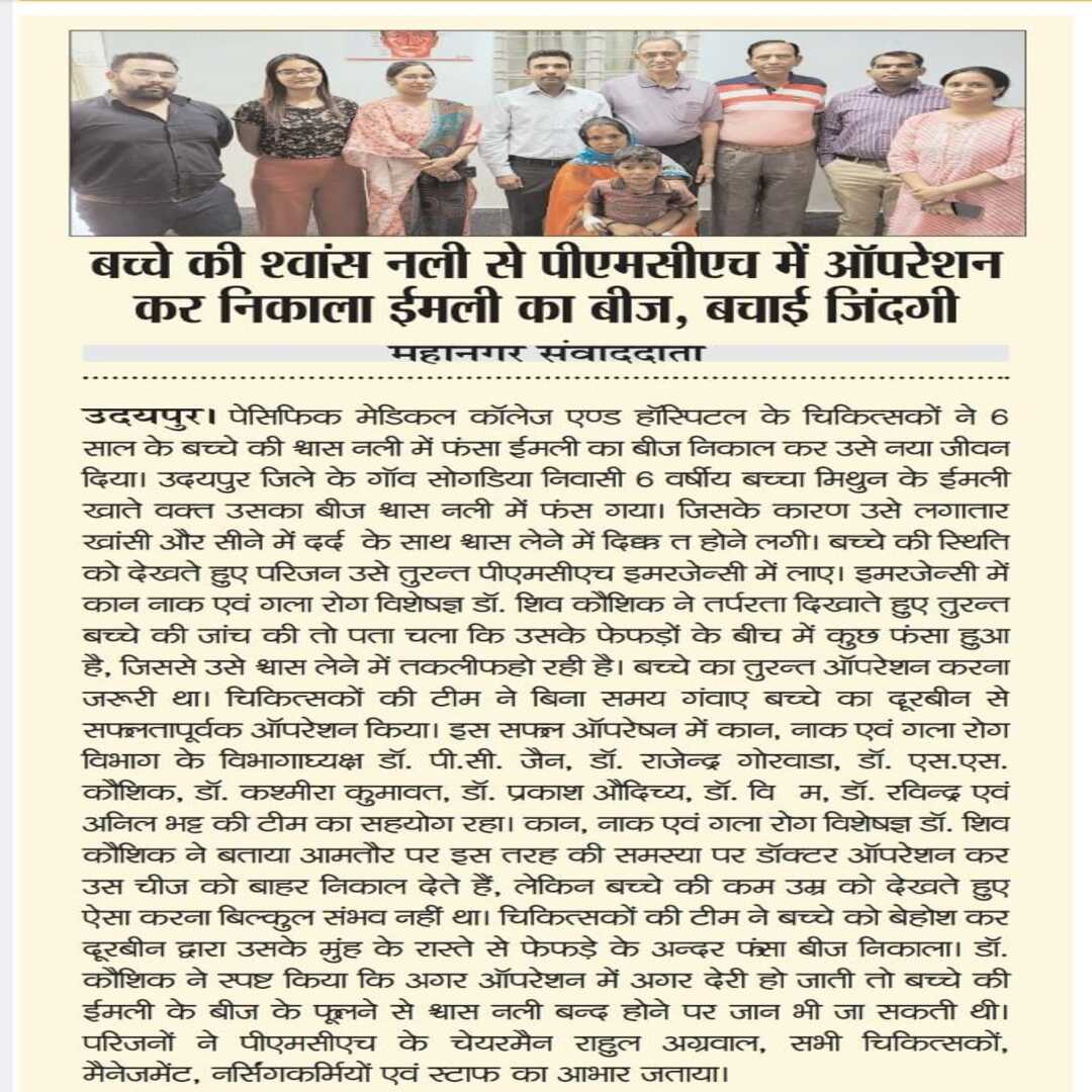 पेसिफिक मेडिकल काॅलेज एण्ड हाॅस्पिटल के चिकित्सकों ने 6 साल के बच्चे की श्वास नली में फसा ईमली का बीज निकाल कर उसे नया जीवन दिया। दरअसल उदयपुर जिले के गाॅव सोगडिया निवासी 6 बर्षीय बच्चा मिथुन ईमली खा रहा था कि अचानक से एक ईमली का बीज बच्चें की श्वास नली में फस गया। जिसके कारण उसे लगातार खांसी और सीने में दर्द के साथ साथ श्वास लेने में दिक्कत होने लगी। बच्चे की ऐसी स्थिति को देखतें हुए परिजन उसे तुरन्त पीएमसीएच की इमरजेन्सी में लेकर आए।