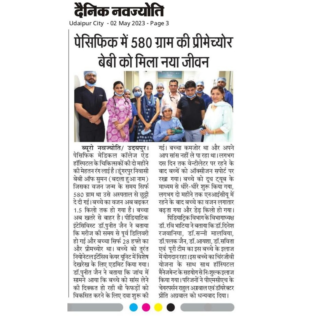 पेसिफिक मेडिकल कॉलेज एण्ड हॉस्पिटल, भीलों का बेदला में 800 ग्राम वजनी नवजात को नया जीवन देकर शादी के 18 साल बाद मां-बाप बनें दम्पति की झोली को फिर से खुशीयों भर दिया, और यह सम्भव हो सका है, अनुभवी चिकित्सको की टीम, बेहतरीन इन्फ्रस्ट्रक्चर, हाईटेक उपकरण एवं बेहतर नर्सिग केयर के कारण।