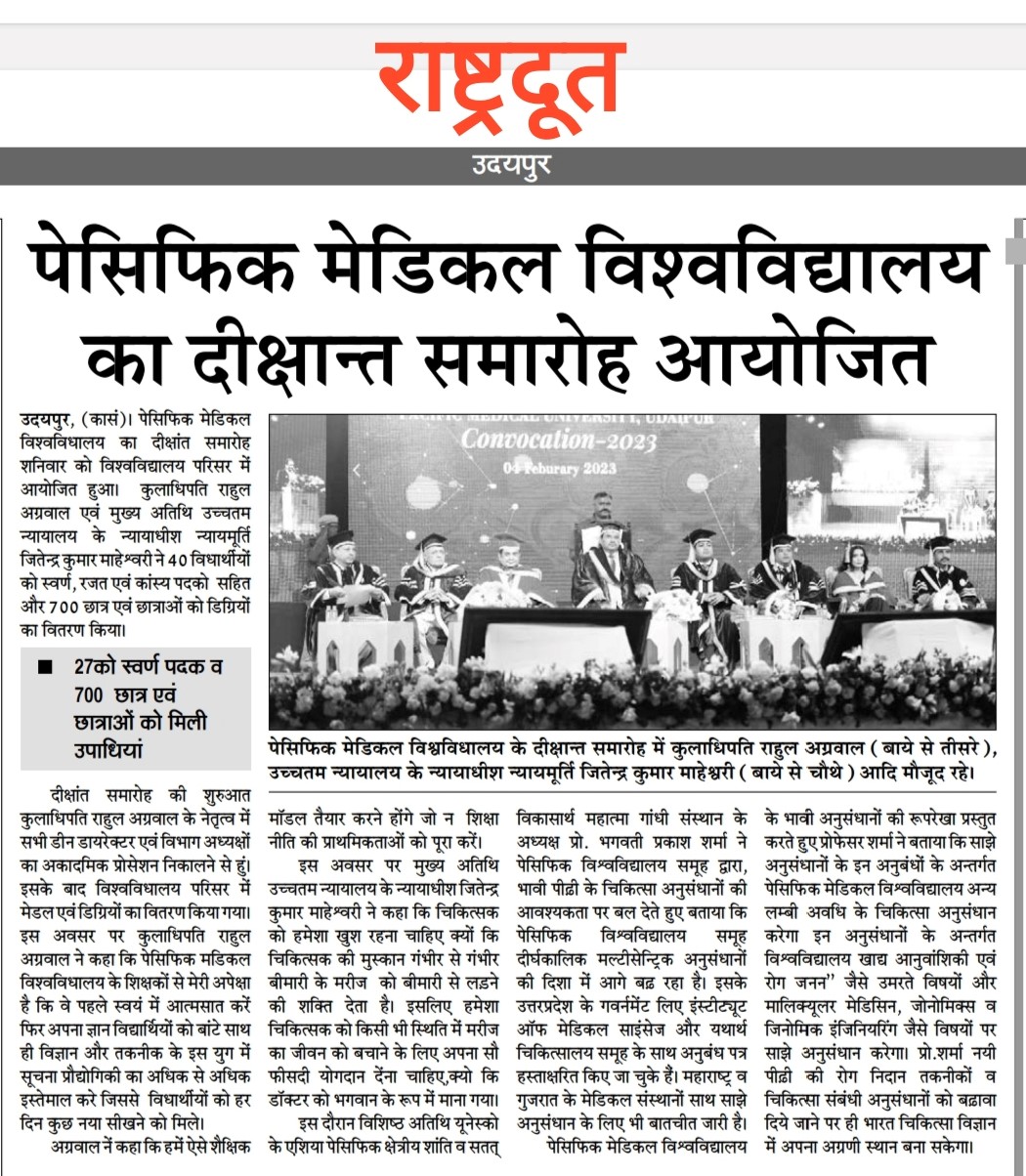 पेसिफिक मेडिकल कॉलेज एंड हॉस्पिटल के चेयरमैन राहुल अग्रवाल ने बताया कि दीक्षांत समारोह में मुख्य अतिथि सुप्रीम कोर्ट के न्यायाधीश जितेंद्र कुमार माहेश्वरी विद्यार्थियों को गोल्ड मेडल व सिल्वर मेडल से नवाजेंगे। विश्वविद्यालय के कुलपति डॉ ए पी गुप्ता ने बताया कि दीक्षांत समारोह में मेडिकल डेंटल नरसिंह एवं फिजियोथैरेपी पाठ्यक्रमों में गत वर्षो में उत्कृष्ट प्रदर्शन करने वाले 40 मेधावी छात्र-छात्राओं को स्वर्ण रजत एवं कांस्य पदकों सहित 700 स्टूडेंट्स को उपाधि प्रदान की जाएगी। संयोजक शरद कोठारी ने बताया कि संस्था योग्य छात्रों को उनके असाधारण प्रयास के लिए उनका सम्मान करेगी। समारोह में एमबीबीएस के तीन-तीन विद्यार्थियों को स्वर्ण रजत एवं कांस्य पदक, एमएससी मेडिकल के 4 विद्यार्थियों को स्वर्ण पदक, डेंटल में तीन स्वर्ण एवं तीन रजत, नर्सिग के स्नातक एवं स्नातकोत्तर पाठ्यक्रम में 11 स्वर्ण तथा तीन रजत पदक तथा फिजियोथेरेपी के स्नातक एवं स्नातकोत्तर विद्यार्थियों को स्वर्ण पदक प्रदान किए जाएंगे।