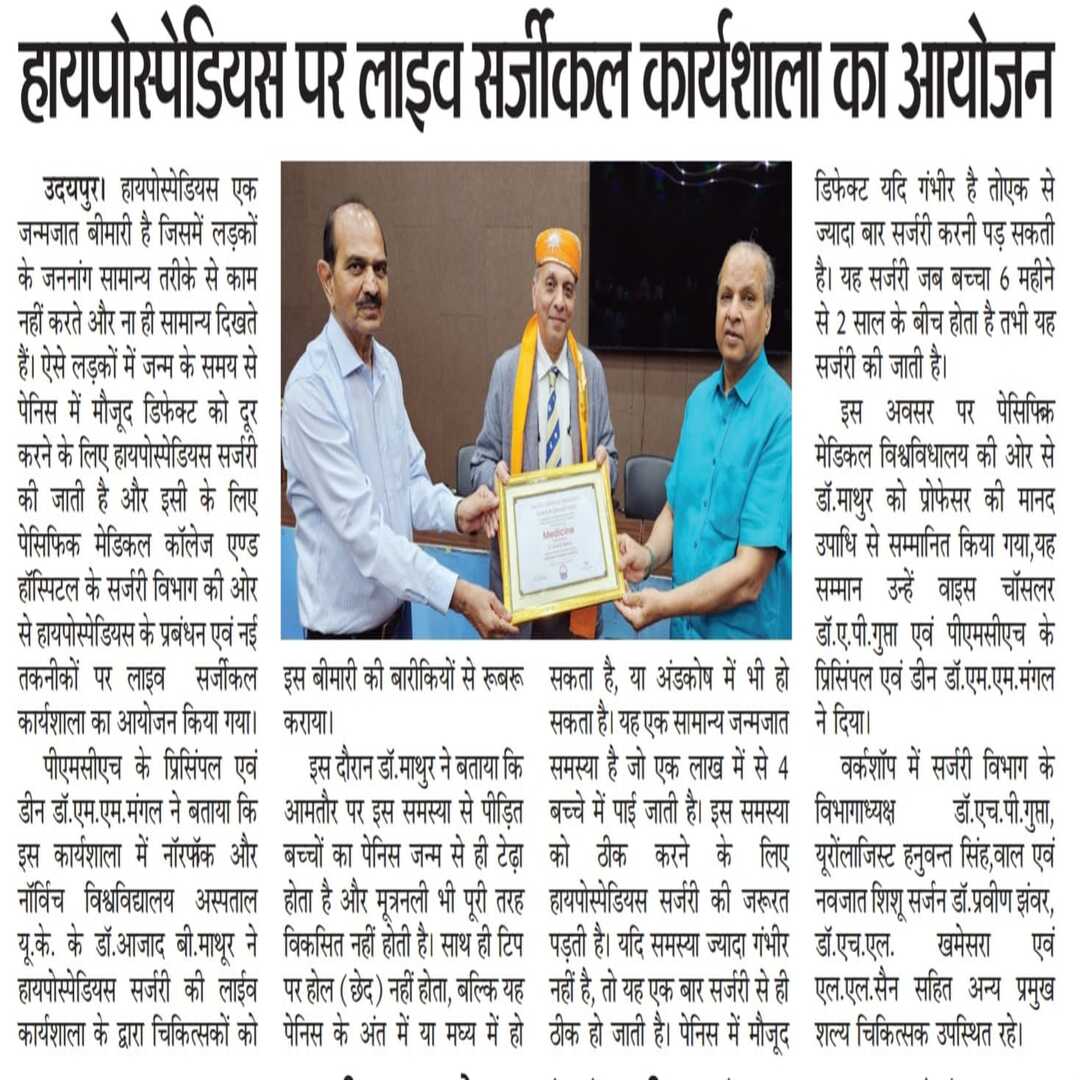 पेसिफिक मेडिकल कॉलेज एण्ड हॉस्पिटल के सर्जरी विभाग की ओर से हायपोस्पेडियस के प्रबंधन एवं नई तकनीकों पर लाइव सर्जीकल कार्यशाला का आयोजन किया गया। पीएमसीएच के प्रिसिंपल एवं डीन डॉ. एम. एम. मंगल ने बताया कि इस कार्यशाला में नॉरफॉक और नॉर्विच विश्वविद्यालय अस्पताल यू.के. के डॉ. आजाद बी. माथूर ने हायपोस्पेडियस सर्जरी की लाईव कार्यशाला के द्वारा चिकित्सकों को इस बीमारी की बारीकियों से रूबरू कराया।