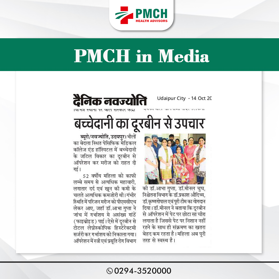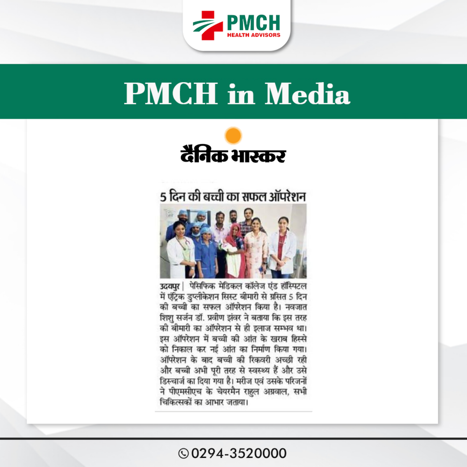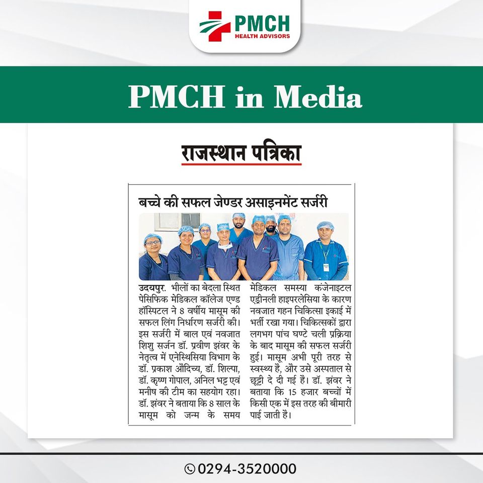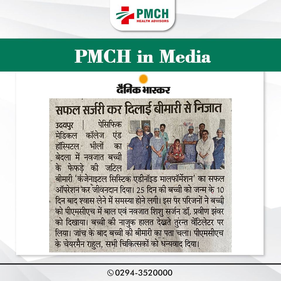 рдкреЗрд╕рд┐рдлрд┐рдХ рдореЗрдбрд┐рдХрд▓ рдХреЙрд▓реЗрдЬ рдПрдВрдб рд╣реЙрд╕реНрдкрд┐рдЯрд▓ рдореЗрдВ рдореЗрдЪреНрдпреЛрд░ рд╕рд┐рд╕реНрдЯрд┐рдХ рдЯреЗрд░рд╛рдЯреЛрдорд╛ рдирд╛рдордХ рдмреАрдорд╛рд░реА рд╕реЗ рдЧреНрд░рд╕рд┐рдд 5 рд╕рд╛рд▓ рдХреА рдмрдЪреНрдЪреА рдХрд╛ рд╕рдлрд▓ рдСрдкрд░реЗрд╢рди рдХрд░ рдЙрд╕реЗ рдЗрд╕ рдмреАрдорд╛рд░реА рд╕реЗ рдирд┐рдЬрд╛рдд рджрд┐рд▓рд╛рдИ ред рд╕рдлрд▓ рдСрдкрд░реЗрд╢рди рдореЗрдВ рдмрд╛рд▓ рдПрд╡рдВ рдирд╡рдЬрд╛рдд рд╢рд┐рд╢реБ рд╕рд░реНрдЬрди рдбреЙ. рдкреНрд░рд╡реАрдг рдЭрдВрд╡рд░, рдбреЙ. рдкреНрд░рдХрд╛рд╢ рдФрджрд┐рдЪреНрдп, рдбреЙ. рд╢рд┐рд▓реНрдкрд╛ рдПрд╡рдВ рдЕрдирд┐рд▓ рднрдЯреНрдЯ рдХреА рдЯреАрдо рдХрд╛ рд╕рд╣рдпреЛрдЧ рд░рд╣рд╛ ред