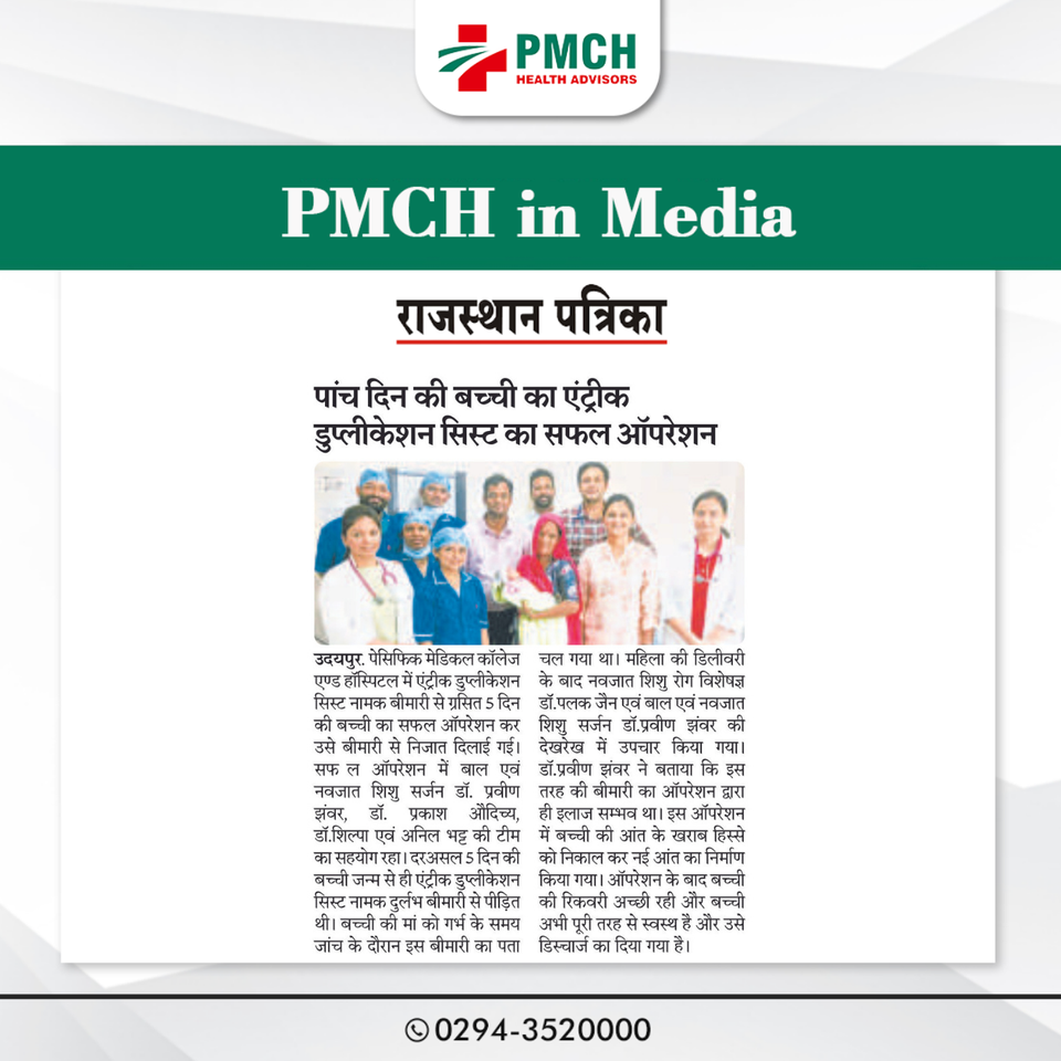 рдкреЗрд╕рд┐рдлрд┐рдХ рдореЗрдбрд┐рдХрд▓ рдХреЙрд▓реЗрдЬ рдПрдВрдб рд╣реЙрд╕реНрдкрд┐рдЯрд▓ рдореЗрдВ 'рдПрдгреНрдЯреАтАМтАМрдХ рдбреБрдкреНрд▓реАрдХреЗрд╢рди рд╕рд┐рд╕реНрдЯ' рдирд╛рдордХ рдмреАрдорд╛рд░реА рд╕реЗ рдЧреНрд░рд╕рд┐рдд 5 рджрд┐рди рдХреА рдмрдЪреНрдЪреА рдХрд╛ рд╕рдлрд▓ рдСрдкрд░реЗрд╢рди рдХрд░ рдЙрд╕реЗ рдЗрд╕ рдмреАрдорд╛рд░реА рд╕реЗ рдирд┐рдЬрд╛рдд рджрд┐рд▓рд╛рдИ рдЧрдИред рд╕рдлрд▓ рдСрдкрд░реЗрд╢рди рдореЗрдВ рдмрд╛рд▓ рдПрд╡рдВ рдирд╡рдЬрд╛рдд рд╢рд┐рд╢реБ рд╕рд░реНрдЬрди рдбреЙ.рдкреНрд░рд╡реАрдг рдЭрдВрд╡рд░, рдбреЙ.рдкреНрд░рдХрд╛рд╢ рдФрджрд┐рдЪреНрдп, рдбреЙ.рд╢рд┐рд▓реНрдкрд╛ рдПрд╡рдВ рдЕрдирд┐рд▓ рднрдЯреНрдЯ рдЯреАрдо рдХрд╛ рд╕рд╣рдпреЛрдЧ рд░рд╣рд╛ред