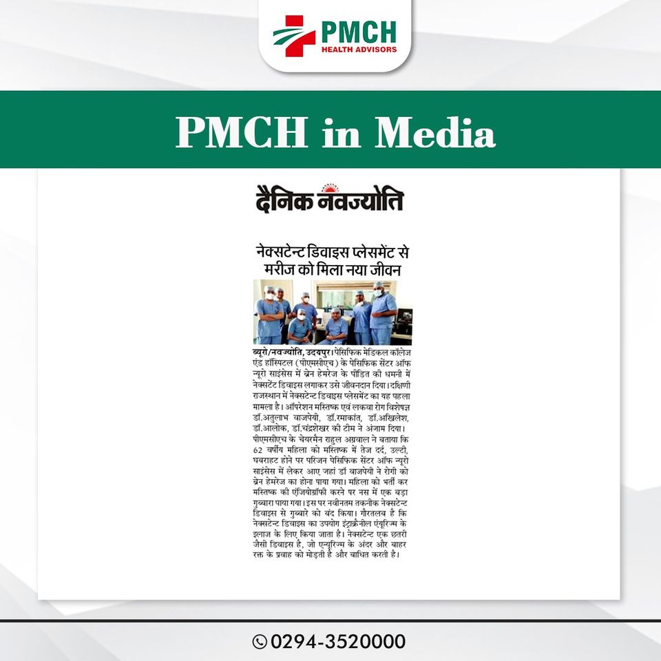 पेसिफिक मेडिकल कॉलेज एण्ड हॉस्पिटल के पेसिफिक सेन्टर ऑफ न्यूरो साइंसेस में ब्रेन हेमरेज मरीज की धमनी में दक्षिणी राजस्थान की पहली नेक्सटेन्ट डिवाइस लगाकर जीवनदान दिया। मरीज के नेक्सटेन्ट डिवाइस प्लेसमेंट में मस्तिष्क एवं लकवा रोग विशेषज्ञ डॉ. अतुलाभ वाजपेयी, डॉ. रमाकांत, डॉ. अखिलेश का सहयोग रहा। 62 साल की महिला को मस्तिष्क में तेज दर्द, उल्टी, घबराहट के चलते परिजन पेसिफिक सेन्टर ऑफ न्यूरो साइंसेस लाए थे। डॉ. वाजपेयी को दिखाया तो जांच में रोगी के मस्तिष्क में ब्रेन हेमरेज पाया गया। डॉ. वाजपेयी ने स्पष्ट किया कि उपचार की नवीनतम तकनीक नेक्सटेन्ट डिवाइस से गुब्बारे को बंद किया।