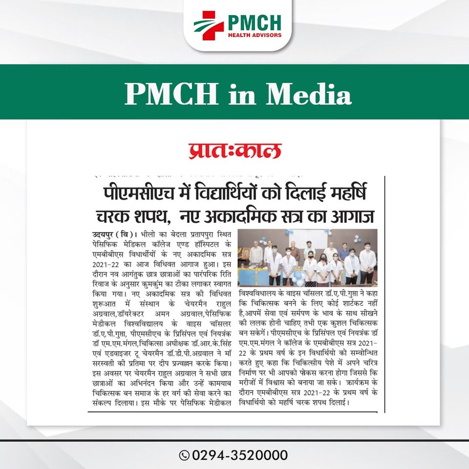 भीलों का बेदला प्रतापपुरा स्थित पेसिफिक मेडिकल कॉलेज एंड हॉस्पिटल के एमबीबीएस छात्रों के नए अकादमिक सत्र 2021-22 का आगाज मंगलवार को हुआ। इस दौरान नव आगंतुक छात्रों का पारंपरिक रीति रिवाज के अनुसार कुमकुम का टीका लगाकर स्वागत किया गया। नए सत्र की शुरुआत चेयरमैन राहुल अग्रवाल, डॉयरेक्टर अमन अग्रवाल आदि ने दीप प्रज्वलन करके की।