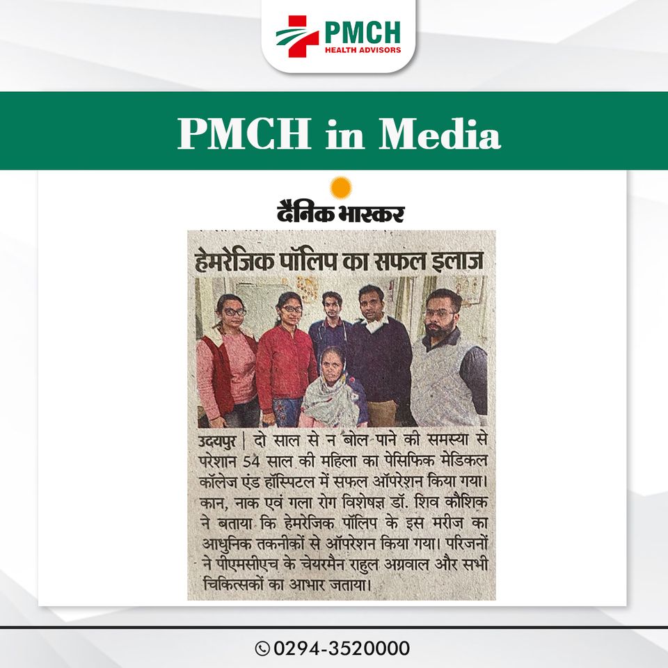 2 साल से ना बोल पाने की समस्या से परेशान 56 साल की महिला का पेसिफिक मेडिकल कॉलेज एंड हॉस्पिटल में सफल ऑपरेशन किया गया। कान्हा कम गला रोग विशेषज्ञ डॉ. शिव कौशिक ने बताया कि हेमरेजिक पॉलिप के इस बीमारी का आधुनिक तरीके से ऑपरेशन किया गया। परिजनों ने पीएमसीएच के चेयरमैन राहुल अग्रवाल और सभी चिकित्सकों का आभार जताया।
