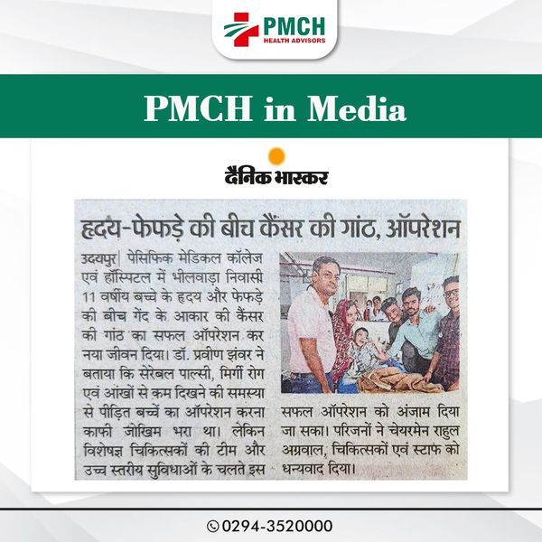 पेसिफिक मेडिकल कॉलेज एवं हॉस्पिटल में भीलवाड़ा निवासी 11 वर्षीय बच्चे के हृदय और फेफड़े की बीच गेंद के आकार की कैंसर की गांठ का सफल ऑपरेशन कर नया जीवन दिया। डॉ. प्रवीण झंवर ने बताया कि सेरेबल पाल्सी, मिर्गी रोग एवं आंखों से कम दिखने की समस्या से पीड़ित बच्चें का ऑपरेशन करना काफी जोखिम भरा था। लेकिन विशेषज्ञ चिकित्सकों की टीम और उच्च स्तरीय सुविधाओं के चलते इस सफल ऑपरेशन को अंजाम दिया जा सका। परिजनों ने चेयरमेन राहुल अग्रवाल, चिकित्सकों एवं स्टाफ को धन्यवाद दिया।