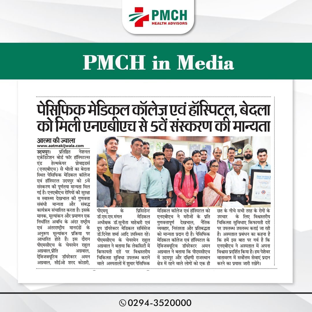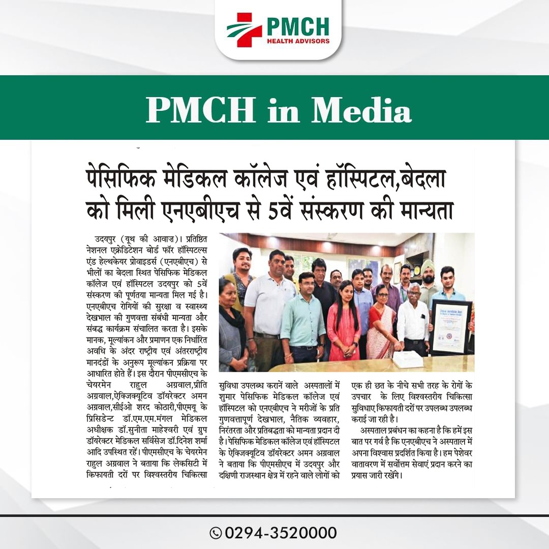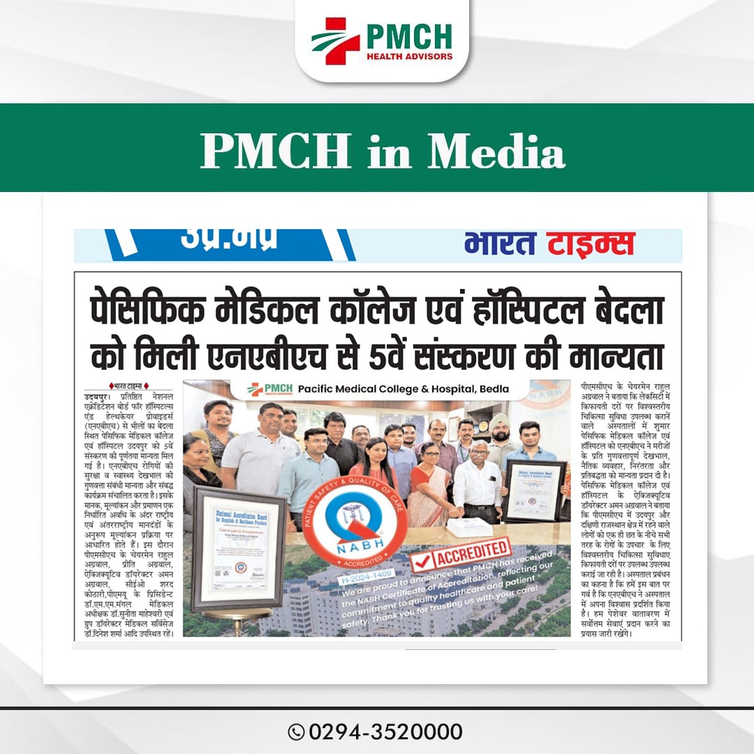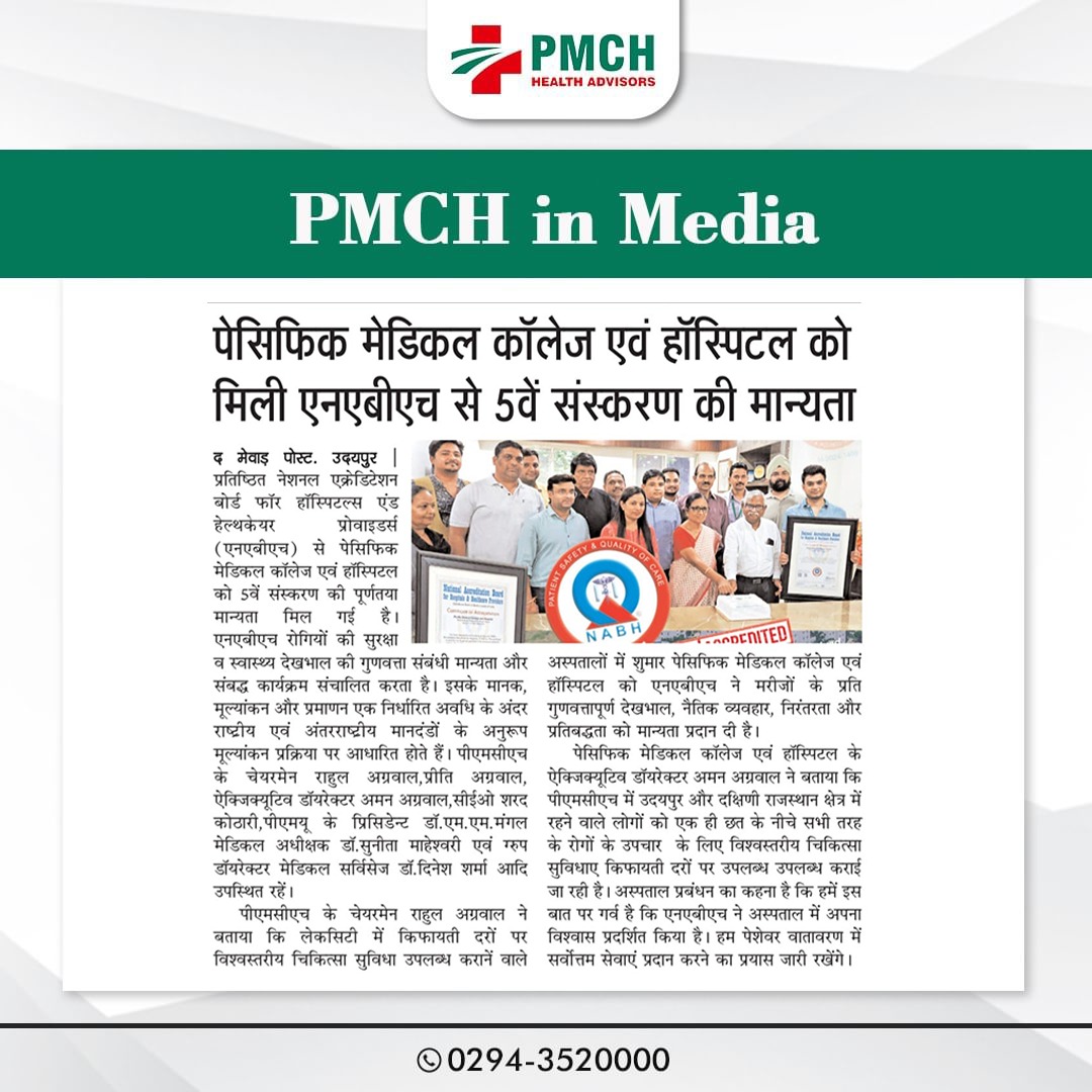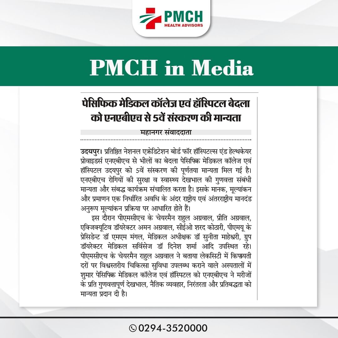 पेसिफिक मेडिकल कॉलेज एवं हॉस्पिटल (PMCH) को एनएबीएच के 5वें संस्करण की पूर्ण मान्यता प्राप्त हुई है! यह मान्यता हमारे मरीजों को सर्वोच्च स्तर की सुरक्षा और गुणवत्तापूर्ण स्वास्थ्य सेवाएं प्रदान करने के प्रति हमारी प्रतिबद्धता का प्रमाण है। हम उदयपुर और दक्षिणी राजस्थान के लोगों को विश्वस्तरीय चिकित्सा सुविधाएं किफायती दरों पर उपलब्ध कराने के लिए निरंतर समर्पित हैं। आपका विश्वास हमारी ताकत है, और हम आपके लिए बेहतर स्वास्थ्य सेवाएं देने के लिए प्रतिबद्ध हैं।