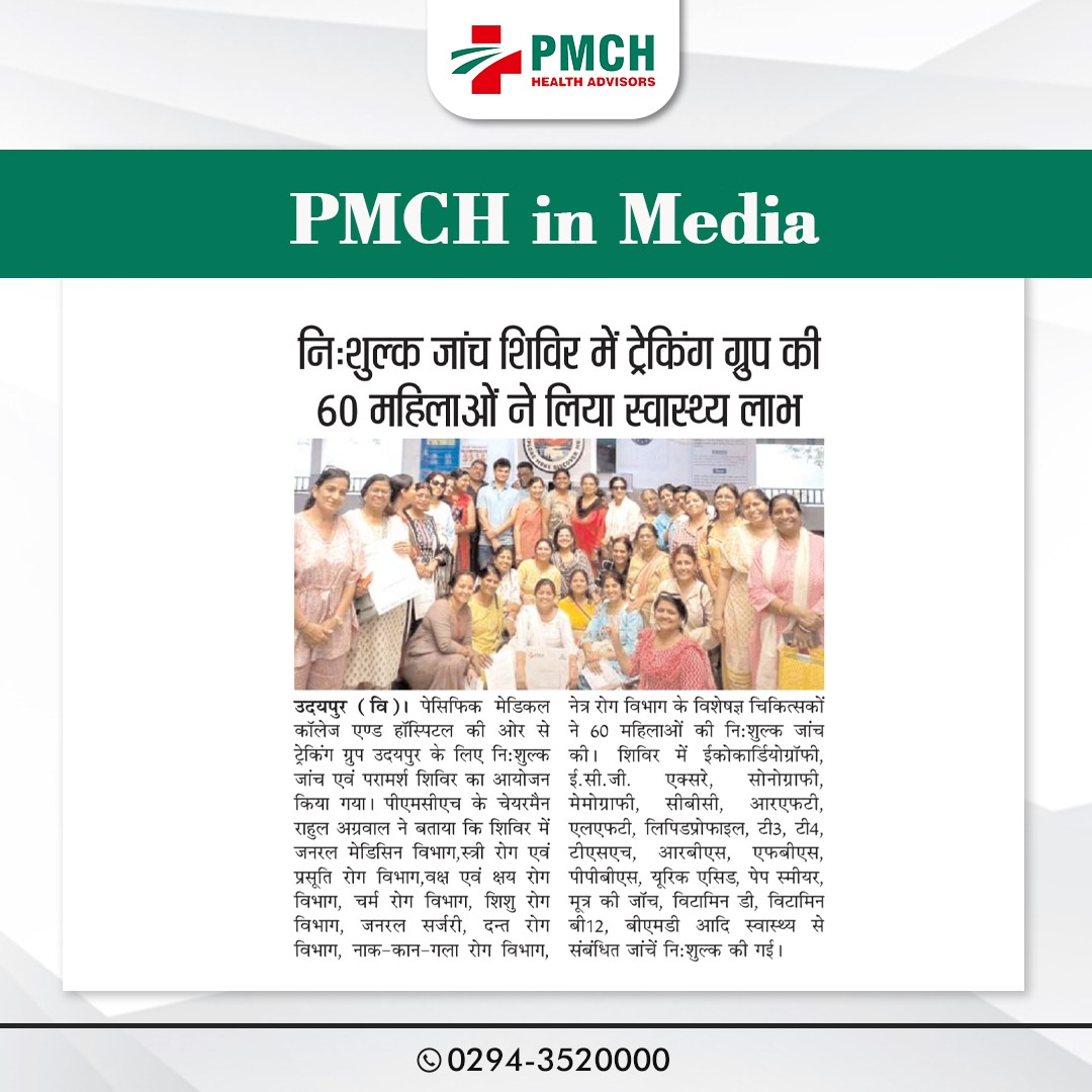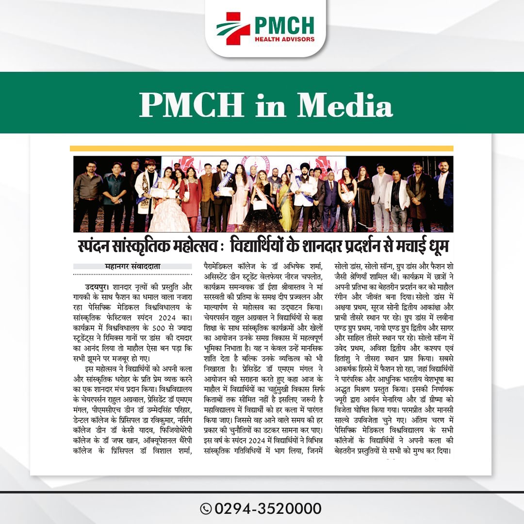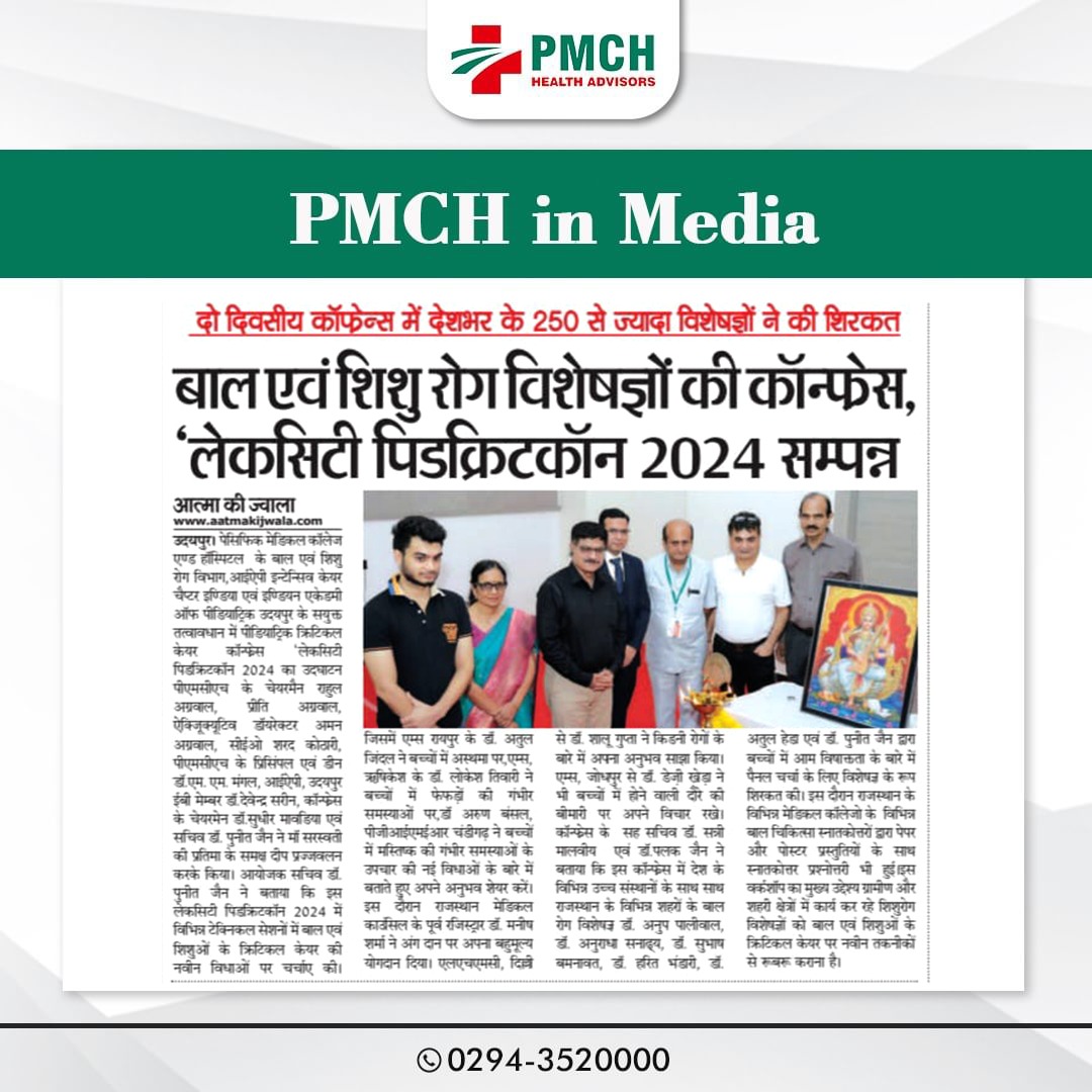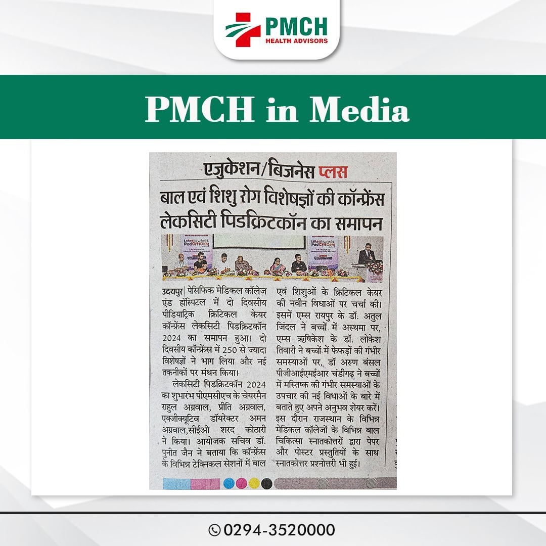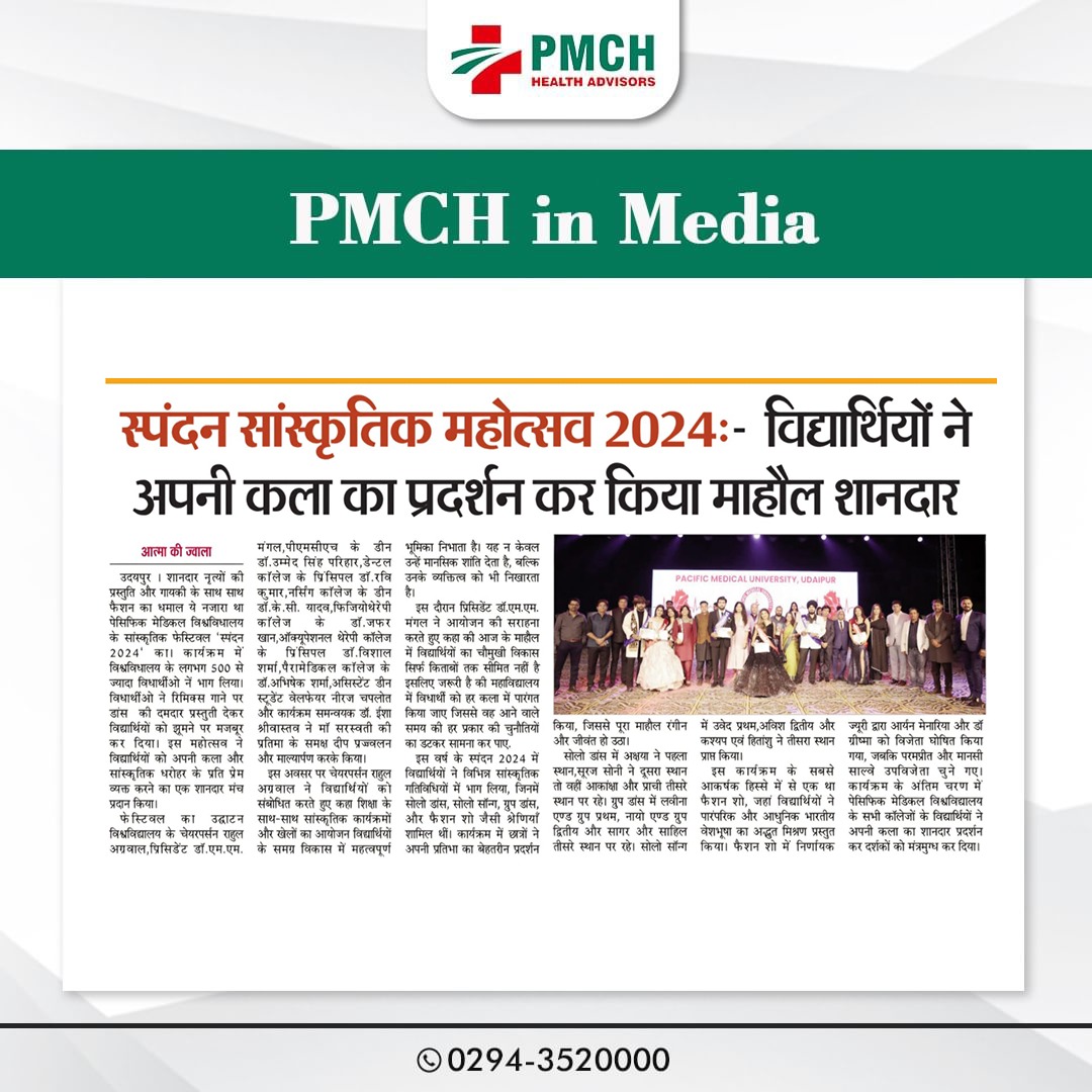 पेसिफिक मेडिकल कॉलेज एवं हॉस्पिटल (PMCH) को एनएबीएच के 5वें संस्करण की पूर्ण मान्यता प्राप्त हुई है! यह मान्यता हमारे मरीजों को सर्वोच्च स्तर की सुरक्षा और गुणवत्तापूर्ण स्वास्थ्य सेवाएं प्रदान करने के प्रति हमारी प्रतिबद्धता का प्रमाण है। हम उदयपुर और दक्षिणी राजस्थान के लोगों को विश्वस्तरीय चिकित्सा सुविधाएं किफायती दरों पर उपलब्ध कराने के लिए निरंतर समर्पित हैं। आपका विश्वास हमारी ताकत है, और हम आपके लिए बेहतर स्वास्थ्य सेवाएं देने के लिए प्रतिबद्ध हैं।