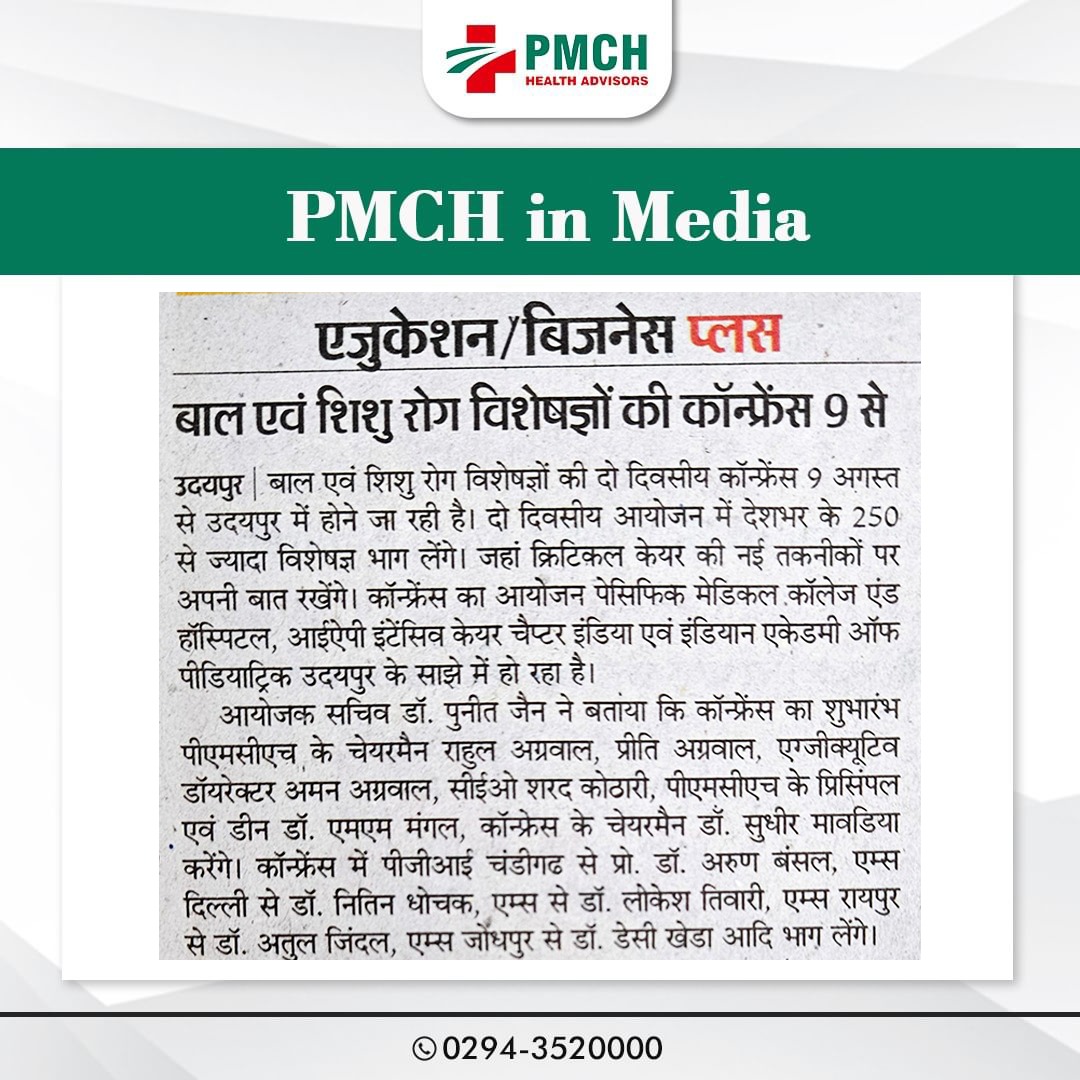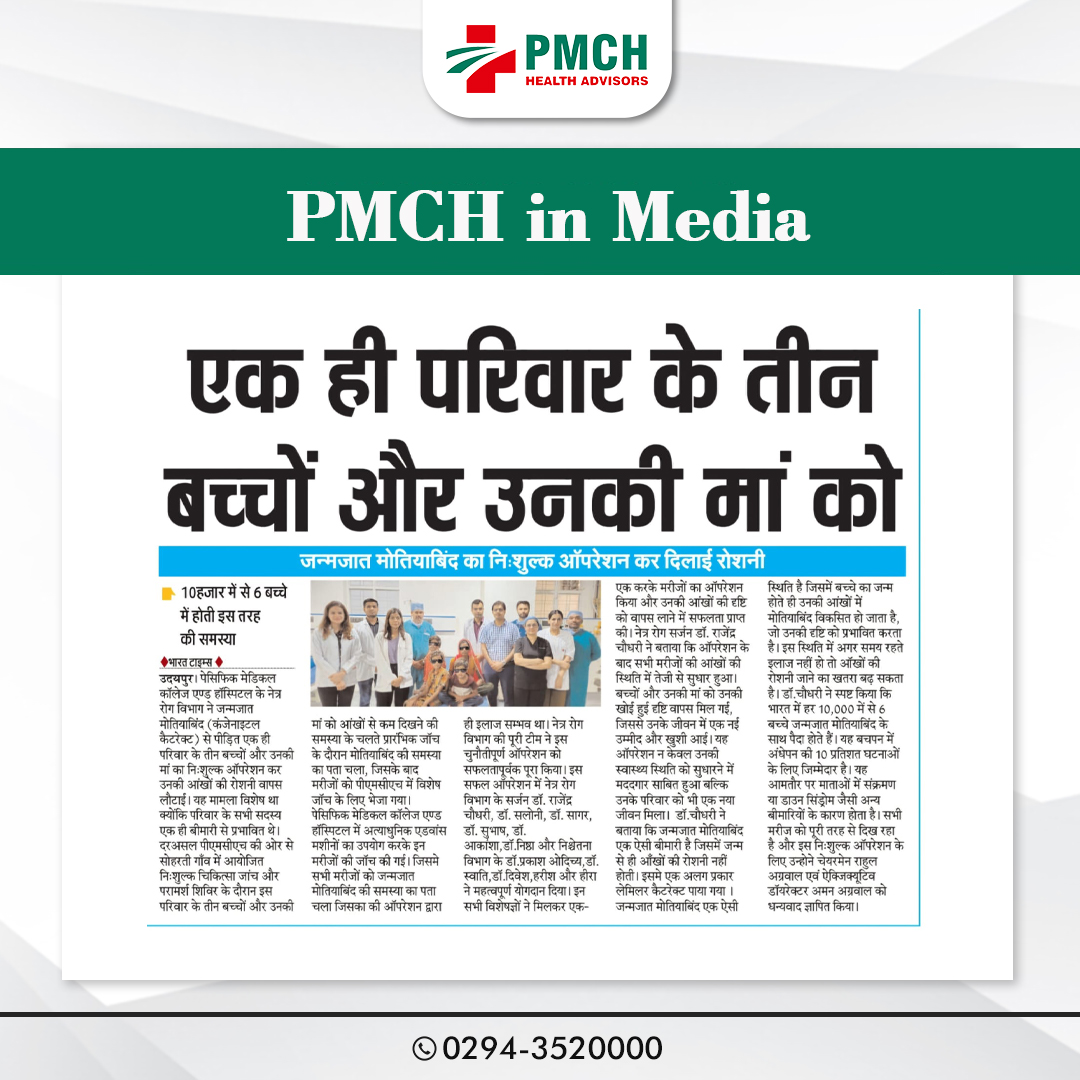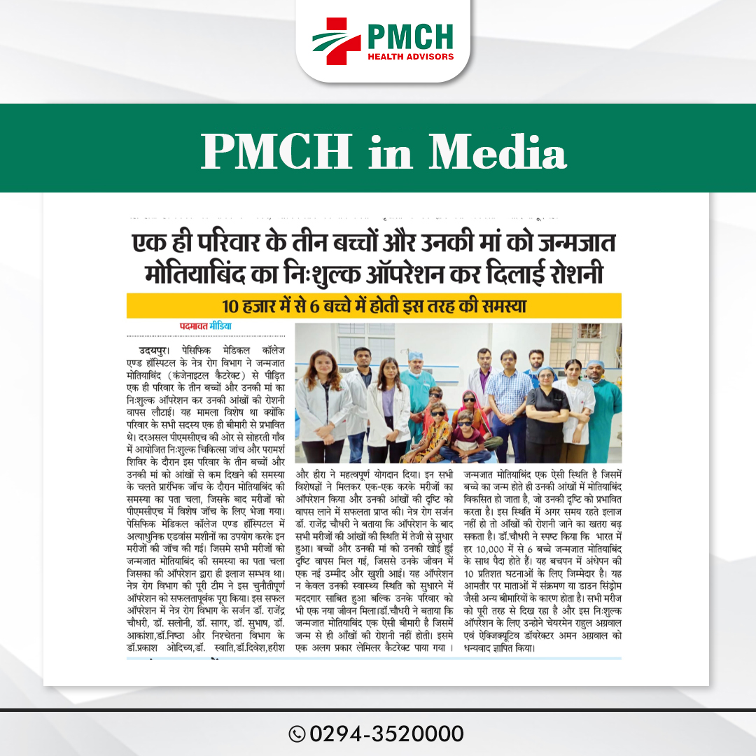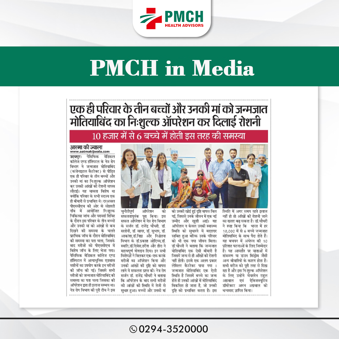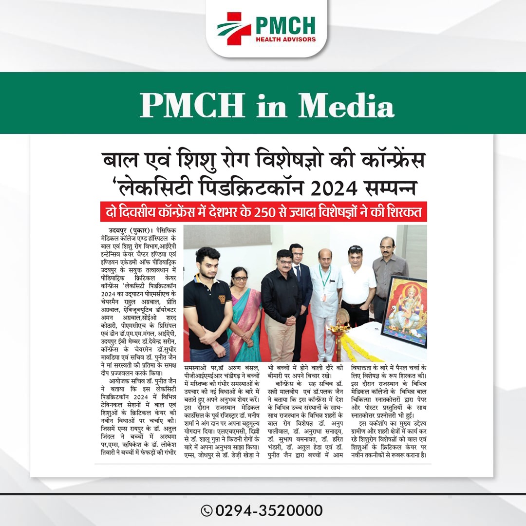 पेसिफिक मेडिकल कॉलेज एवं हॉस्पिटल (PMCH) को एनएबीएच के 5वें संस्करण की पूर्ण मान्यता प्राप्त हुई है! यह मान्यता हमारे मरीजों को सर्वोच्च स्तर की सुरक्षा और गुणवत्तापूर्ण स्वास्थ्य सेवाएं प्रदान करने के प्रति हमारी प्रतिबद्धता का प्रमाण है। हम उदयपुर और दक्षिणी राजस्थान के लोगों को विश्वस्तरीय चिकित्सा सुविधाएं किफायती दरों पर उपलब्ध कराने के लिए निरंतर समर्पित हैं। आपका विश्वास हमारी ताकत है, और हम आपके लिए बेहतर स्वास्थ्य सेवाएं देने के लिए प्रतिबद्ध हैं।