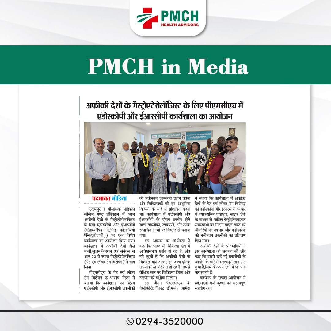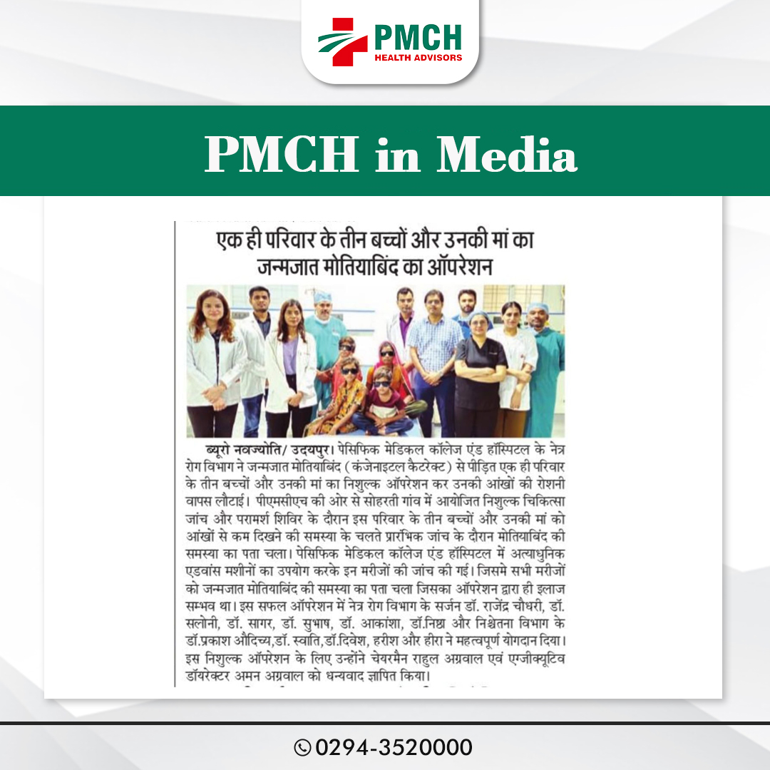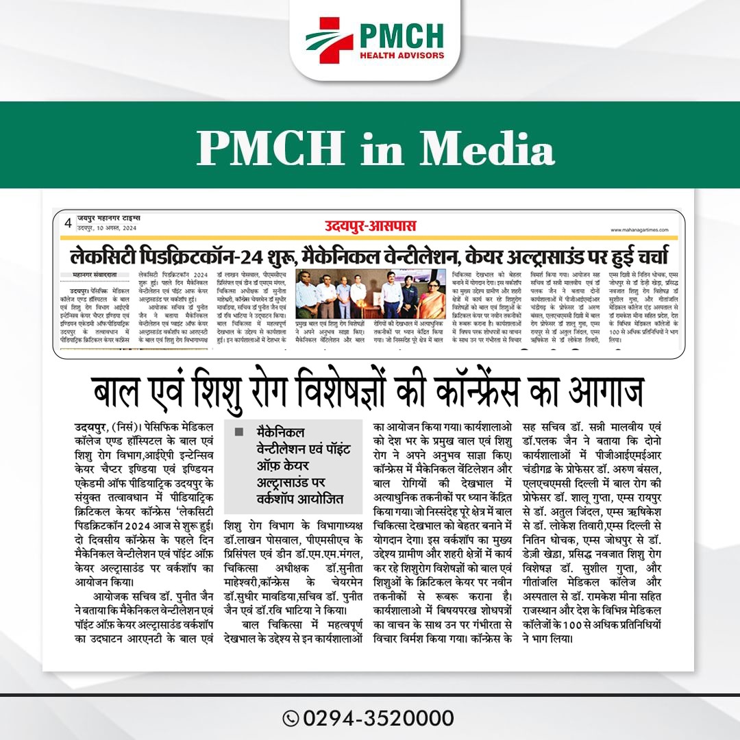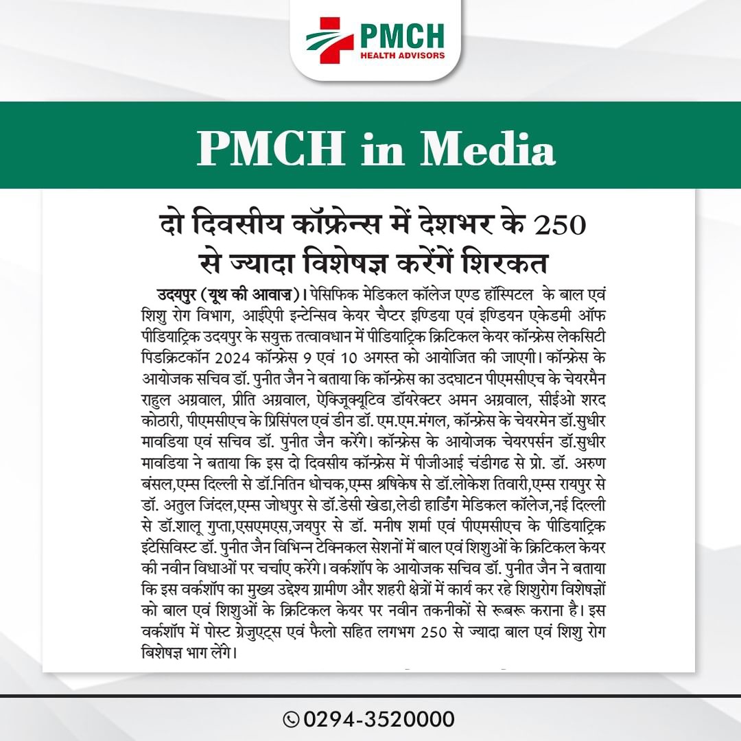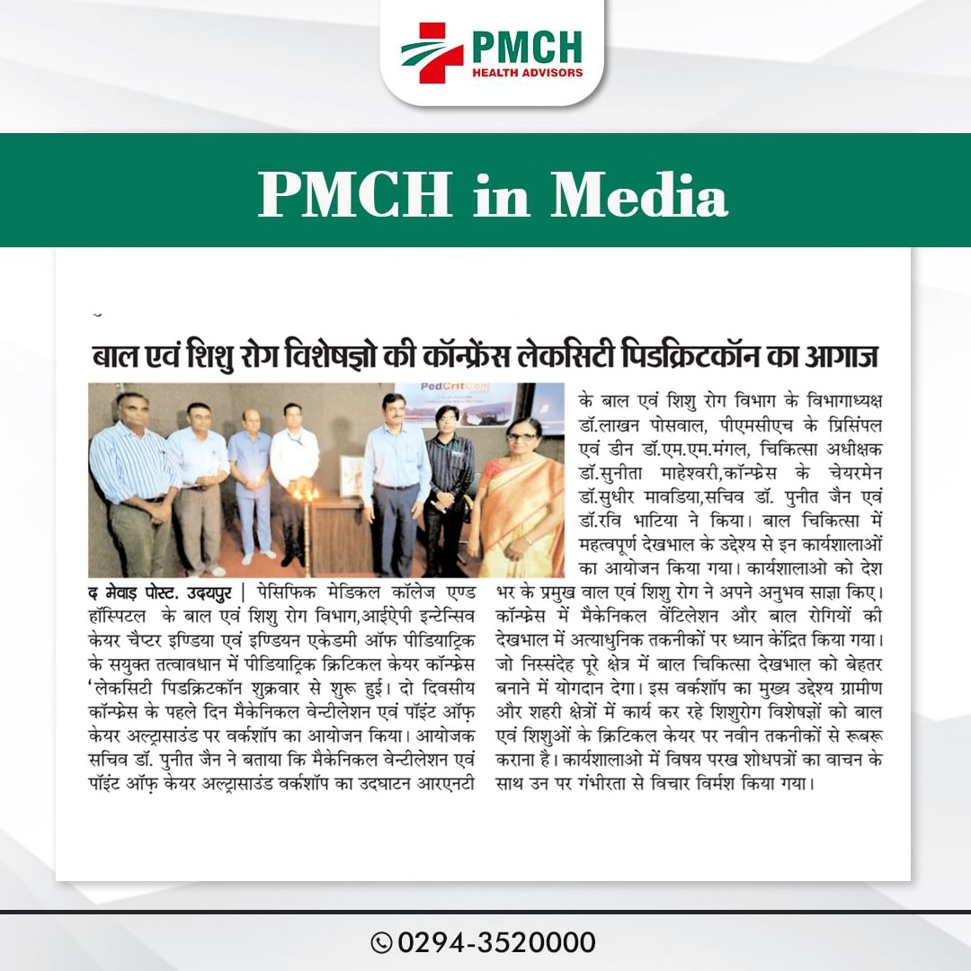पेसिफिक मेडिकल कॉलेज एवं हॉस्पिटल (PMCH) को एनएबीएच के 5वें संस्करण की पूर्ण मान्यता प्राप्त हुई है! यह मान्यता हमारे मरीजों को सर्वोच्च स्तर की सुरक्षा और गुणवत्तापूर्ण स्वास्थ्य सेवाएं प्रदान करने के प्रति हमारी प्रतिबद्धता का प्रमाण है। हम उदयपुर और दक्षिणी राजस्थान के लोगों को विश्वस्तरीय चिकित्सा सुविधाएं किफायती दरों पर उपलब्ध कराने के लिए निरंतर समर्पित हैं। आपका विश्वास हमारी ताकत है, और हम आपके लिए बेहतर स्वास्थ्य सेवाएं देने के लिए प्रतिबद्ध हैं।
