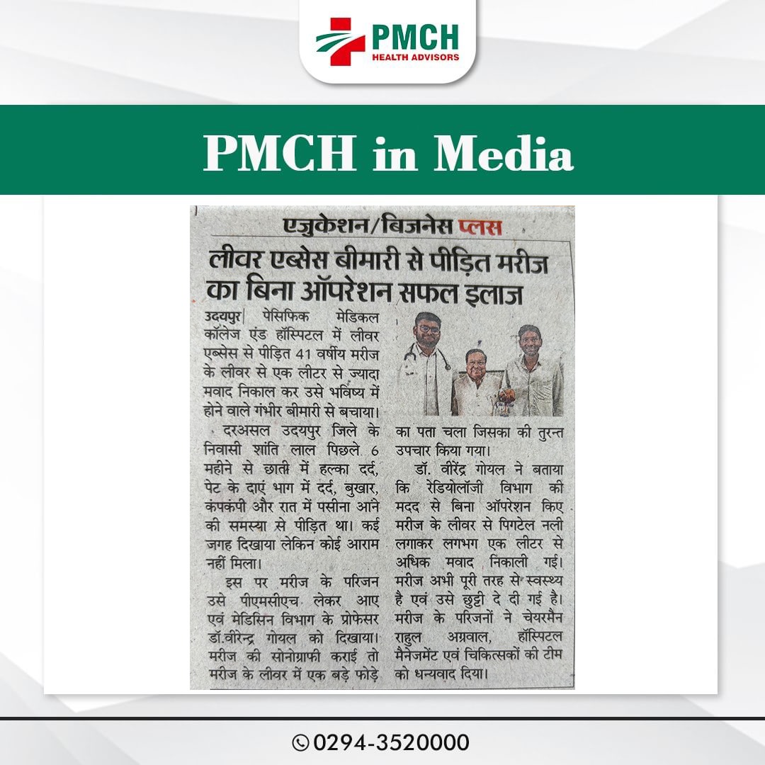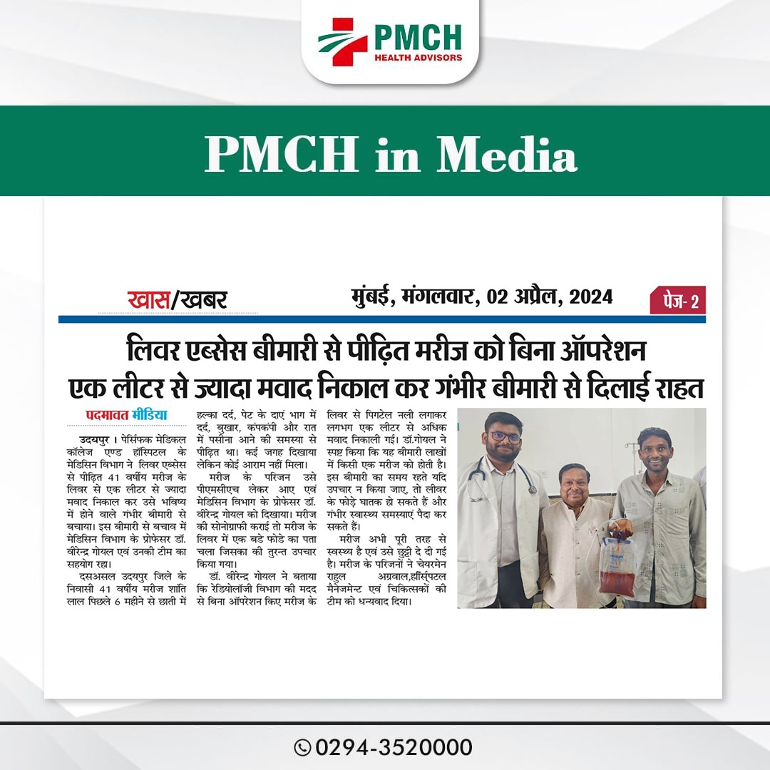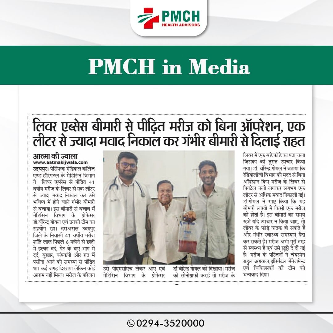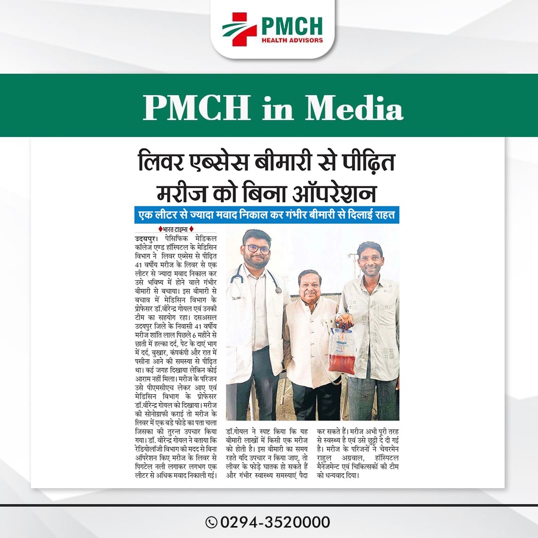 पेसिफिक मेडिकल कॉलेज एण्ड हॉस्पिटल के मेडिसिन विभाग ने लिवर एब्सेस से पीड़ित 41 वर्षीय मरीज के लिवर से एक लीटर से ज्यादा मवाद निकाल कर उसे भविष्य में होने वाले गंभीर बीमारी से बचाया। मरीज पिछले 6 महीने से छाती में दर्द, पेट दर्द, बुखार और पसीना आने की समस्या से पीड़ित था। डॉ. वीरेन्द्र गोयल की टीम ने रेडियोलॉजी विभाग की मदद से बिना ऑपरेशन किए मरीज के लिवर से पिगटेल नली लगाकर लगभग एक लीटर से अधिक मवाद निकाली गई। मरीज अभी पूरी तरह से स्वस्थ्य है एवं उसे छुट्टी दे दी गई है |
