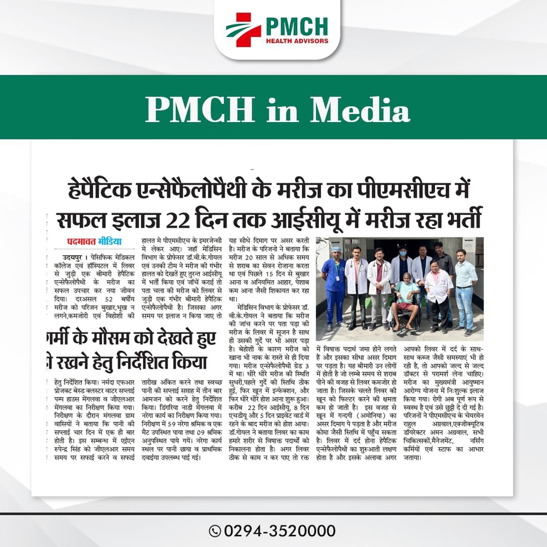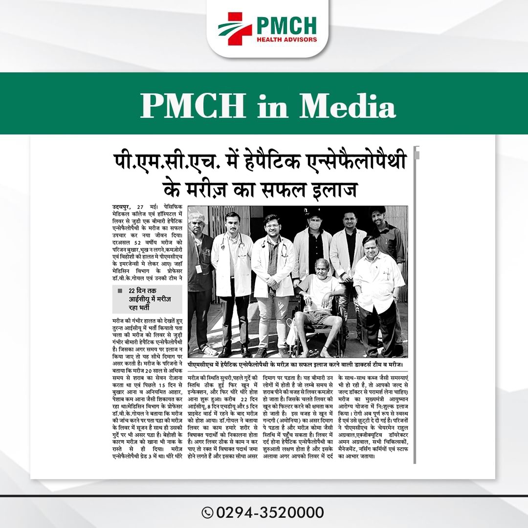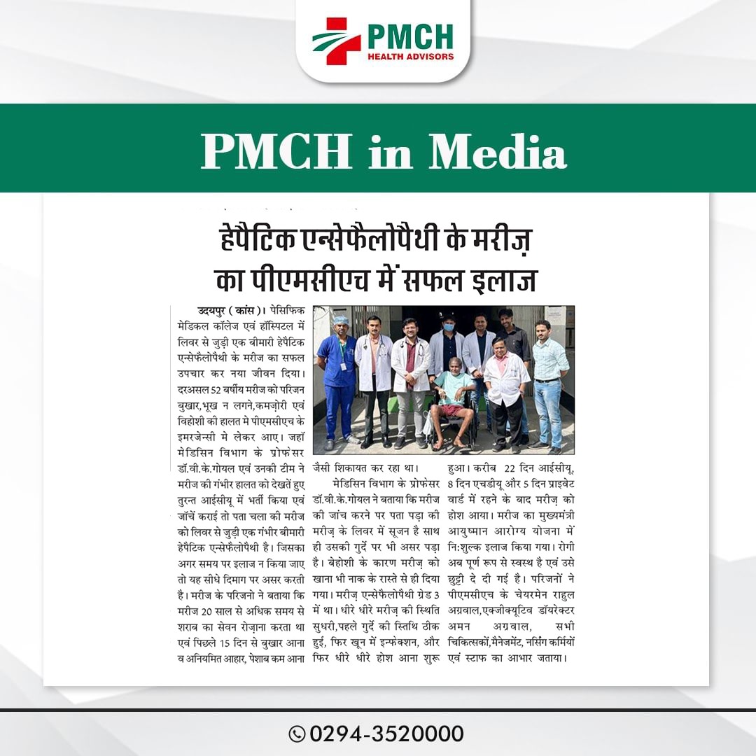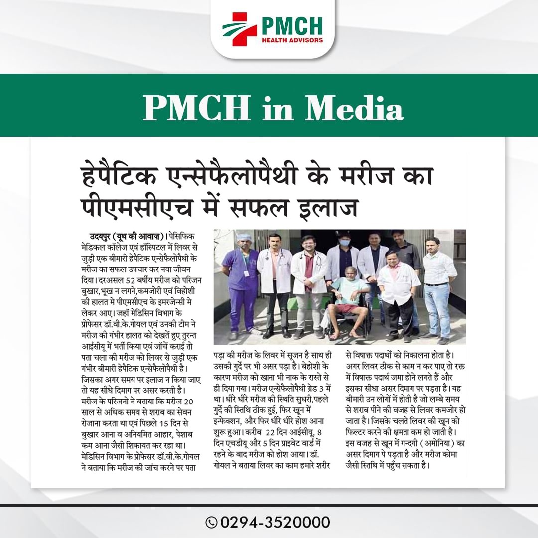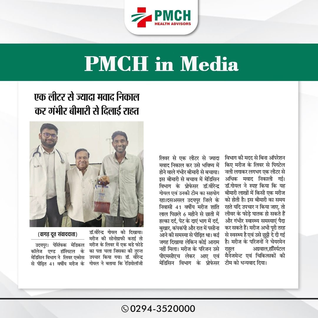 पेसिफिक मेडिकल कॉलेज एण्ड हॉस्पिटल के मेडिसिन विभाग ने लिवर एब्सेस से पीड़ित 41 वर्षीय मरीज के लिवर से एक लीटर से ज्यादा मवाद निकाल कर उसे भविष्य में होने वाले गंभीर बीमारी से बचाया। मरीज पिछले 6 महीने से छाती में दर्द, पेट दर्द, बुखार और पसीना आने की समस्या से पीड़ित था। डॉ. वीरेन्द्र गोयल की टीम ने रेडियोलॉजी विभाग की मदद से बिना ऑपरेशन किए मरीज के लिवर से पिगटेल नली लगाकर लगभग एक लीटर से अधिक मवाद निकाली गई। मरीज अभी पूरी तरह से स्वस्थ्य है एवं उसे छुट्टी दे दी गई है |