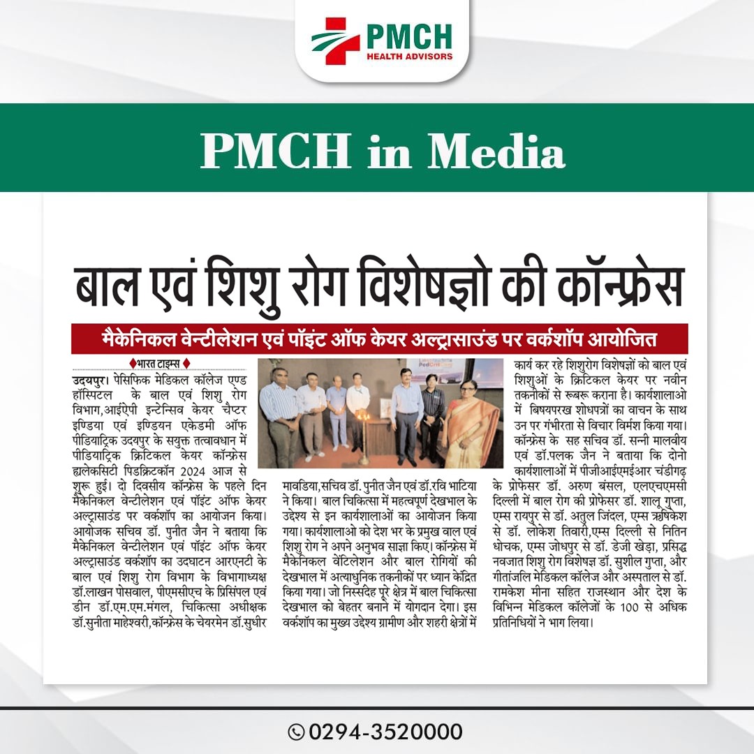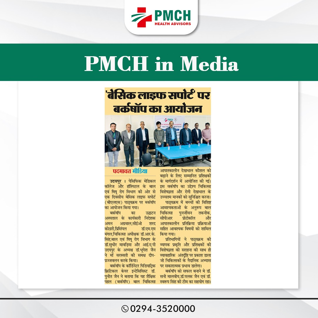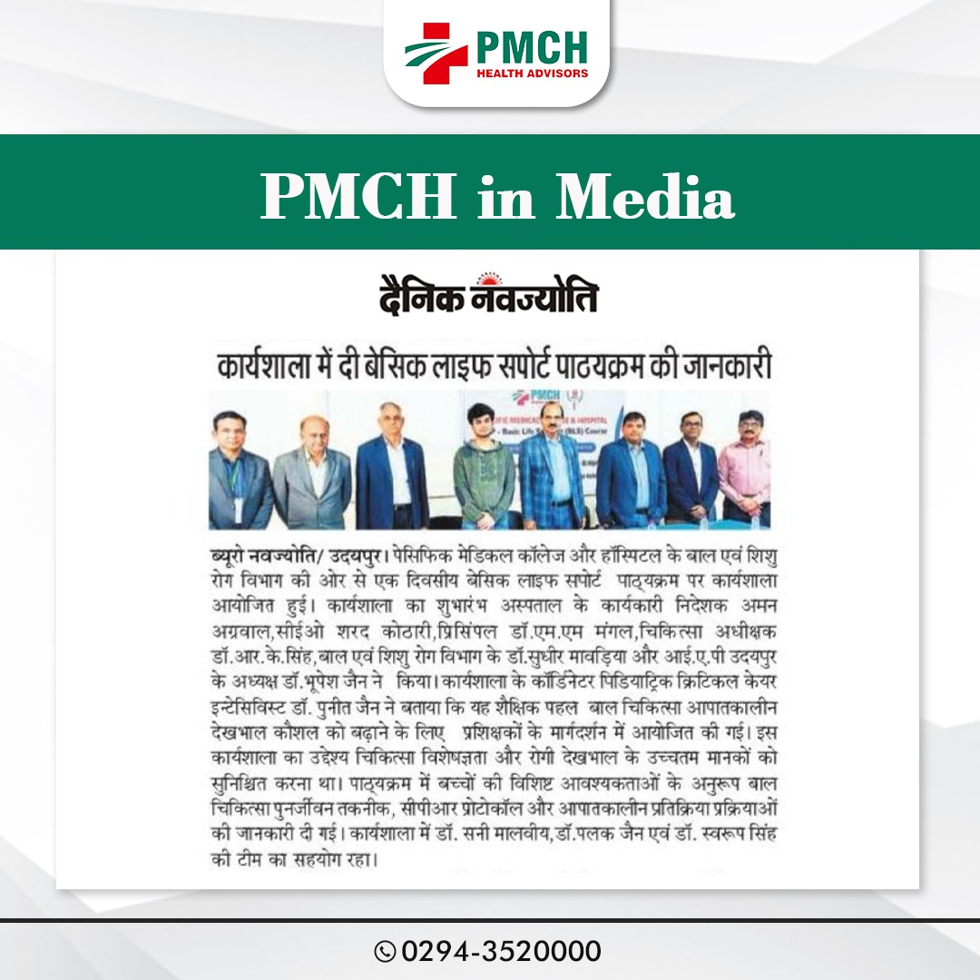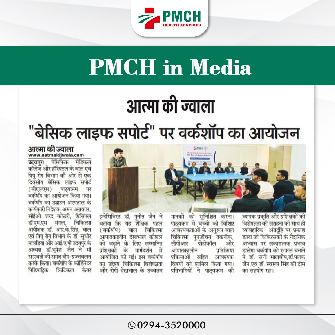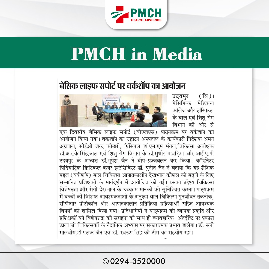 पेसिफिक मेडिकल कॉलेज और हॉस्पिटल के बाल एवं शिशु रोग विभाग की ओर से एक दिवसीय बेसिक लाइफ सपोर्ट पाठ्यक्रम पर कार्यशाला आयोजित हुई। कार्यशाला का शुभारंभ अस्पताल के कार्यकारी निदेशक अमन अग्रवाल, सीईओ शरद कोठारी, प्रिसिंपल डॉ. एम.एम मंगल, चिकित्सा अधीक्षक डॉ. आर. के. सिंह, बाल एवं शिशु रोग विभाग के डॉ. सुधीर मावड़िया और आई.ए.पी उदयपुर के अध्यक्ष डॉ. भूपेश जैन ने किया |