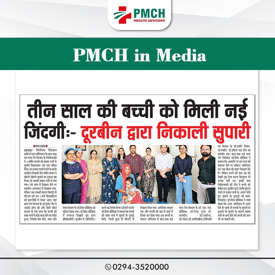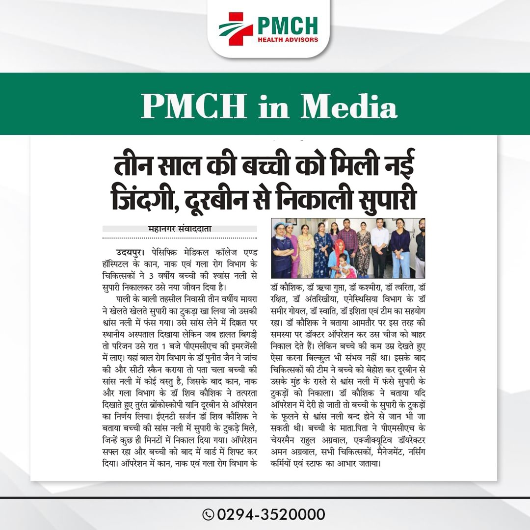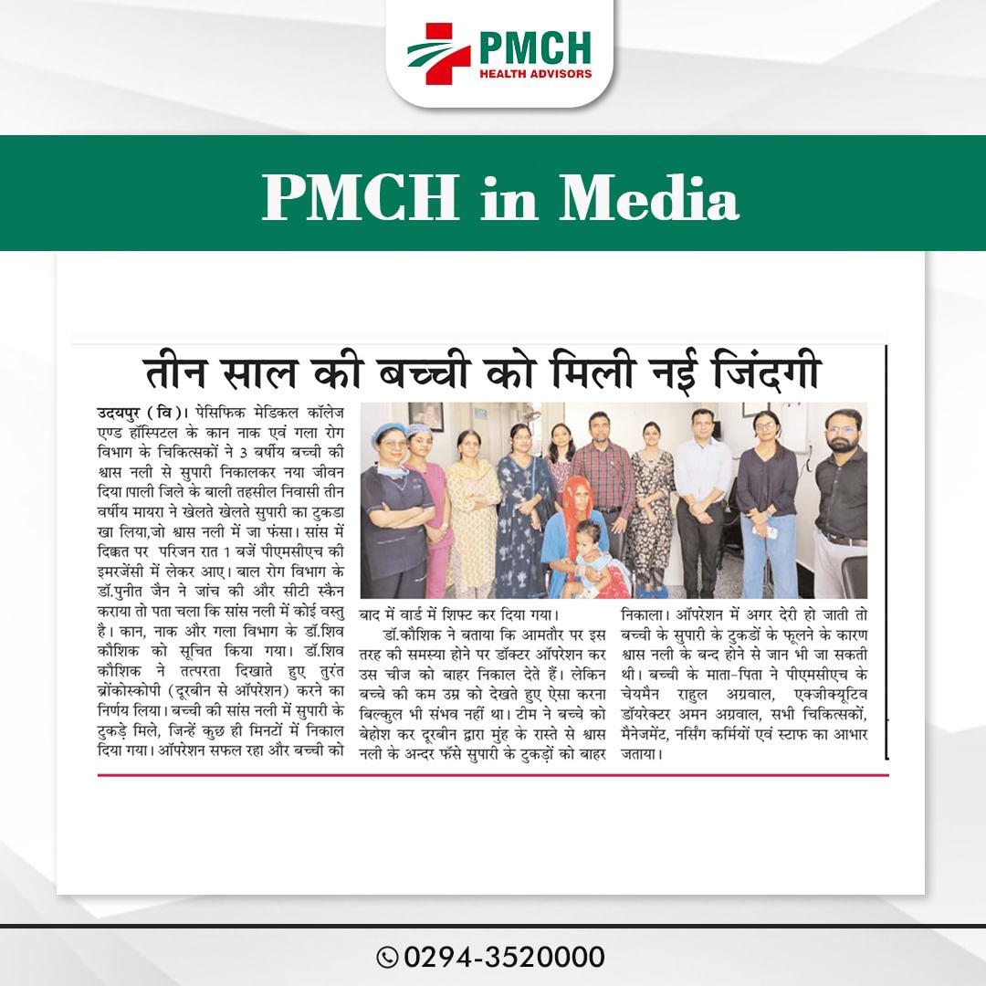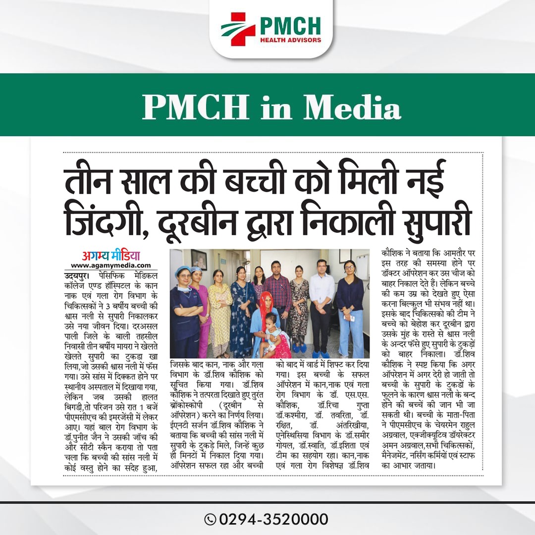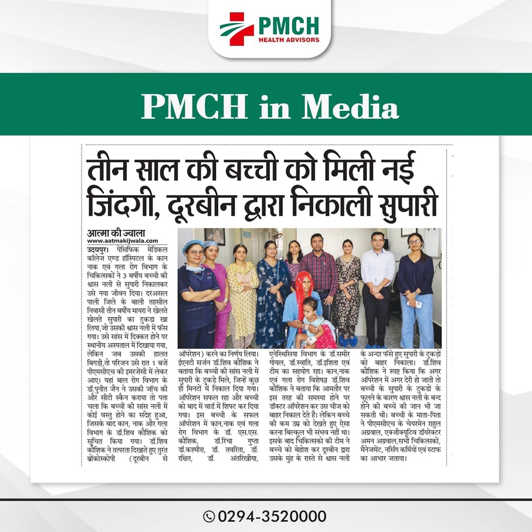 पीएमसीएच उदयपुर में 3 साल की बच्ची की जान बचाई गई, जिसने गलती से सुपारी निगल ली थी। हमारी मेडिकल टीम ने बिना सर्जरी के दूरबीन द्वारा सुपारी को सफलतापूर्वक निकाल कर बच्ची को नई जिंदगी दी। बिना सर्जरी के सुरक्षित इलाज उन्नत तकनीक और विशेषज्ञ डॉक्टर पीएमसीएच उदयपुर में हम हर मरीज को सबसे बेहतर और उन्नत चिकित्सा सेवाएं प्रदान करते हैं।