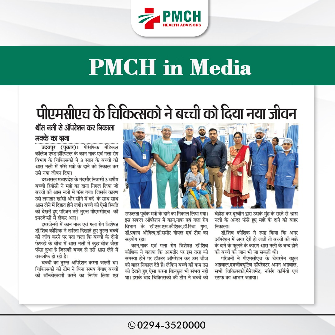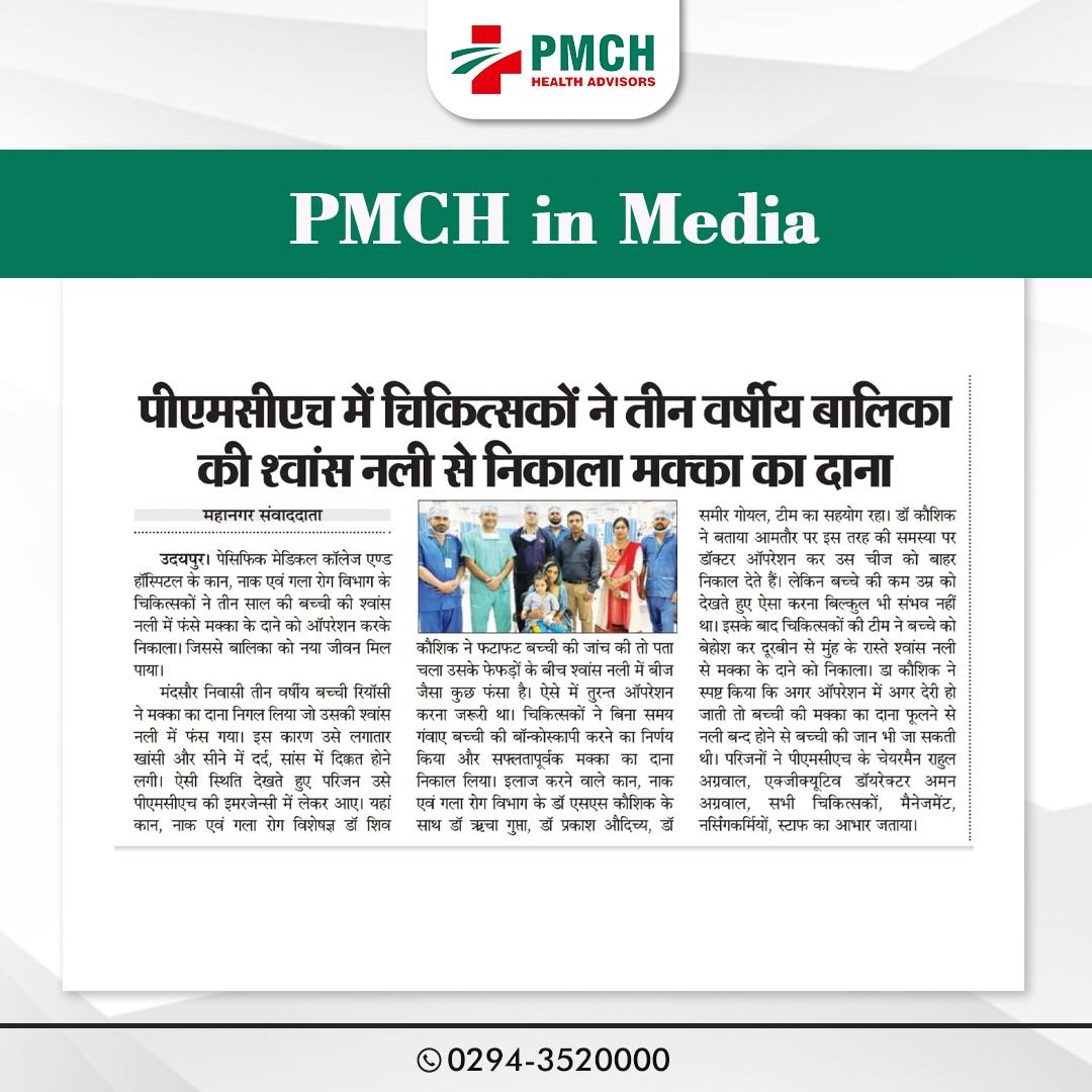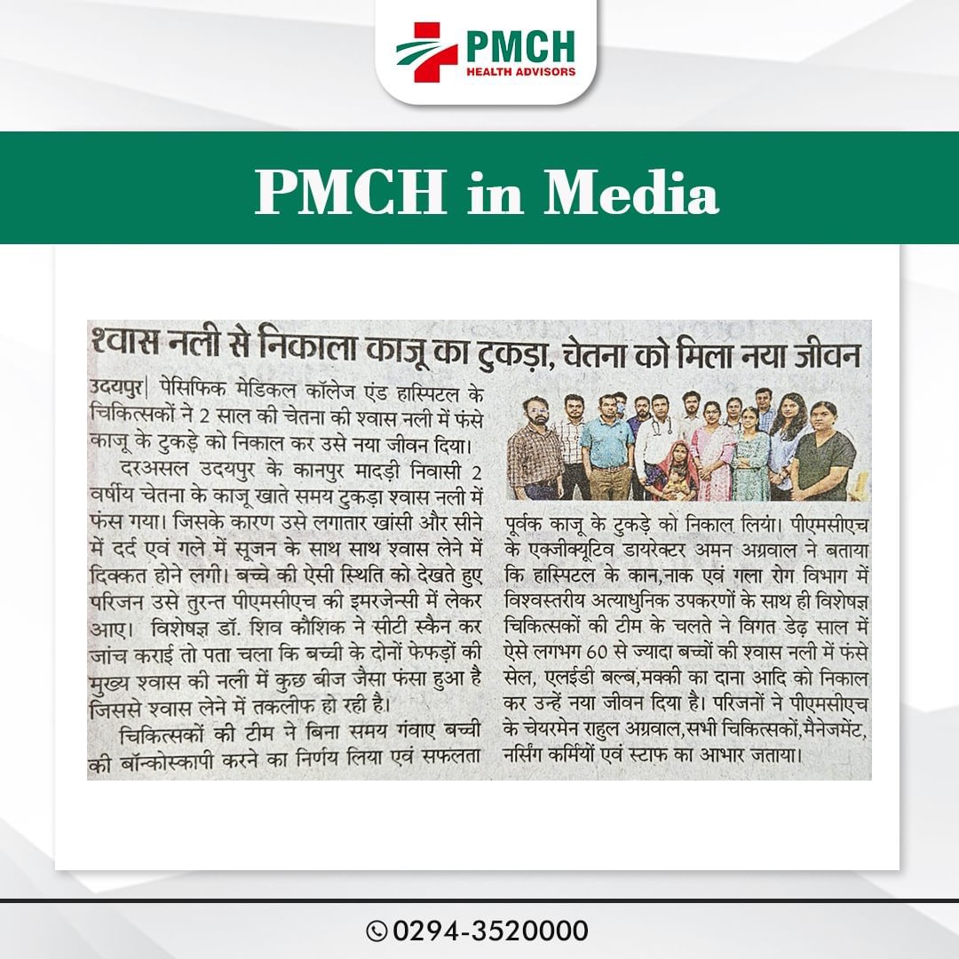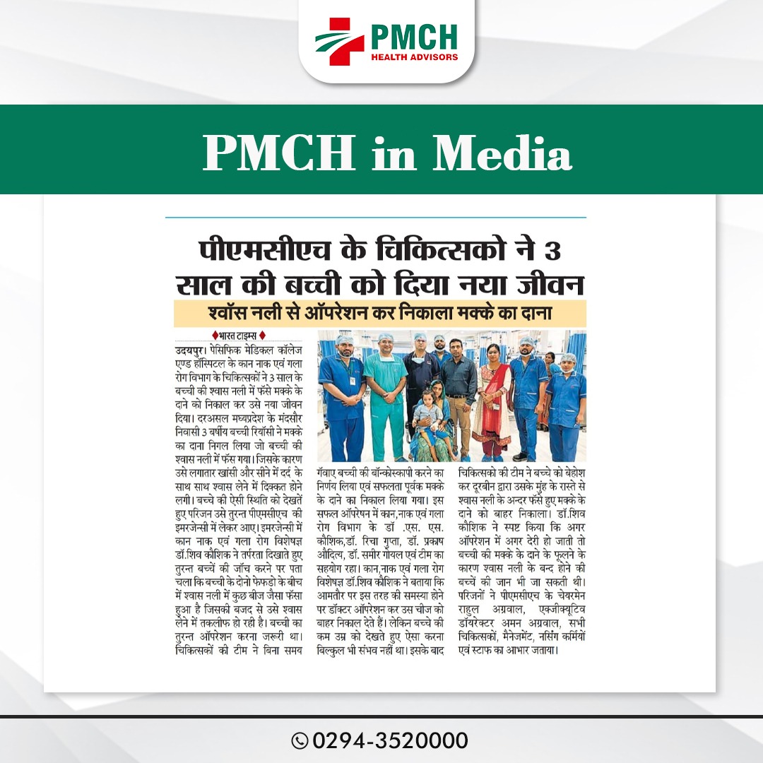 पीएमसीएच उदयपुर में 3 साल की बच्ची की जान बचाई गई, जिसने गलती से सुपारी निगल ली थी। हमारी मेडिकल टीम ने बिना सर्जरी के दूरबीन द्वारा सुपारी को सफलतापूर्वक निकाल कर बच्ची को नई जिंदगी दी। बिना सर्जरी के सुरक्षित इलाज उन्नत तकनीक और विशेषज्ञ डॉक्टर पीएमसीएच उदयपुर में हम हर मरीज को सबसे बेहतर और उन्नत चिकित्सा सेवाएं प्रदान करते हैं।