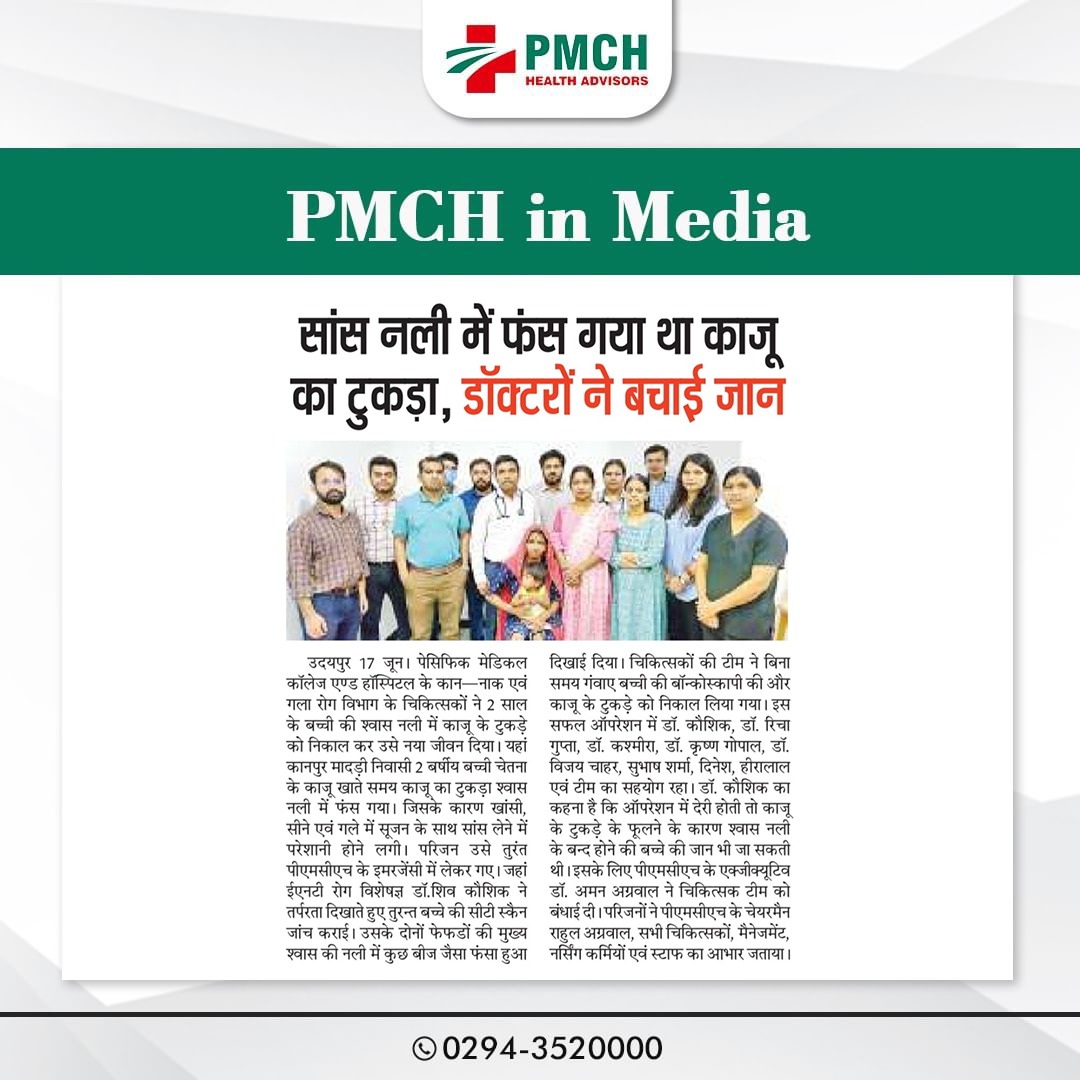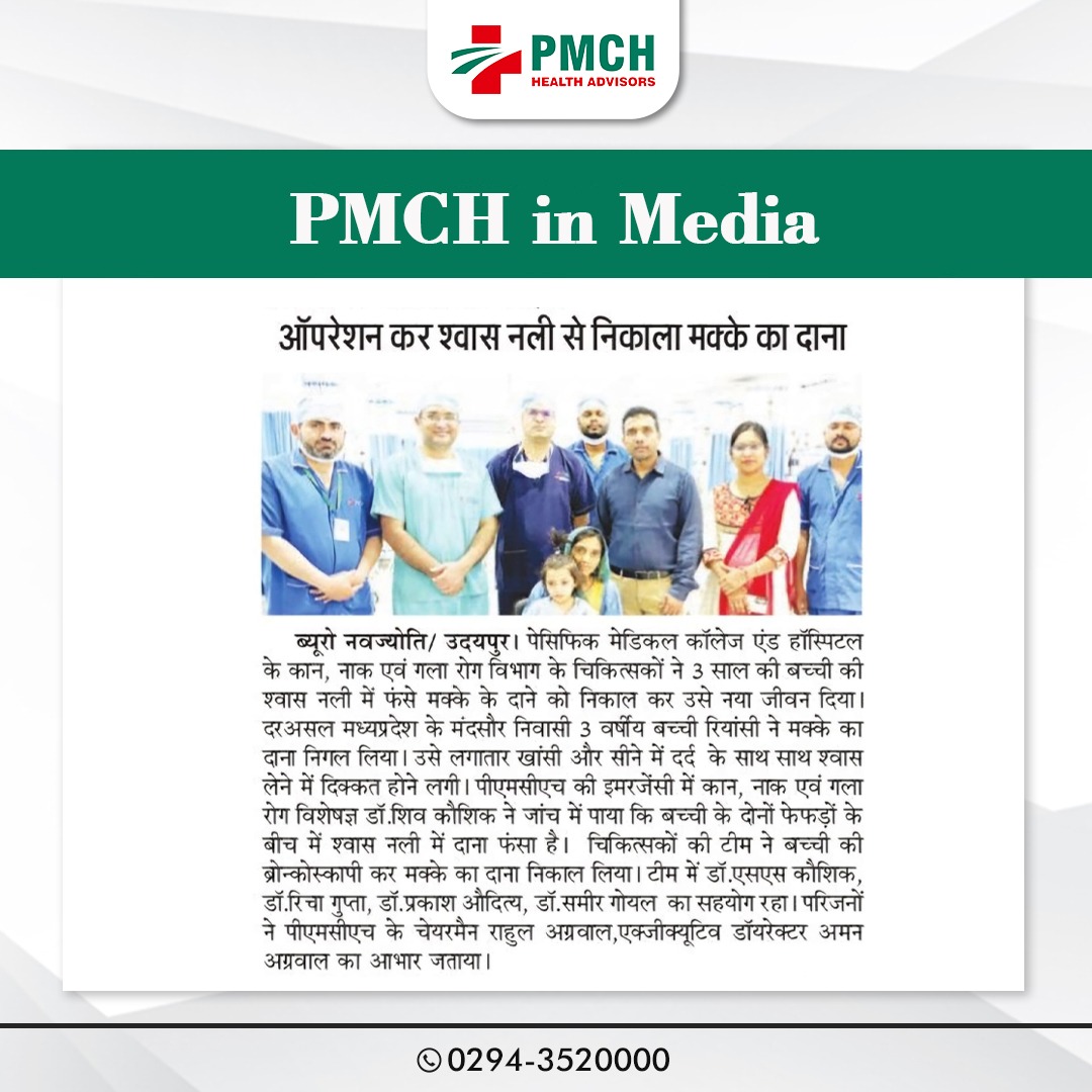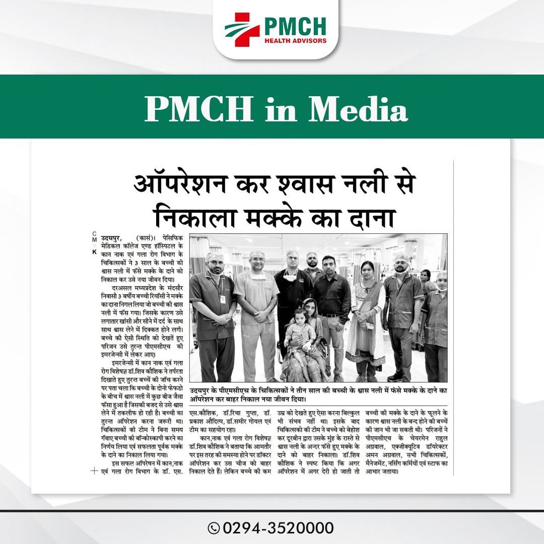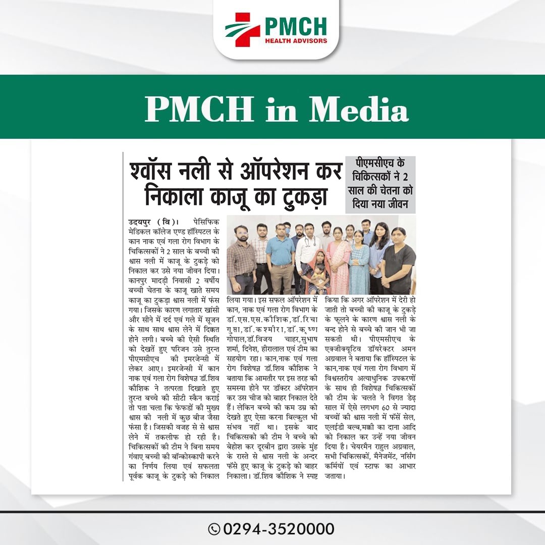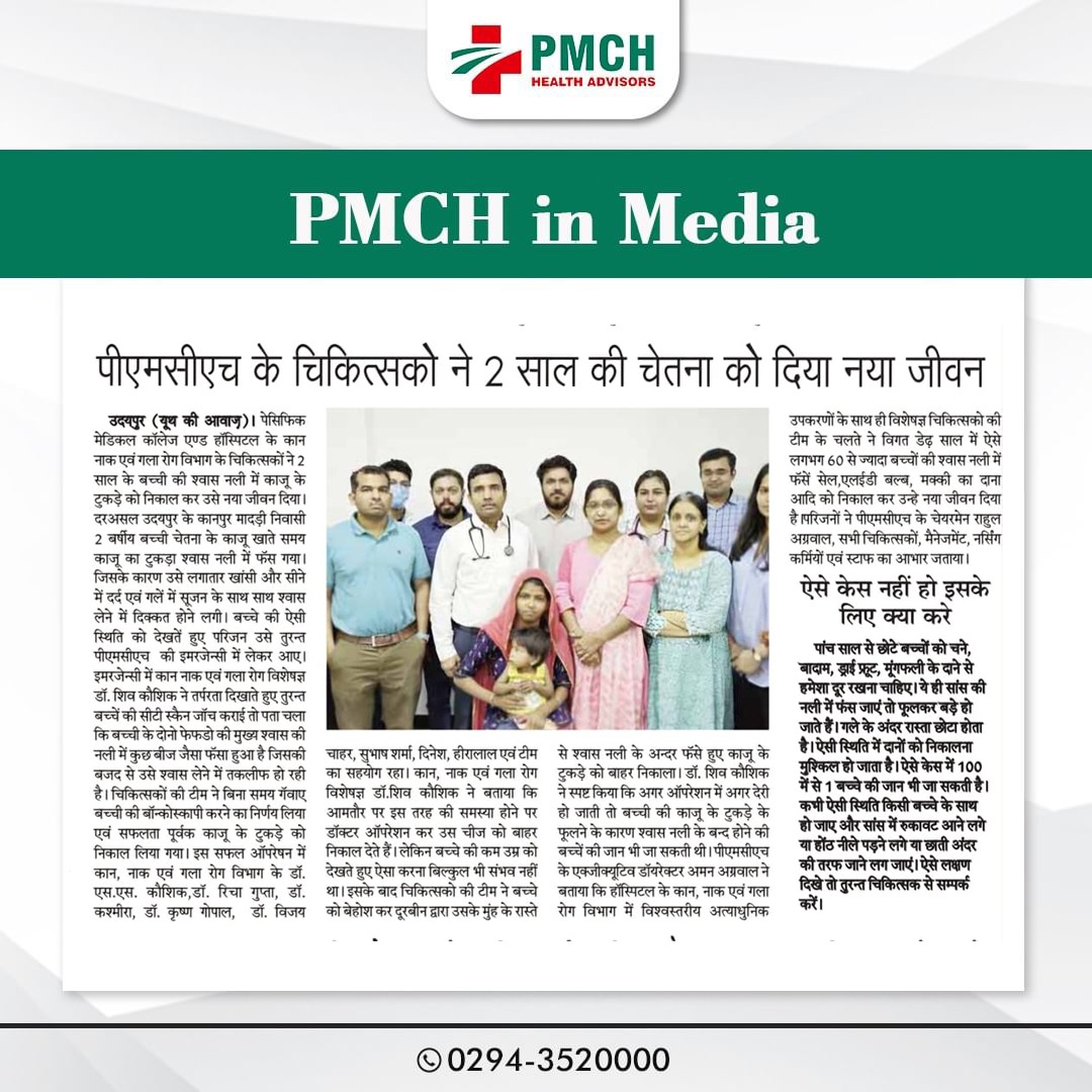 पीएमसीएच उदयपुर में 3 साल की बच्ची की जान बचाई गई, जिसने गलती से सुपारी निगल ली थी। हमारी मेडिकल टीम ने बिना सर्जरी के दूरबीन द्वारा सुपारी को सफलतापूर्वक निकाल कर बच्ची को नई जिंदगी दी। बिना सर्जरी के सुरक्षित इलाज उन्नत तकनीक और विशेषज्ञ डॉक्टर पीएमसीएच उदयपुर में हम हर मरीज को सबसे बेहतर और उन्नत चिकित्सा सेवाएं प्रदान करते हैं।