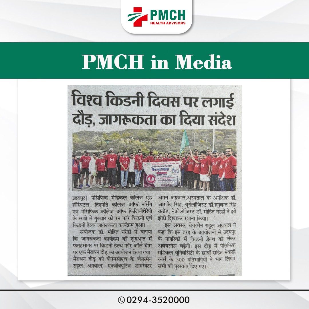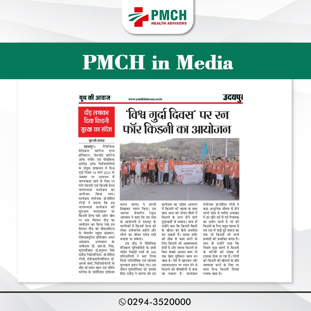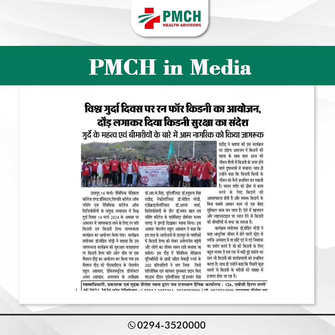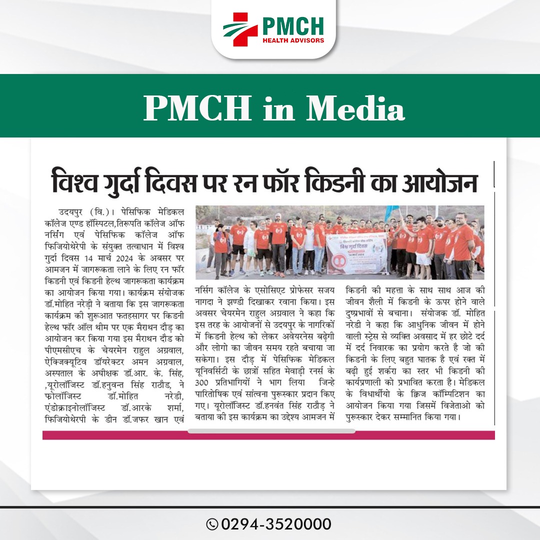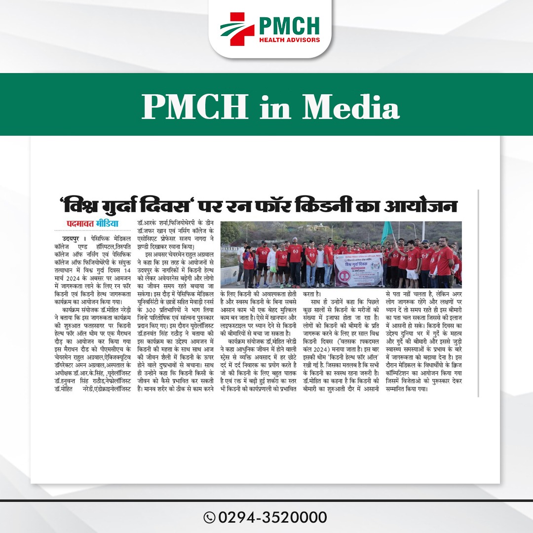पेसिफिक मेडिकल कॉलेज एण्ड हॉस्पिटल एवं पेसिफिक कॉलेज ऑफ फिजियोथेरेपी के संयुक्त तत्वाधान में विश्व गुर्दा दिवस 14 मार्च 2024 के अवसर पर आमजन में जागरूकता लाने के लिए रन फोर किडनी एवं किडनी हैल्थ जागरूकता कार्यक्रम का आयोजन किया गया। कार्यक्रम संयोजक डॉ. मोहित नरेड़ी ने बताया कि इस जागरूकता कार्यक्रम की शुरुआत फतहसागर पर किडनी हेल्थ फोर ऑल थीम पर एक मैराथन दौड़ का आयोजन कर कि गई इस मैराथन दौड को पीएमसीएच के चेयरमैन राहुल अग्रवाल, ऐक्जिक्यूटिव डॉयरेक्टर अमन अग्रवाल, ने झण्डी दिखाकर रवाना किया