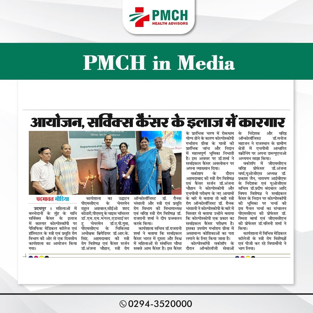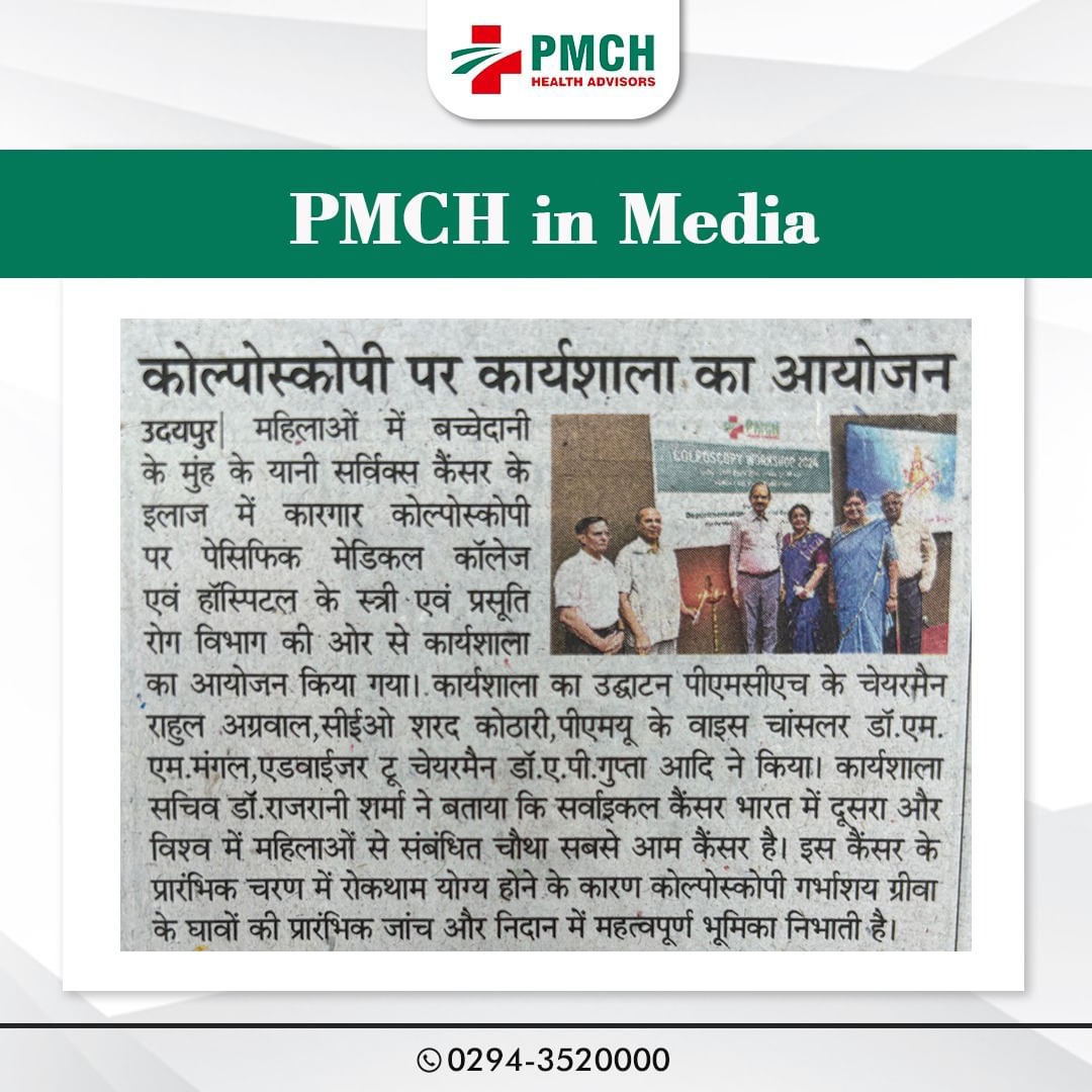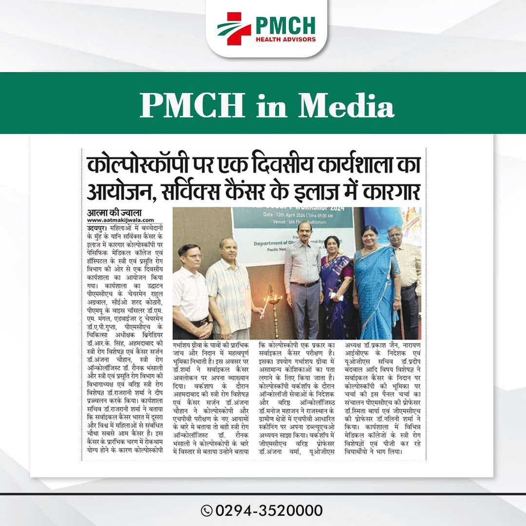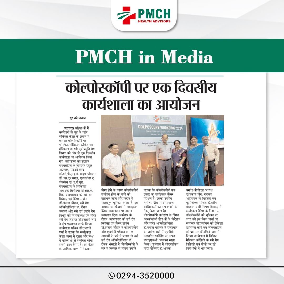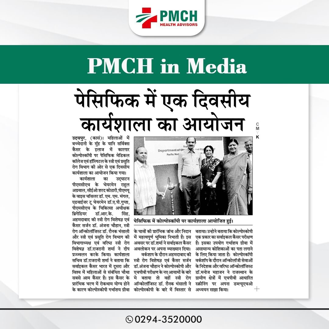 महिलाओं में बच्चेदानी के मुॅह के यानि सर्विक्स कैंसर के इलाज में कारगार कोल्पोस्कॉपी पर पेसिफिक मेडिकल कॉलेज एवं हॉस्पिटल के स्त्री एवं प्रसूति रोग विभाग की ओर से एक दिवसीय कार्यशाला का आयोजन किया गया। कार्यशाला का उद्घाटन पीएमसीएच के चेयरमेन राहुल अग्रवाल,सीईओ शरद कोठारी,पीएमयू के वाइस चॉसलर डॉ.एम.एम.मंगल,एडवाईजर टू चेयरमेन डॉ.ए.पी.गुप्ता, पीएमसीएच के चिकित्सा अधीक्षक ब्रिगेडियर डॉ.आर.के. सिंह, अहमदाबाद की स्त्री रोग विशेषज्ञ एवं कैंसर सर्जन डॉ.अंजना चौहान, स्त्री रोग ऑन्कोलॉजिस्ट डॉ. रौनक भंसाली और स्त्री एवं प्रसूति रोग विभाग की विभागाध्यक्ष एवं वरिष्ठ स्त्री रोग विशेषज्ञ डॉ.राजरानी शर्मा ने दीप प्रज्ज्वलन करके किया।