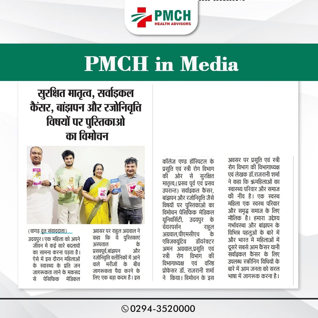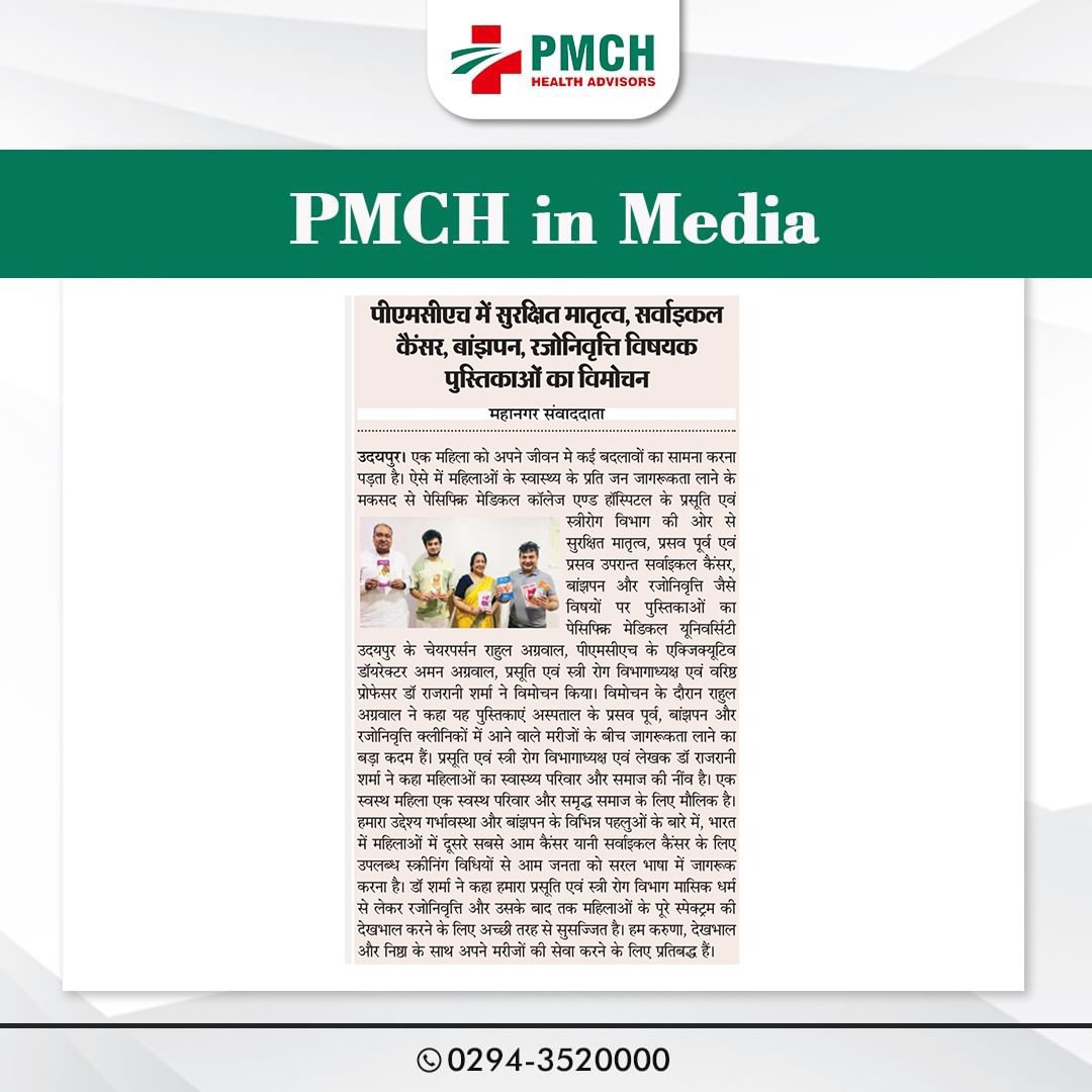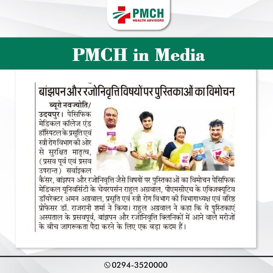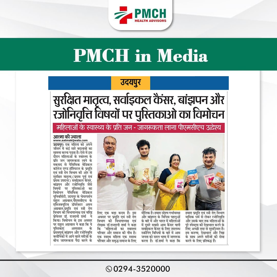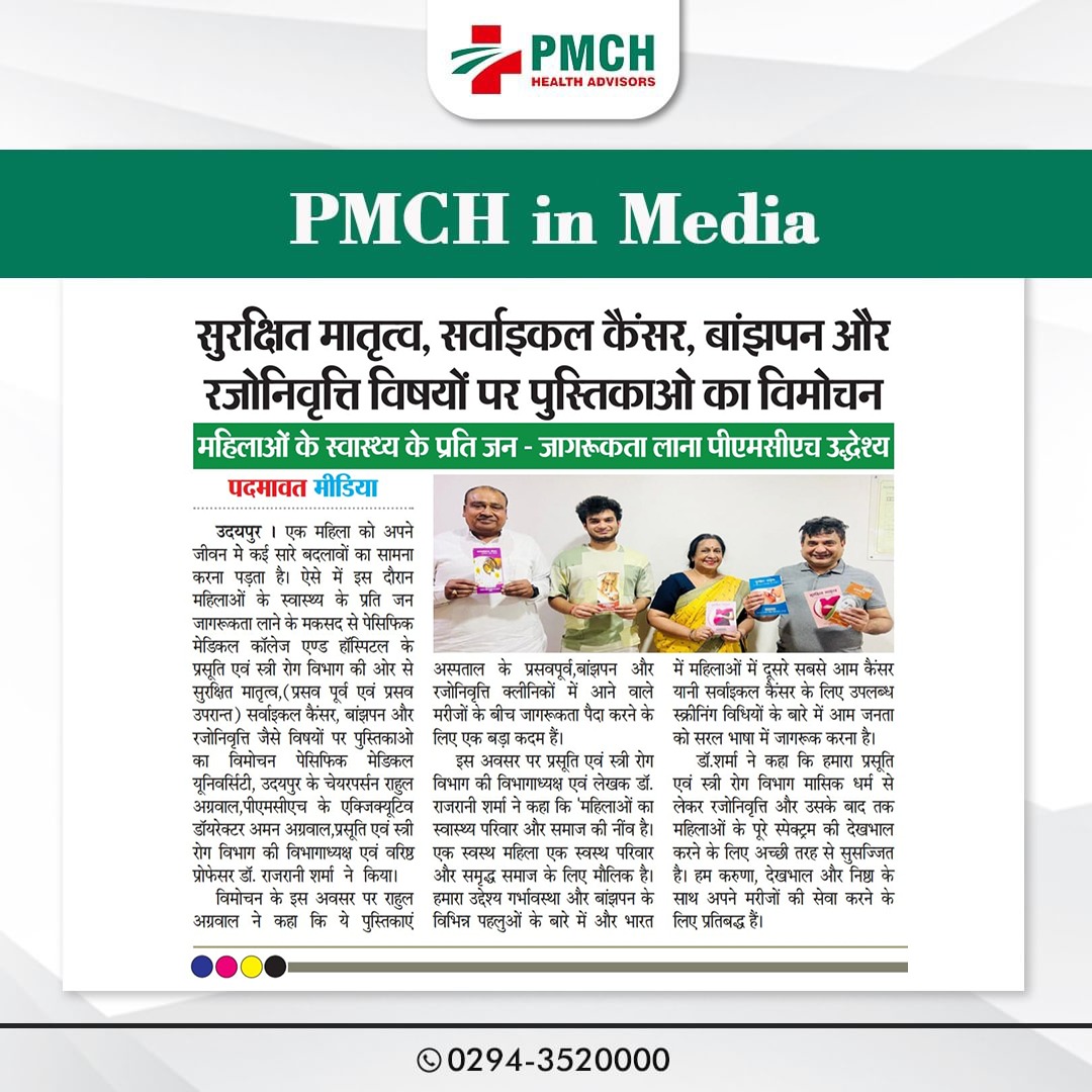 एक महिला को अपने जीवन मे कई सारे बदलावों का सामना करना पड़ता है। ऐसे में इस दौरान महिलाओं के स्वास्थ्य के प्रति जन जागरूकता लाने के मकसद से पेसिफिक मेडिकल काॅलेज एण्ड हास्पिटल के प्रसूति एवं स्त्री रोग विभाग की ओर से सुरक्षित मातृत्व,(प्रसव पूर्व एवं प्रसव उपरान्त) सर्वाइकल कैंसर, बांझपन और रजोनिवृत्ति जैसे विषयों पर पुस्तिकाओ का विमोचन पेसिफिक मेडिकल यूनिवर्सिटी, उदयपुर के चेयरपर्सन राहुल अग्रवाल,पीएमसीएच के एक्जिक्यूटिव डाॅयरेक्टर अमन अग्रवाल,प्रसूति एवं स्त्री रोग विभाग की विभागाध्यक्ष एवं वरिष्ठ प्रोफेसर डॉ. राजरानी शर्मा ने किया। विमोचन पर राहुल अग्रवाल ने कहा कि ये पुस्तिकाएं अस्पताल के प्रसवपूर्व,बांझपन और रजोनिवृत्ति क्लीनिकों में आने वाले मरीजों के बीच जागरूकता पैदा करने के लिए एक बड़ा कदम हैं।