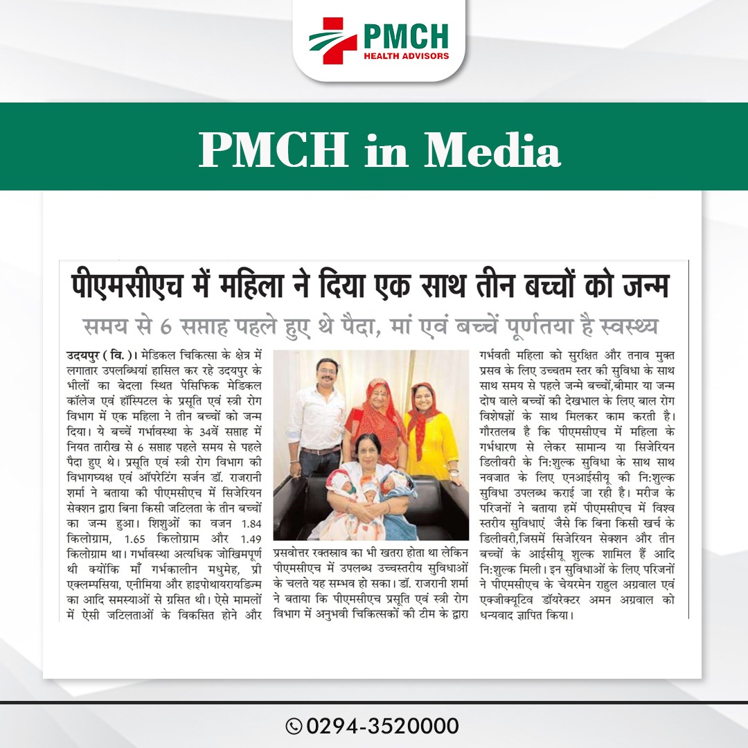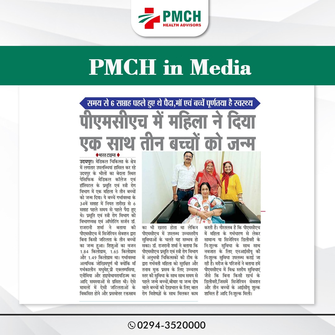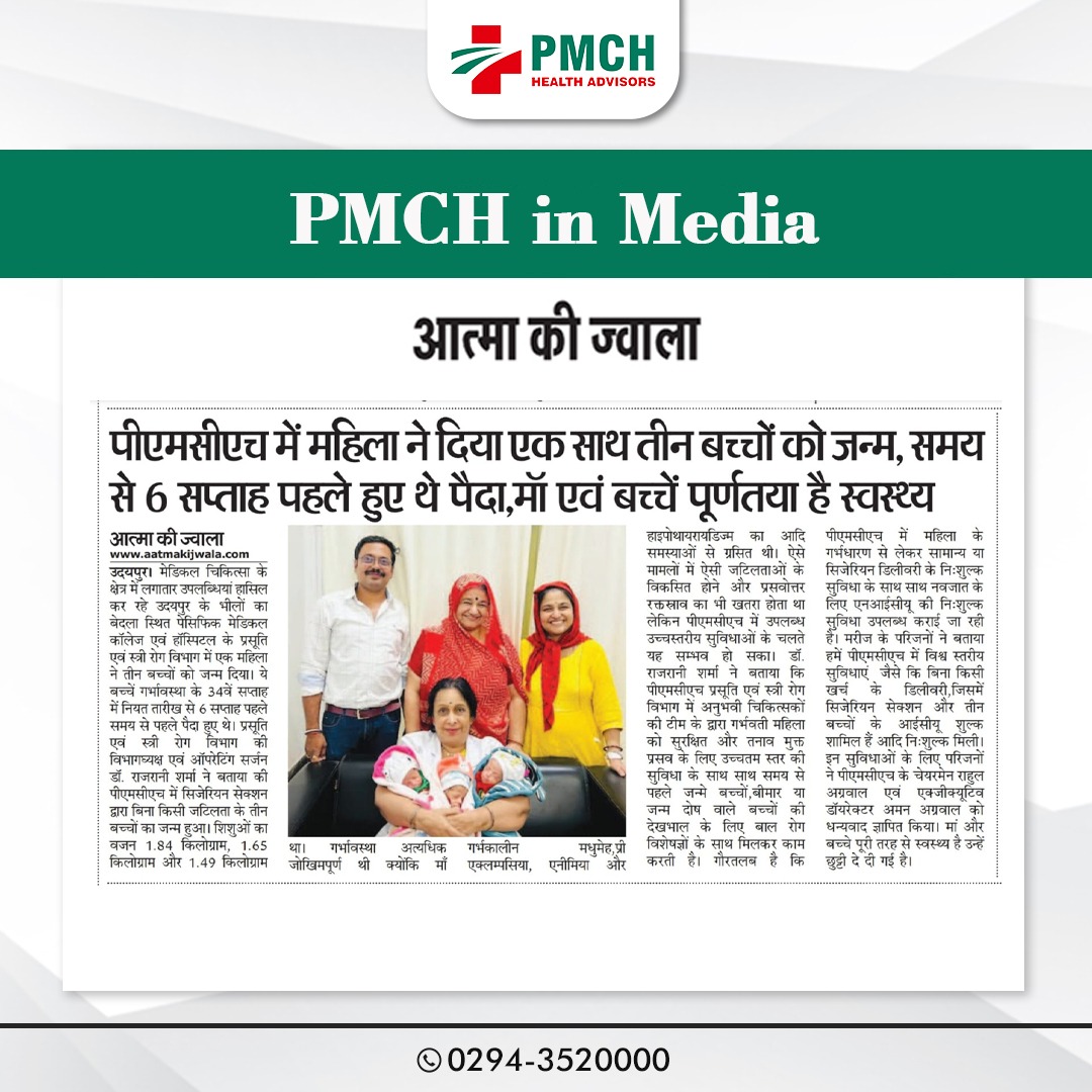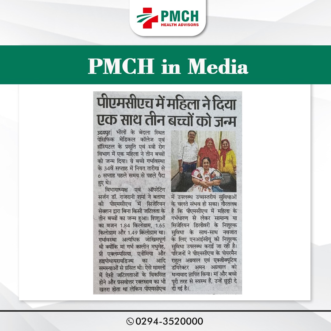 मेडिकल चिकित्सा के क्षेत्र में लगातार उपलब्धियां हासिल कर रहे उदयपुर के भीलों का बेदला स्थित पेसिफिक मेडिकल कॉलेज एवं हॉस्पिटल के प्रसूति एवं स्त्री रोग विभाग में एक महिला ने तीन बच्चों को जन्म दिया। ये बच्चें गर्भावस्था के 34वें सप्ताह में नियत तारीख से 6 सप्ताह पहले समय से पहले पैदा हुए थे। प्रसूति एवं स्त्री रोग विभाग की विभागघ्यक्ष एवं ऑपरेटिंग सर्जन डॉ. राजरानी शर्मा ने बताया की पीएमसीएच में सिजेरियन सेक्शन द्वारा बिना किसी जटिलता के तीन बच्चों का जन्म हुआ। शिशुओं का वजन 1.84 किलोग्राम, 1.65 किलोग्राम और 1.49 किलोग्राम था। गर्भावस्था अत्यधिक जोखिमपूर्ण थी क्योंकि माँ गर्भकालीन मधुमेह,प्री एक्लम्पसिया,एनीमिया और हाइपोथायरायडिज्म का आदि समस्याओं से ग्रसित थी।
