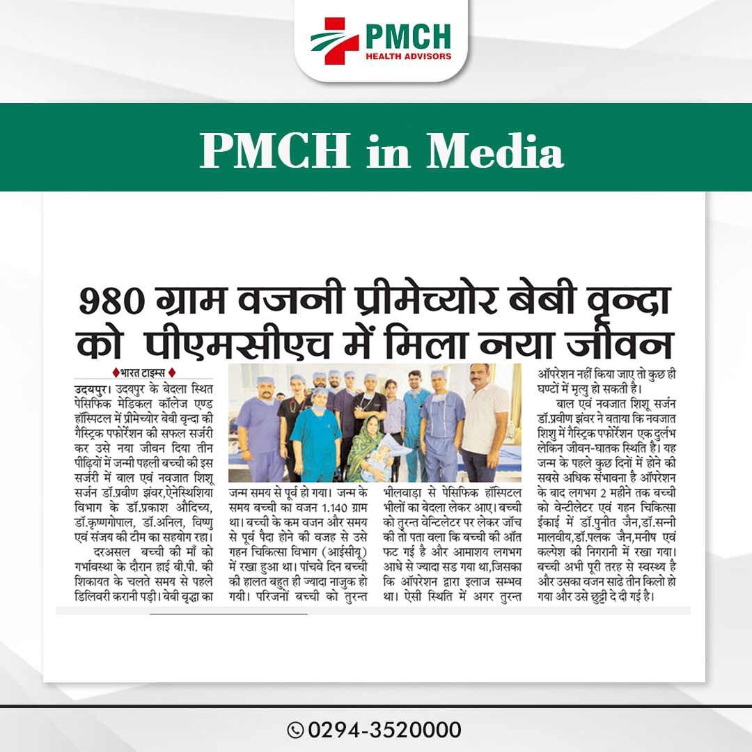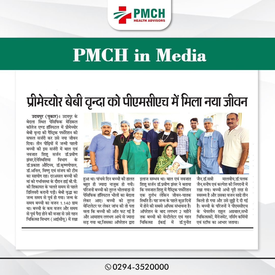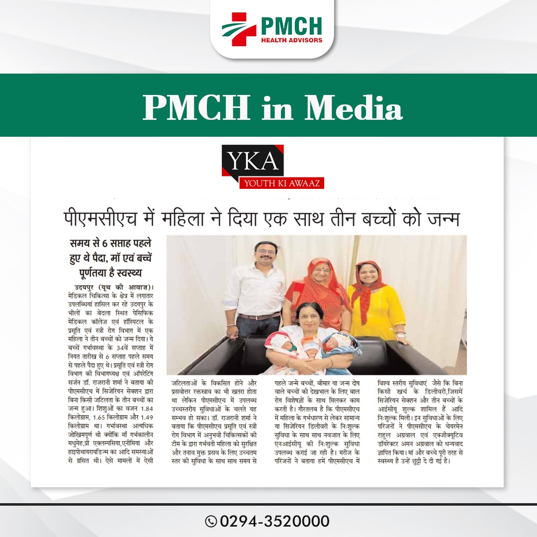 मेडिकल चिकित्सा के क्षेत्र में लगातार उपलब्धियां हासिल कर रहे उदयपुर के भीलों का बेदला स्थित पेसिफिक मेडिकल कॉलेज एवं हॉस्पिटल के प्रसूति एवं स्त्री रोग विभाग में एक महिला ने तीन बच्चों को जन्म दिया। ये बच्चें गर्भावस्था के 34वें सप्ताह में नियत तारीख से 6 सप्ताह पहले समय से पहले पैदा हुए थे। प्रसूति एवं स्त्री रोग विभाग की विभागघ्यक्ष एवं ऑपरेटिंग सर्जन डॉ. राजरानी शर्मा ने बताया की पीएमसीएच में सिजेरियन सेक्शन द्वारा बिना किसी जटिलता के तीन बच्चों का जन्म हुआ। शिशुओं का वजन 1.84 किलोग्राम, 1.65 किलोग्राम और 1.49 किलोग्राम था। गर्भावस्था अत्यधिक जोखिमपूर्ण थी क्योंकि माँ गर्भकालीन मधुमेह,प्री एक्लम्पसिया,एनीमिया और हाइपोथायरायडिज्म का आदि समस्याओं से ग्रसित थी।