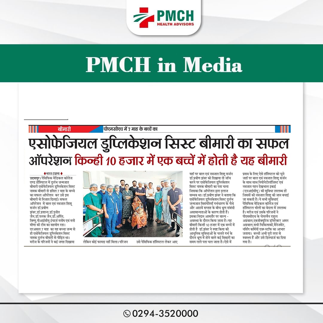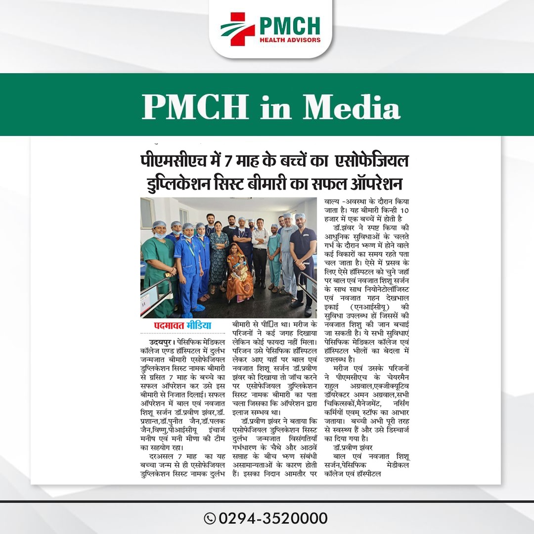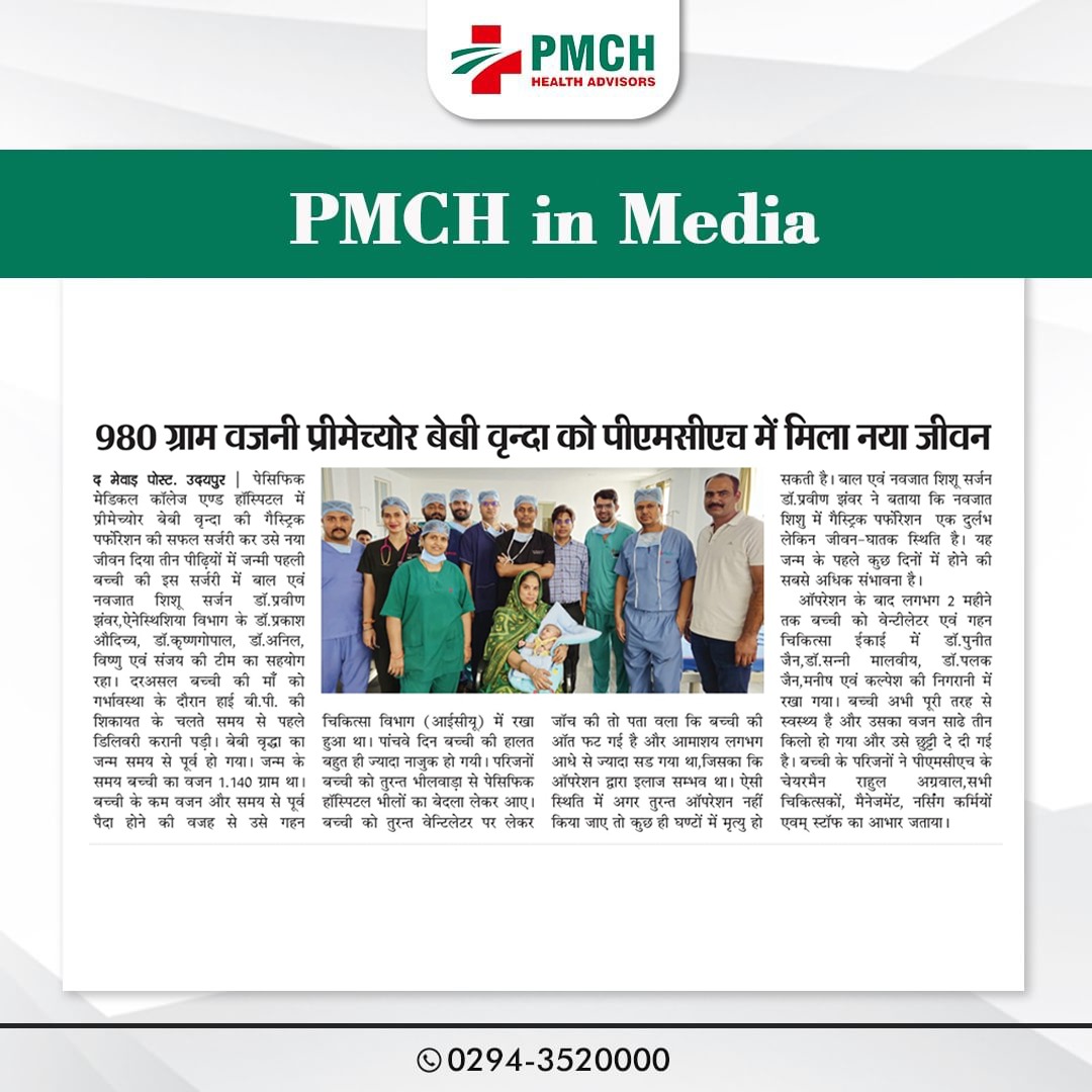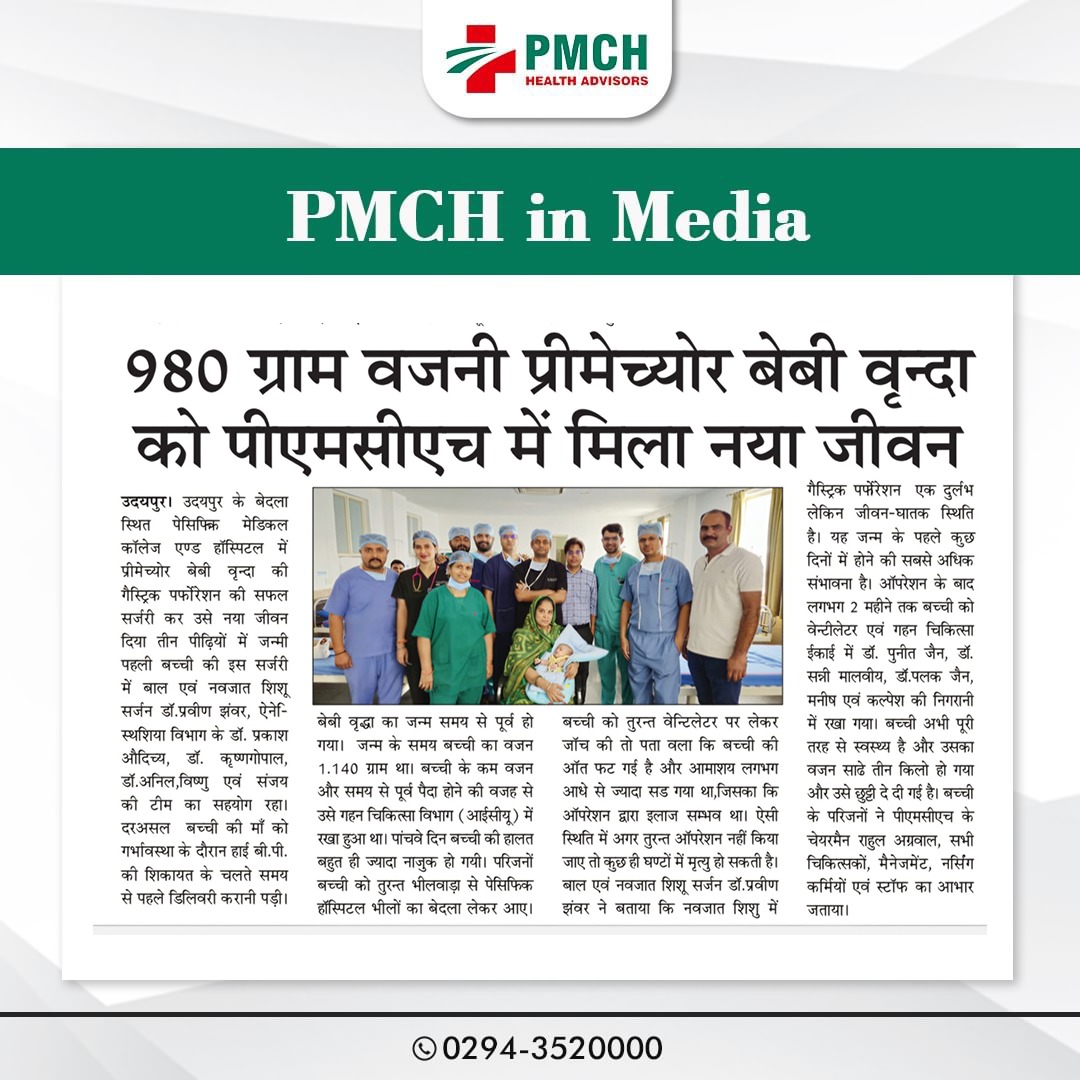 मेडिकल चिकित्सा के क्षेत्र में लगातार उपलब्धियां हासिल कर रहे उदयपुर के भीलों का बेदला स्थित पेसिफिक मेडिकल कॉलेज एवं हॉस्पिटल के प्रसूति एवं स्त्री रोग विभाग में एक महिला ने तीन बच्चों को जन्म दिया। ये बच्चें गर्भावस्था के 34वें सप्ताह में नियत तारीख से 6 सप्ताह पहले समय से पहले पैदा हुए थे। प्रसूति एवं स्त्री रोग विभाग की विभागघ्यक्ष एवं ऑपरेटिंग सर्जन डॉ. राजरानी शर्मा ने बताया की पीएमसीएच में सिजेरियन सेक्शन द्वारा बिना किसी जटिलता के तीन बच्चों का जन्म हुआ। शिशुओं का वजन 1.84 किलोग्राम, 1.65 किलोग्राम और 1.49 किलोग्राम था। गर्भावस्था अत्यधिक जोखिमपूर्ण थी क्योंकि माँ गर्भकालीन मधुमेह,प्री एक्लम्पसिया,एनीमिया और हाइपोथायरायडिज्म का आदि समस्याओं से ग्रसित थी।