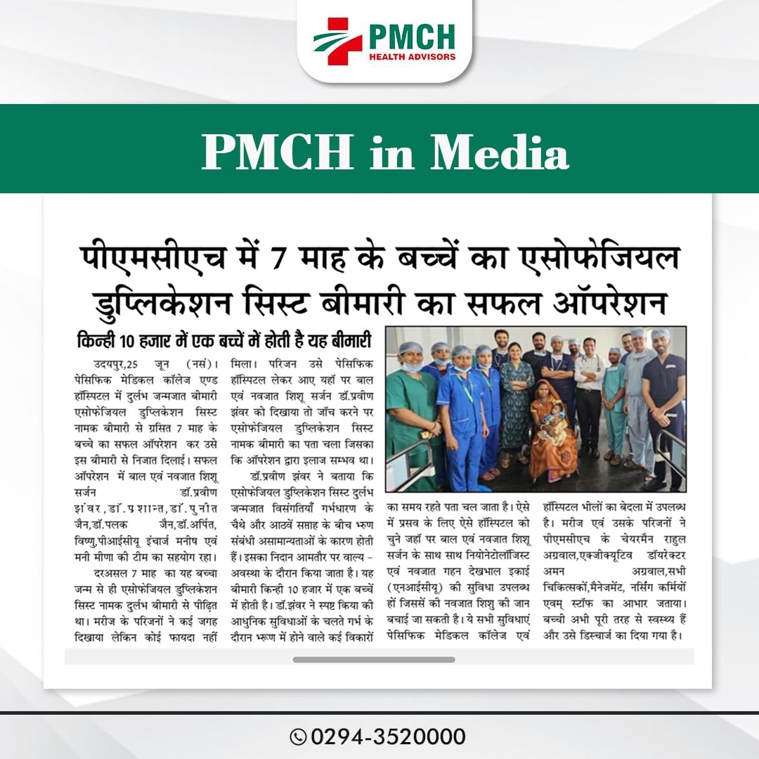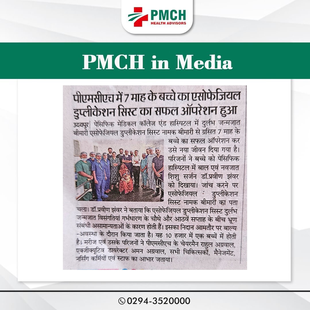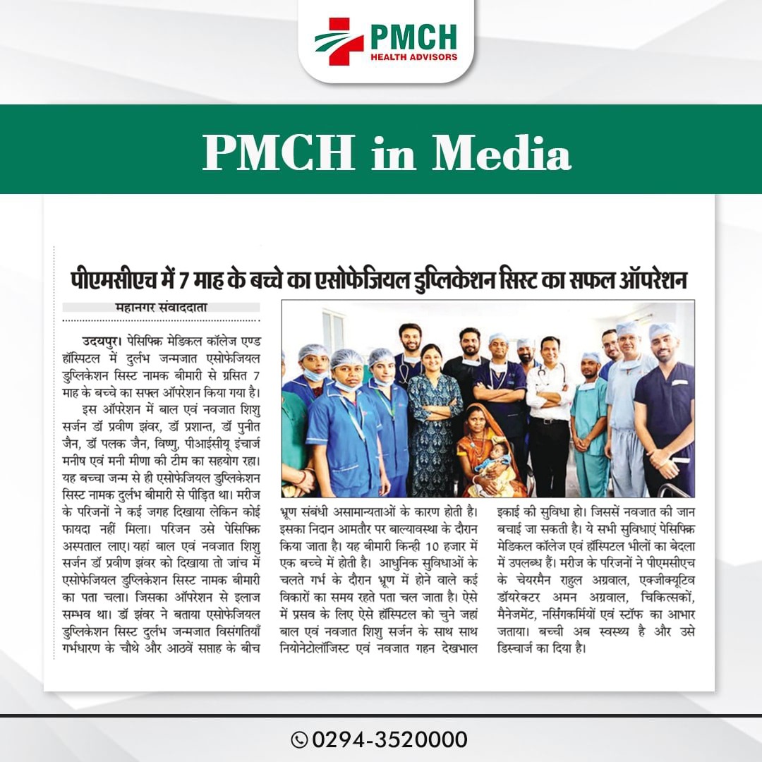 PMCH,उदयपुर के डॉक्टरों ने 2 साल की चेतना को नया जीवन दिया। चेतना को गंभीर स्वास्थ्य समस्या थी, जिसे सर्जरी के माध्यम से सफलतापूर्वक ठीक किया गया। डॉक्टर अल्का माथुर और डॉ. एस.पी. सिंह के नेतृत्व में डॉ. उमेश, डॉ. सोफिया, डॉ. ईशान और डॉ. निधि सहित टीम ने यह महत्वपूर्ण सर्जरी की। चेतना के माता-पिता ने डॉक्टरों का आभार व्यक्त किया और अस्पताल के प्रशासन ने सफल इलाज पर खुशी जताई।