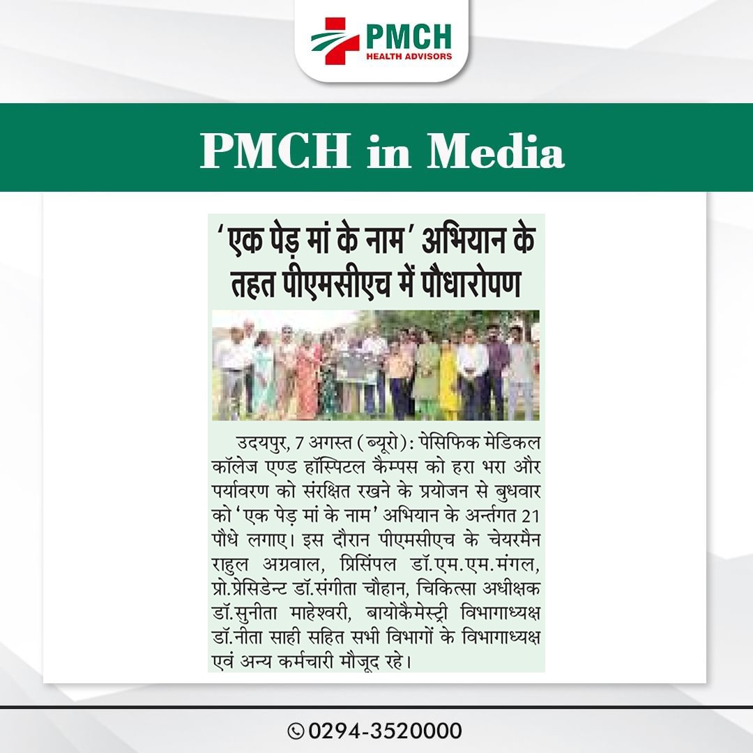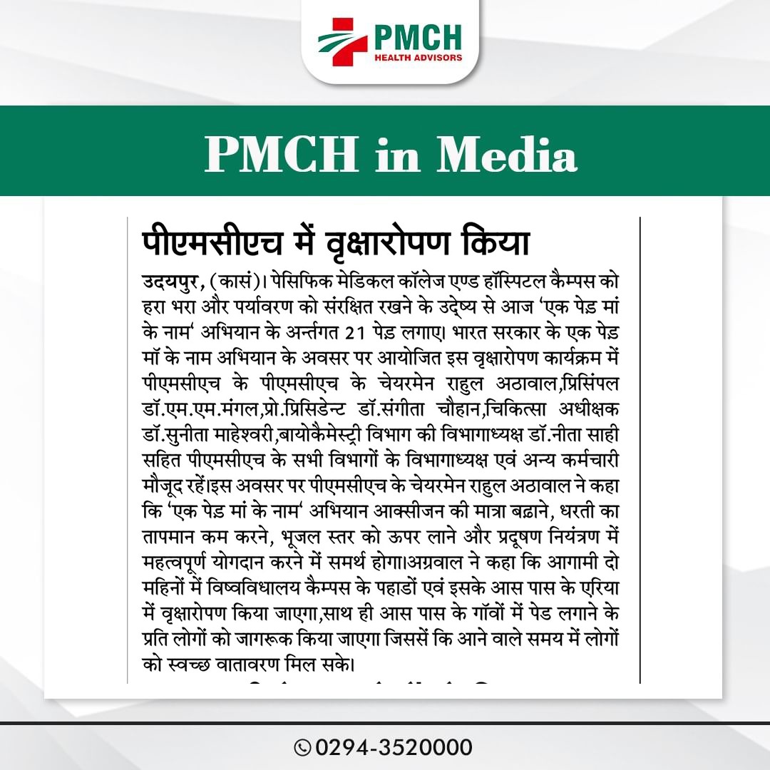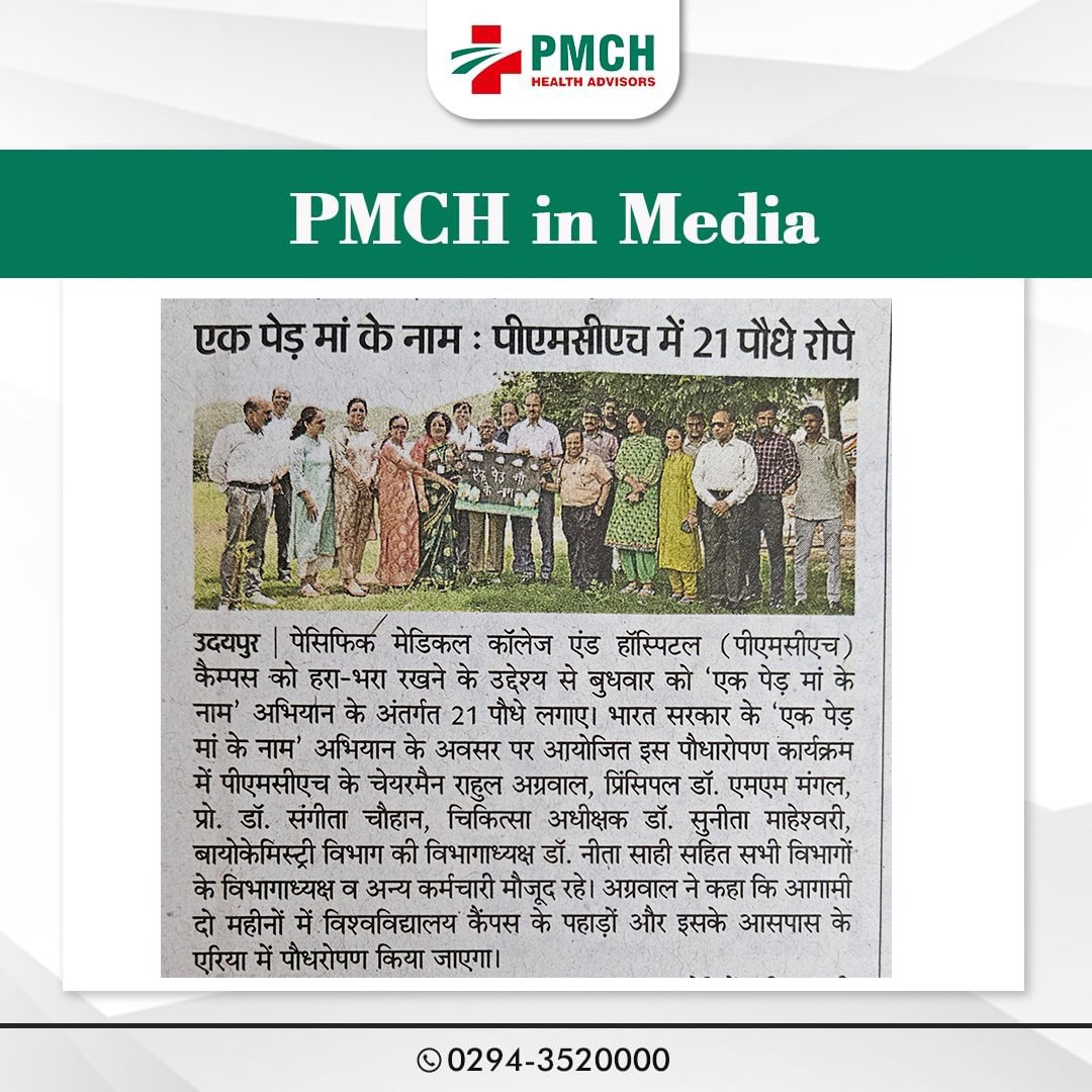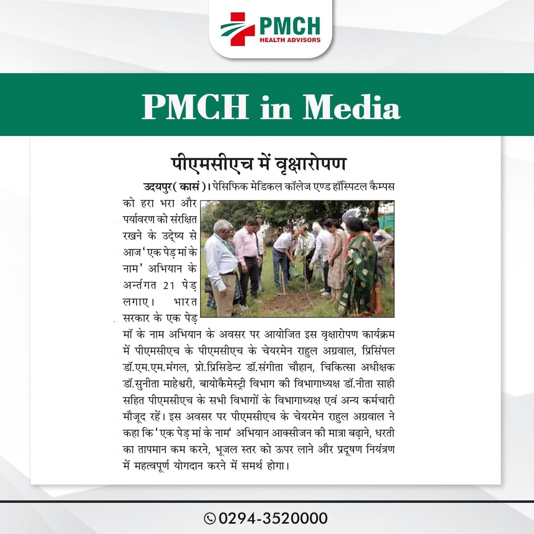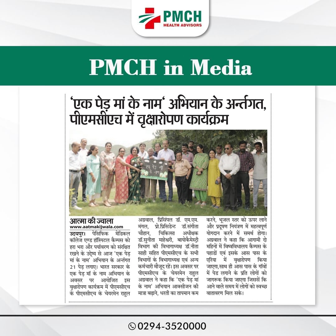 उदयपुर के पैसिफिक मेडिकल कॉलेज एंड हॉस्पिटल (PMCH) ने पर्यावरण संरक्षण के लिए 'एक पेड़ मां के नाम' अभियान के तहत 21 पेड़ लगाए। इस पहल से ग्लोबल वार्मिंग कम होगी और आने वाली पीढ़ियों को स्वच्छ वातावरण मिलेगा।