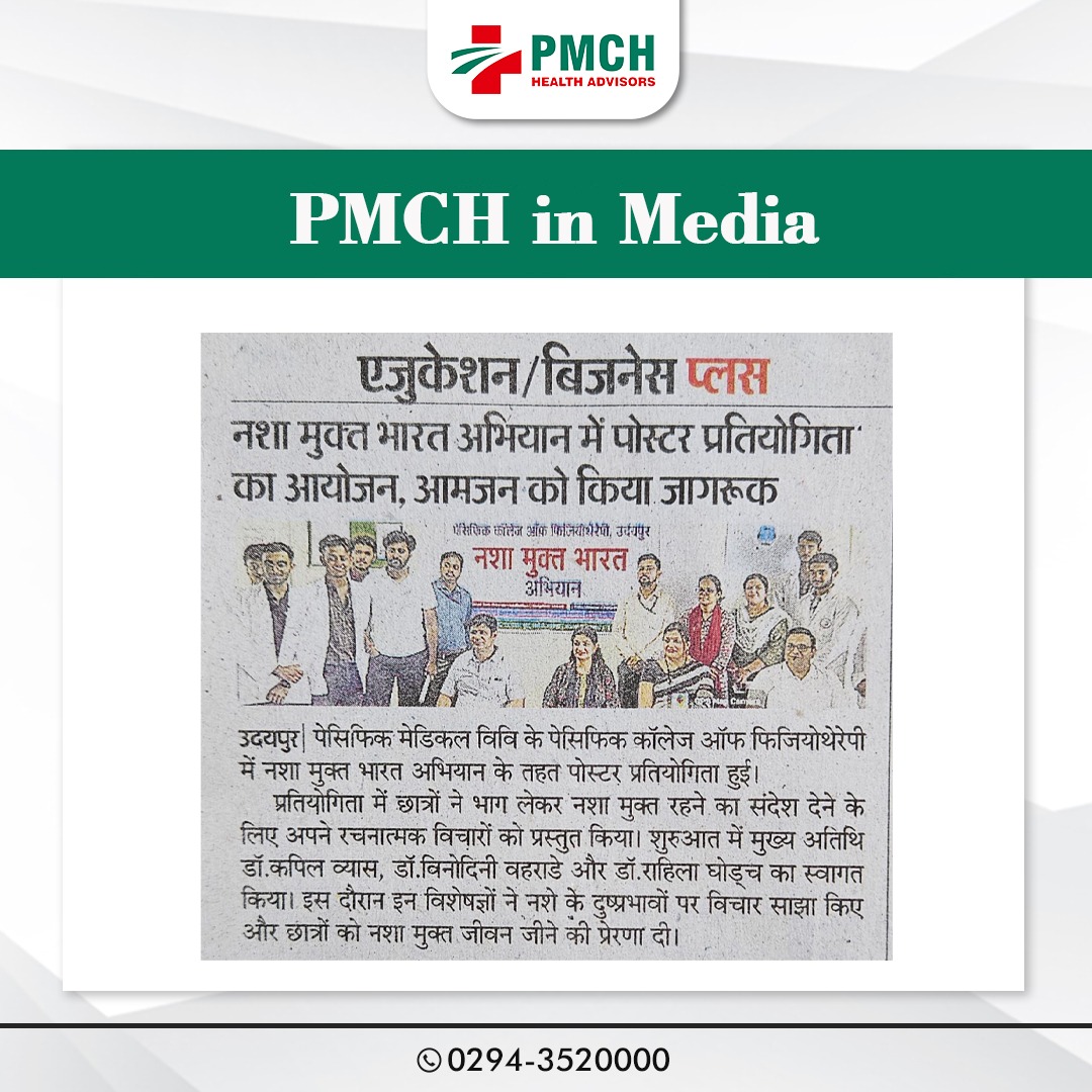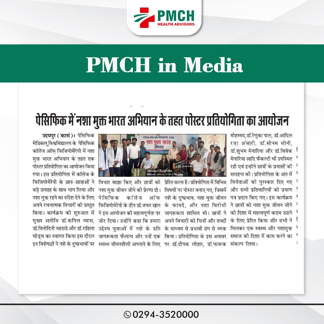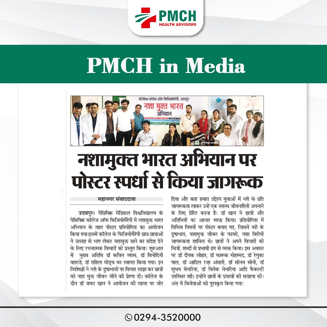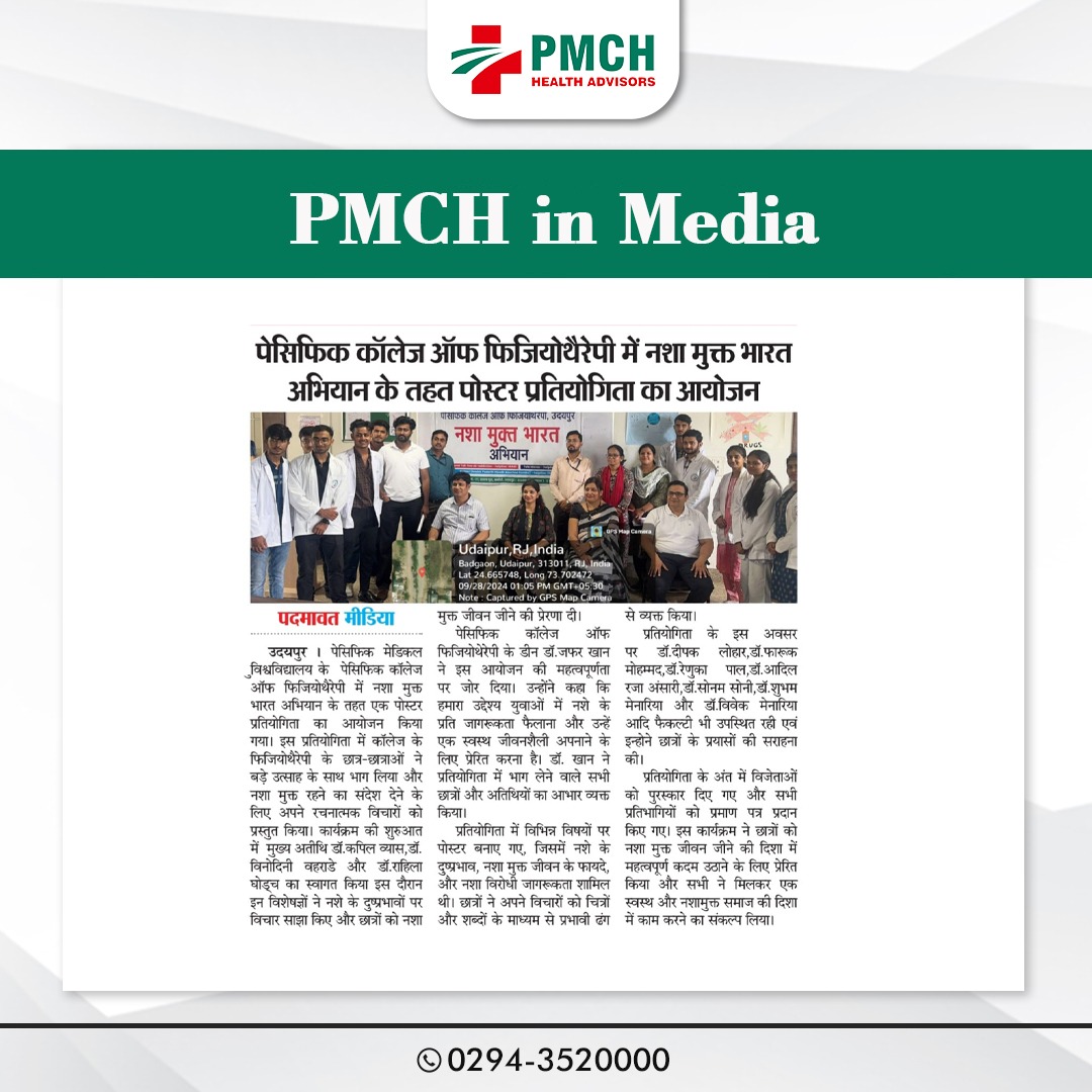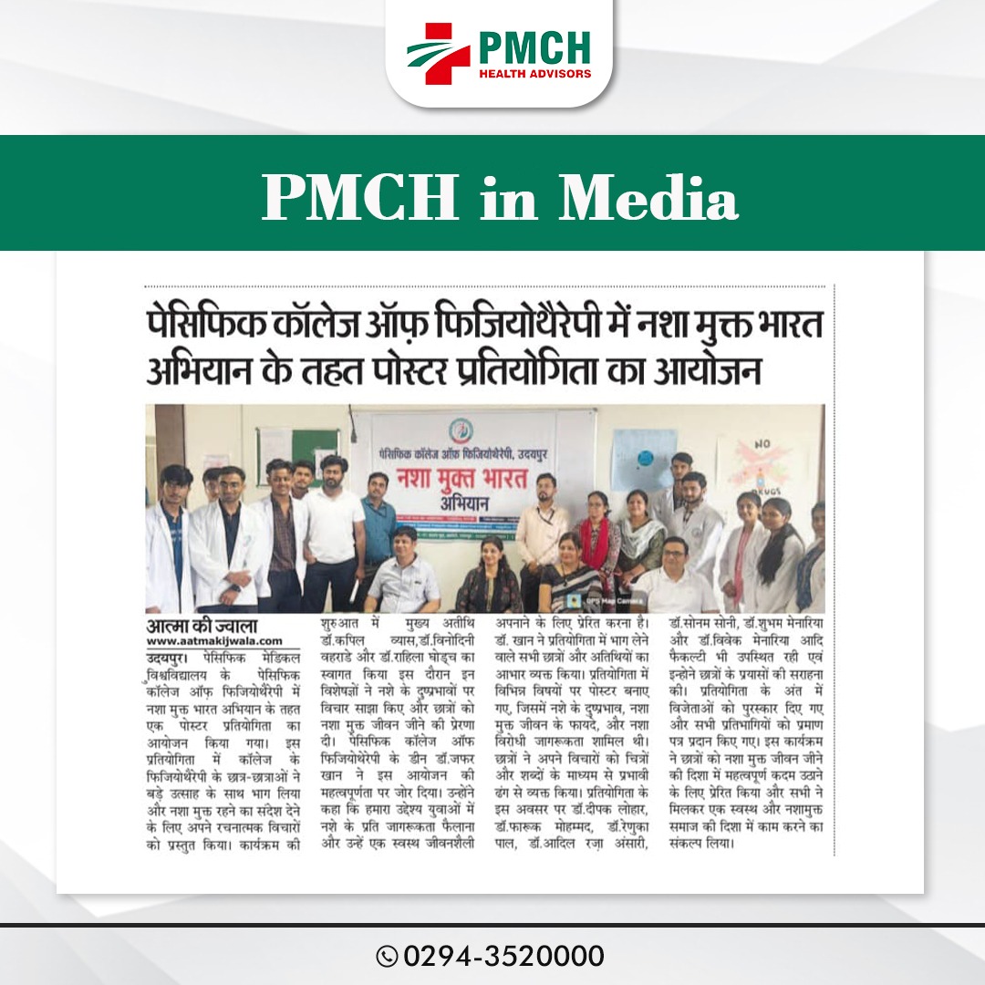 पेसिफिक कॉलेज ऑफ फिजियोथेरेपी में नशा मुक्त भारत अभियान के तहत शानदार पोस्टर प्रतियोगिता का आयोजन किया गया! हमारे छात्रों ने अपनी रचनात्मकता और जागरूकता से नशे के खिलाफ लड़ाई में योगदान दिया है। इस पहल के माध्यम से, हम स्वस्थ और नशा मुक्त समाज के निर्माण के लिए संकल्पित हैं।