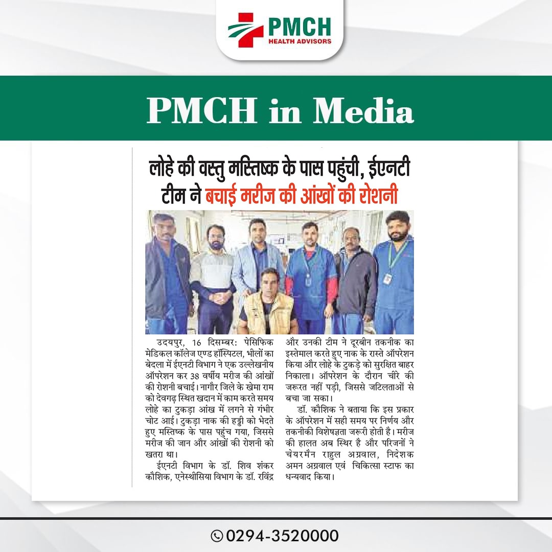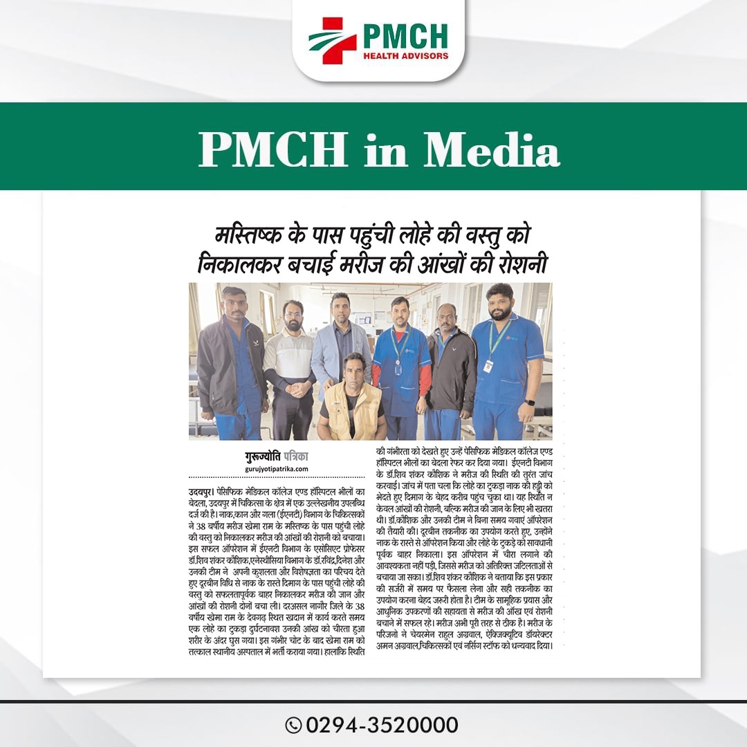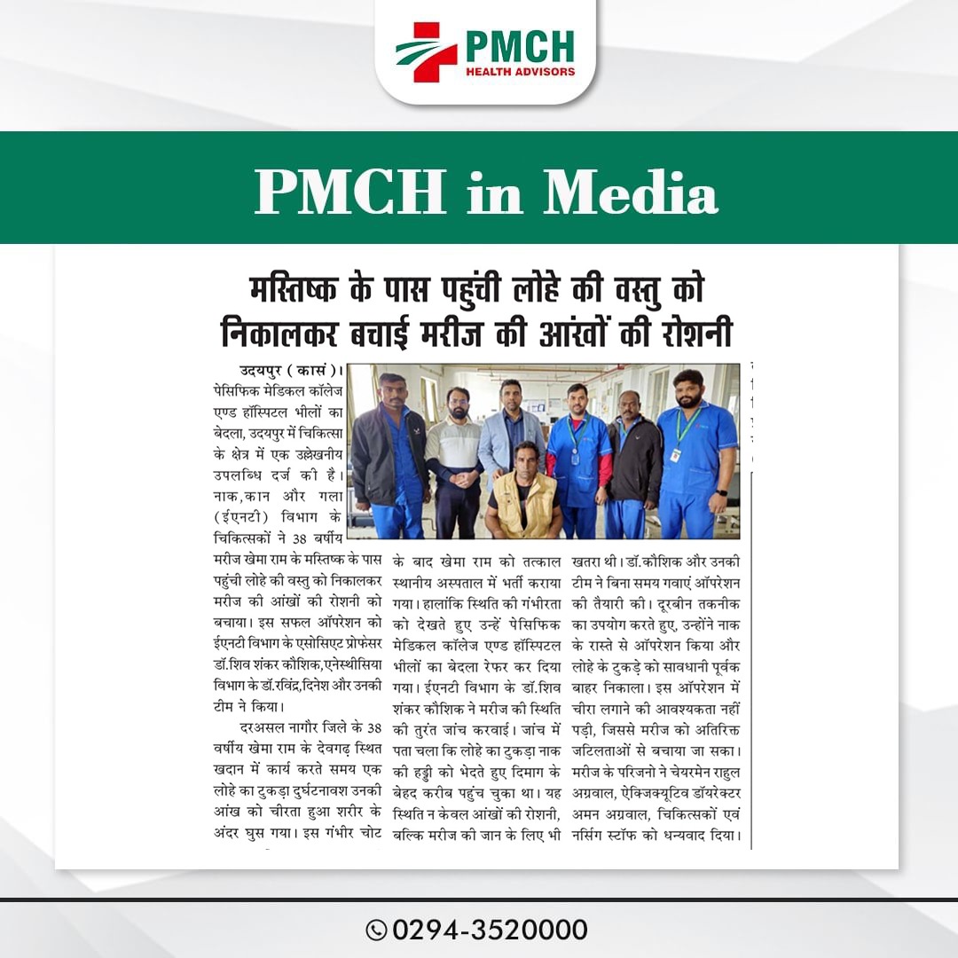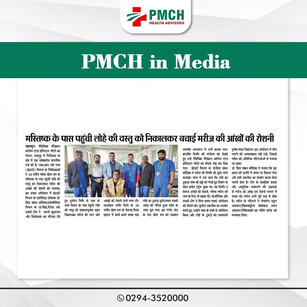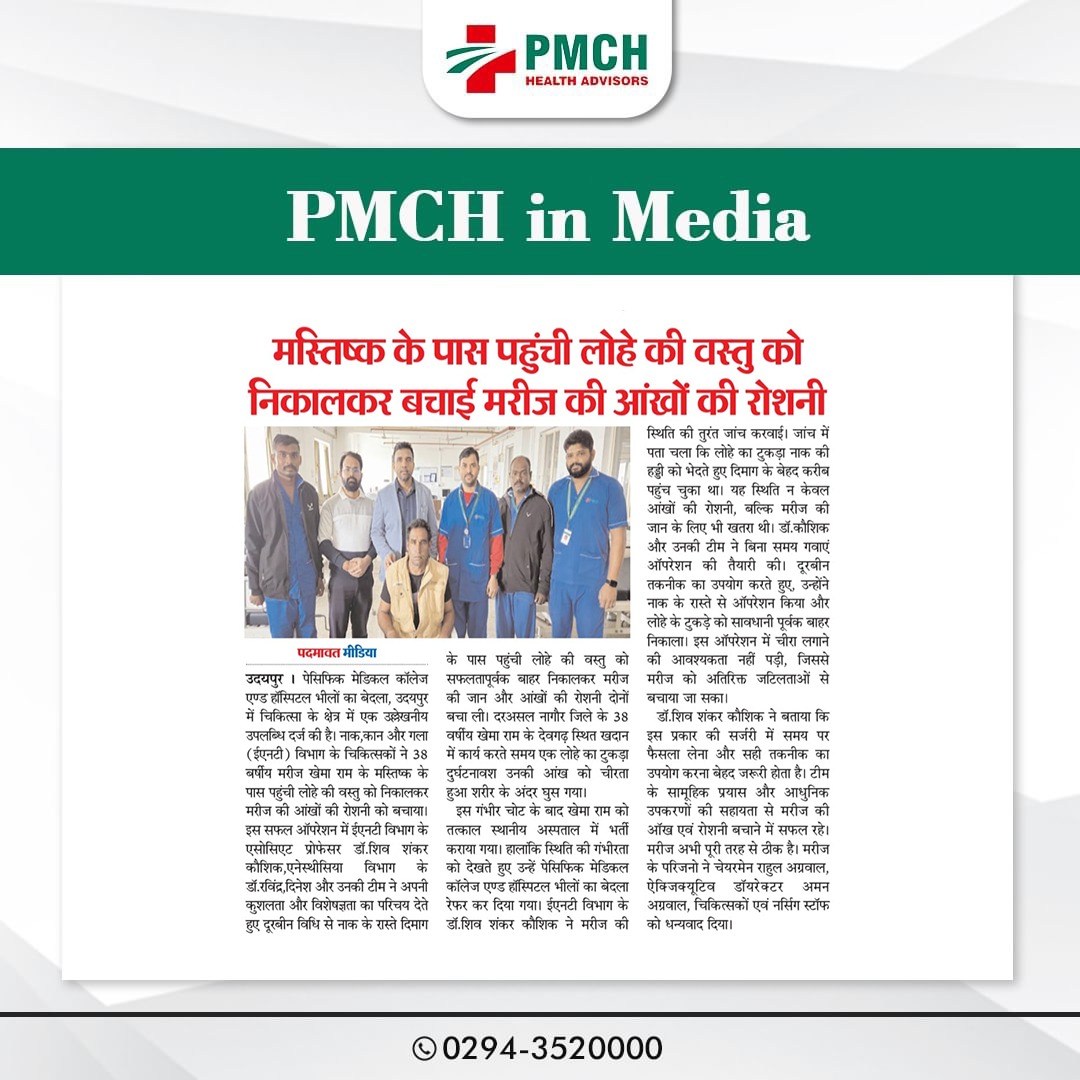 उदयपुर के PMCH अस्पताल में विशेषज्ञ डॉक्टरों की मेहनत और सूझबूझ से 38 वर्षीय मरीज की आंखों की रोशनी बचाई गई। मस्तिष्क के पास पहुंची लोहे की वस्तु को सफल ऑपरेशन के जरिए निकाला गया। यह सफलता हमारे डॉक्टर्स की निपुणता और समर्पण का प्रमाण है। PMCH की टीम को बधाई!