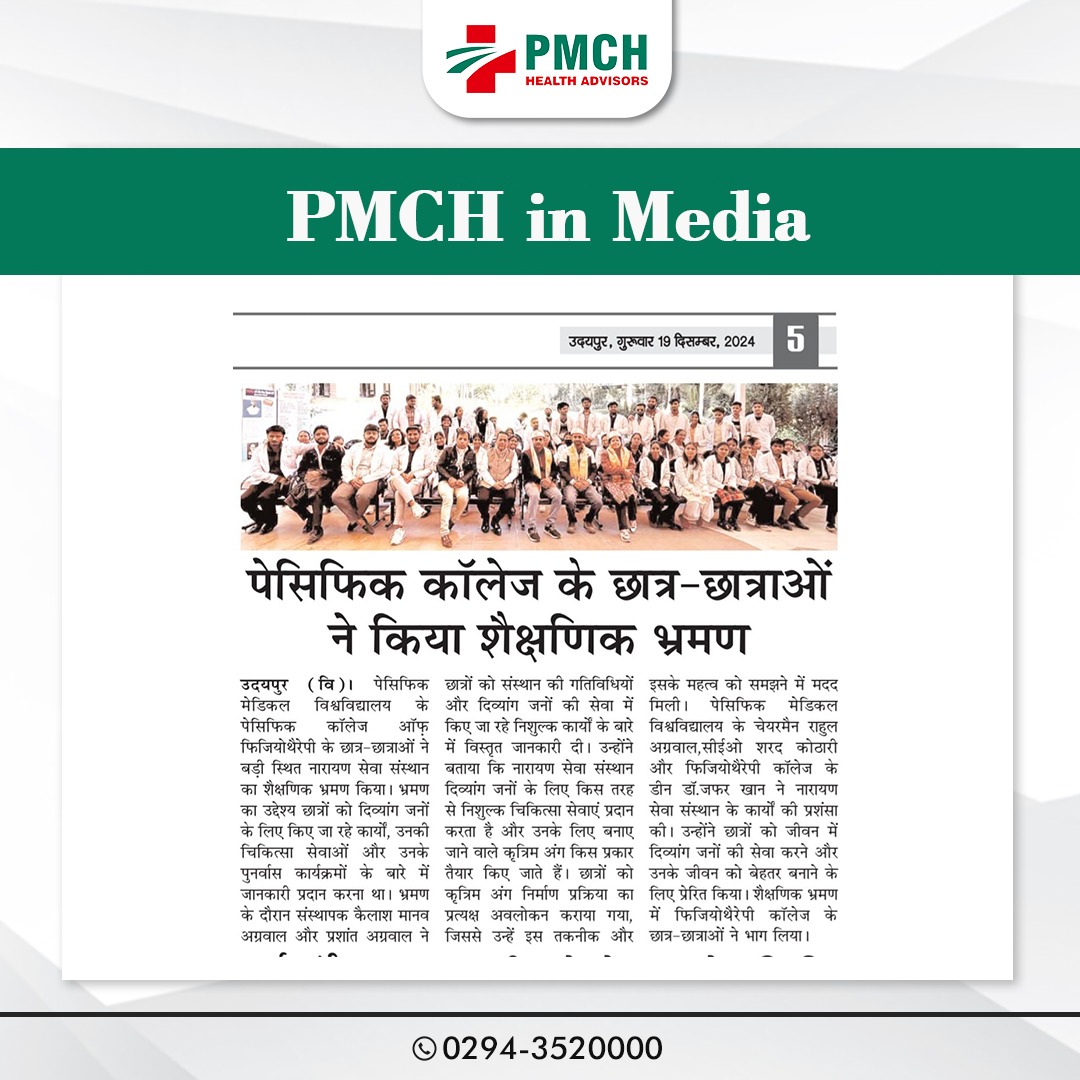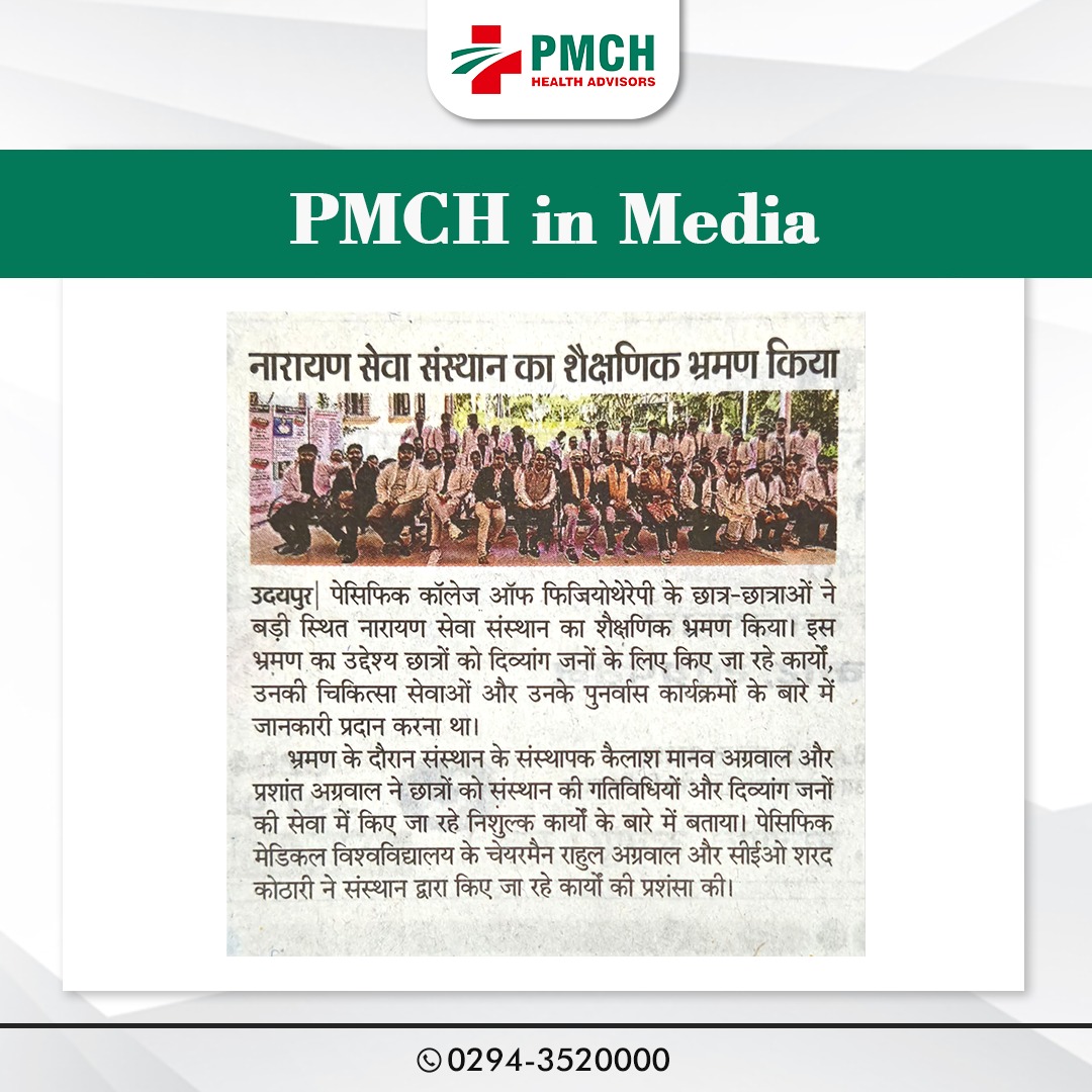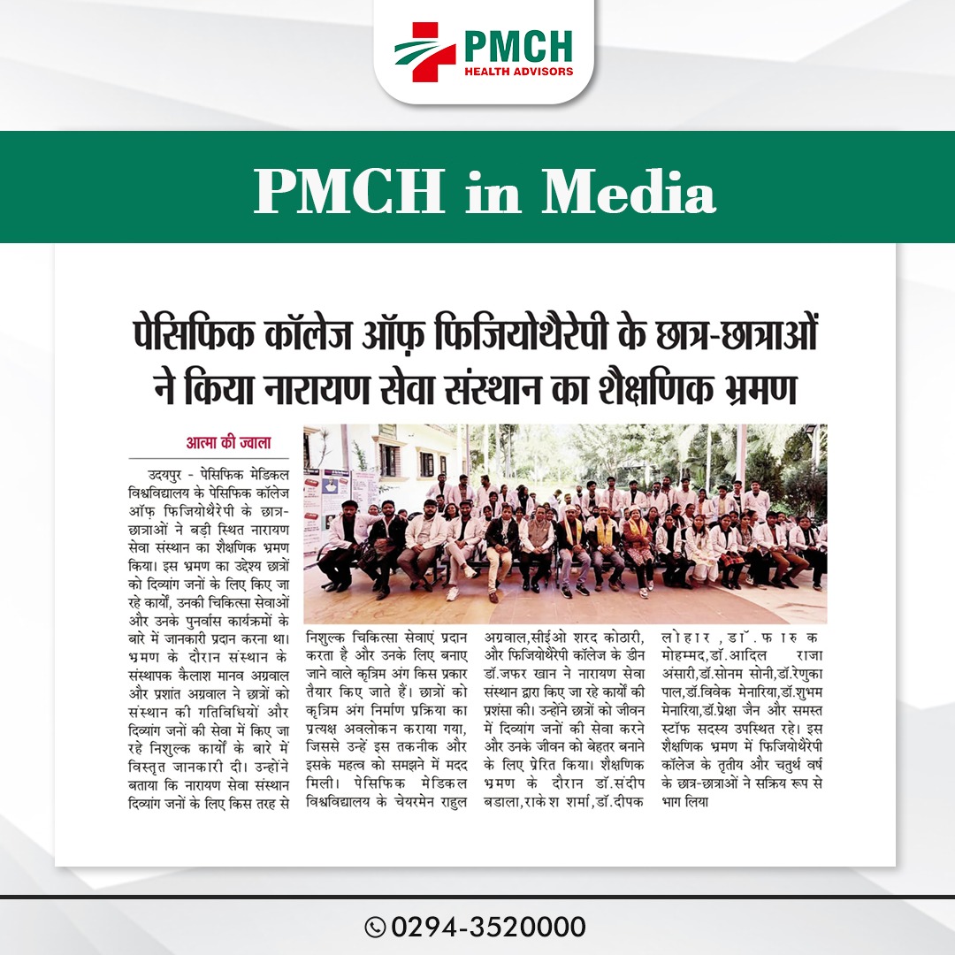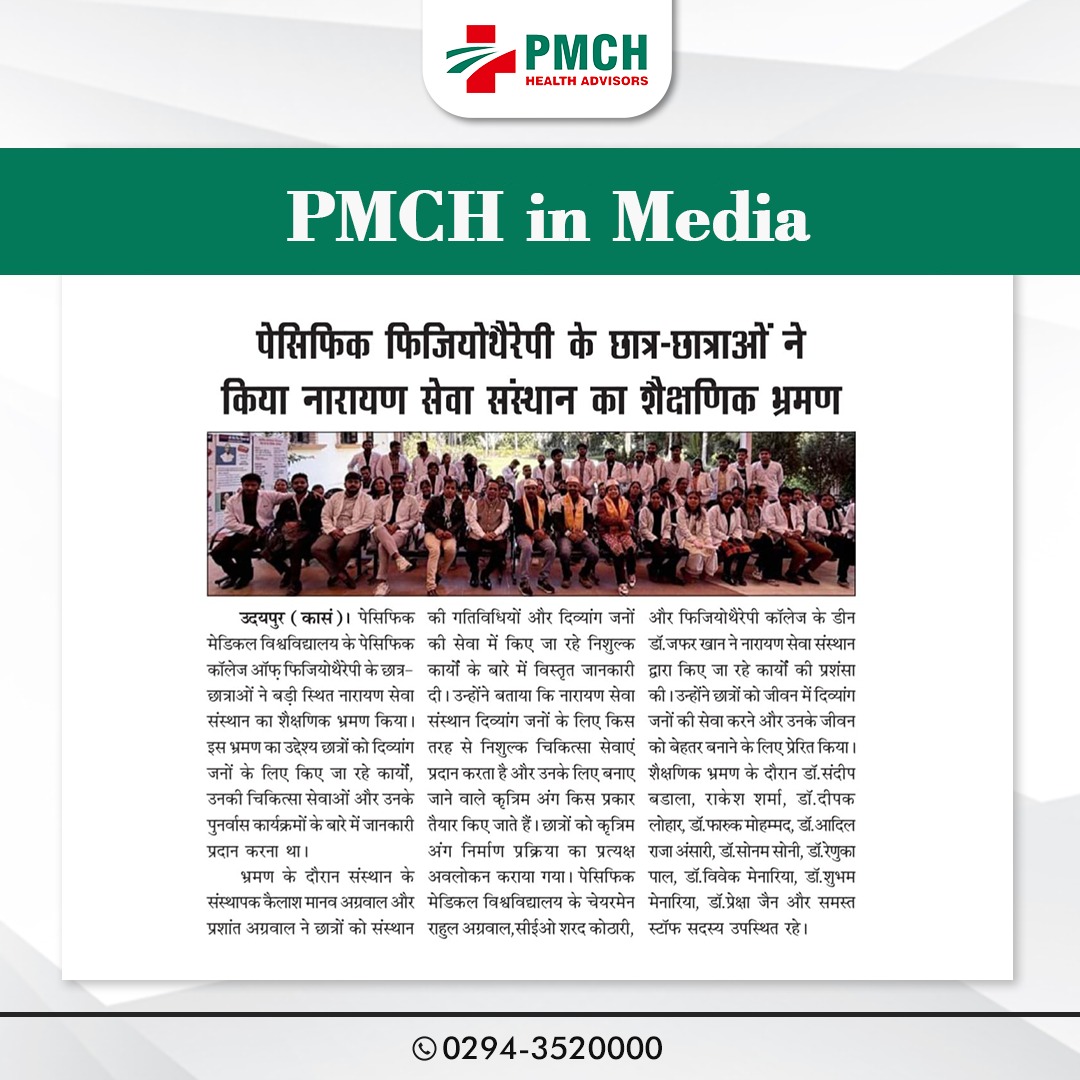 पेसिफिक कॉलेज ऑफ फिजियोथेरेपी के छात्र-छात्राओं ने बड़ी स्थित नारायण सेवा संस्थान का शैक्षणिक भ्रमण किया। इस भ्रमण का उद्देश्य छात्रों को दिव्यांग जनों के लिए किए जा रहे कार्यों, उनकी चिकित्सा सेवाओं और उनके पुनर्वास कार्यक्रमों के बारे में जानकारी प्रदान करना था।